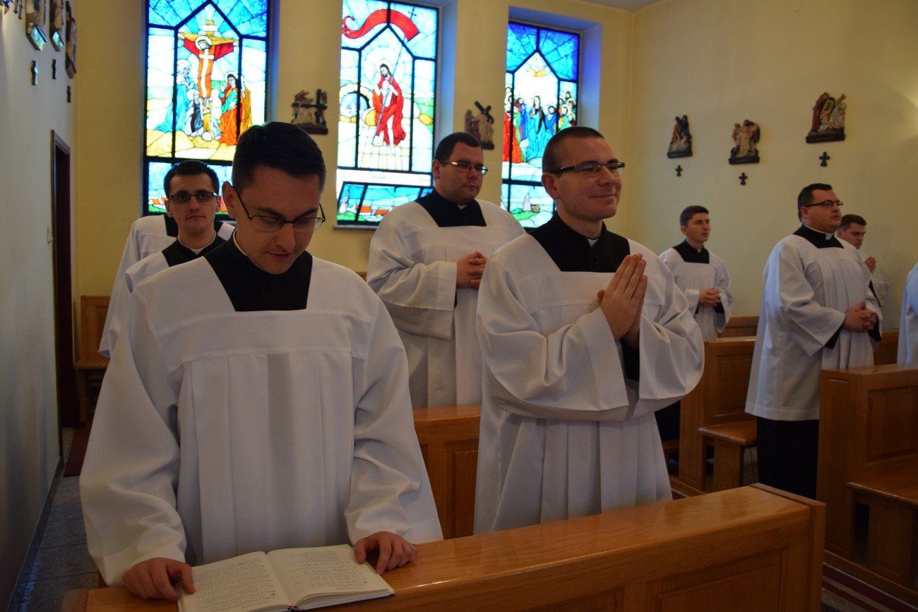 W czasie tego świętego czasu ksiądz Łukasz skupił się na filarach, jakie daje nam Bóg, by mieć z Nim dobry kontakt. W życiu szukamy nowych wrażeń i przeżyć. Bóg daje nam narzędzia, które pomogą nam trwać przy Nim, lecz one się nam nudzą, bo chcemy wciąż czegoś nowego – mówił kapłan. Wśród tych filarów ojciec duchowny wymienił modlitwę brewiarzową, rozważanie słowa Bożego, Eucharystię, celibat oraz pokorę. Przy każdej z konferencji te filary zostały krótko scharakteryzowane. W każdej z godzin brewiarzowych jest choćby jedno słowo, które jest skierowane bezpośrednio do ciebie (…). Prawda jest bardzo bolesna, ale szybko się goi. Kłamstwo natomiast na początku nie boli, ale później staje się raną, która nie chce się zagoić – mówił ksiądz Łukasz podczas piątkowej jutrzni. W odniesieniu do rozważania słowa Bożego mogliśmy usłyszeć: Filtrujemy to, czego słuchamy. Podobnie jest ze Słowem Bożym. Wybieramy tylko to, co chcemy, przez co możemy nie spotkać kochającego nas Ojca (…). Jeżeli Pan mi nic nie mówi, to znaczy, że Go jeszcze nie słucham (…). Jedynym naszym wysiłkiem ma być chęć słuchania Pana (…). Słowo Boże trzeba rozważać w kontekście całego swojego życia. Nie musi się ono odnosić tylko do obecnej chwili, ale może też dotyczyć przyszłości (…). Zaufanie jest wymiarem uwierzenia na słowo. Jesteśmy nieufni. Nie wierzymy słowom i żądamy dowodów, a gdy już je mamy to i tak poddajemy je wątpliwości. Mówiąc o celibacie, ojciec Łukasz wskazał nam trzy jego sensy, które podał papież Paweł VI. Jest to sens chrystocentryczny – na wzór Chrystusa, sens eklezjologiczny – oddanie życia Jezusowi i Kościołowi oraz sens eschatologiczny – po zmartwychwstaniu nie będą się żenić…, na ziemi żyjemy tak, jak będziemy żyć w niebie. Człowiek winny nie patrzy w oczy, ale w dół. Dlatego Chrystus zniża się, bo chce spojrzeć w nasze oczy (…). Jest tylko jedno miejsce, w którym Jezus patrzy na nas z góry. Jest to krzyż. Dlatego podchodzimy pod krzyż, by móc spojrzeć Jezusowi prosto w oczy – słowa prowadzącego dzień skupienia wypowiedziane w konferencji o pokorze.