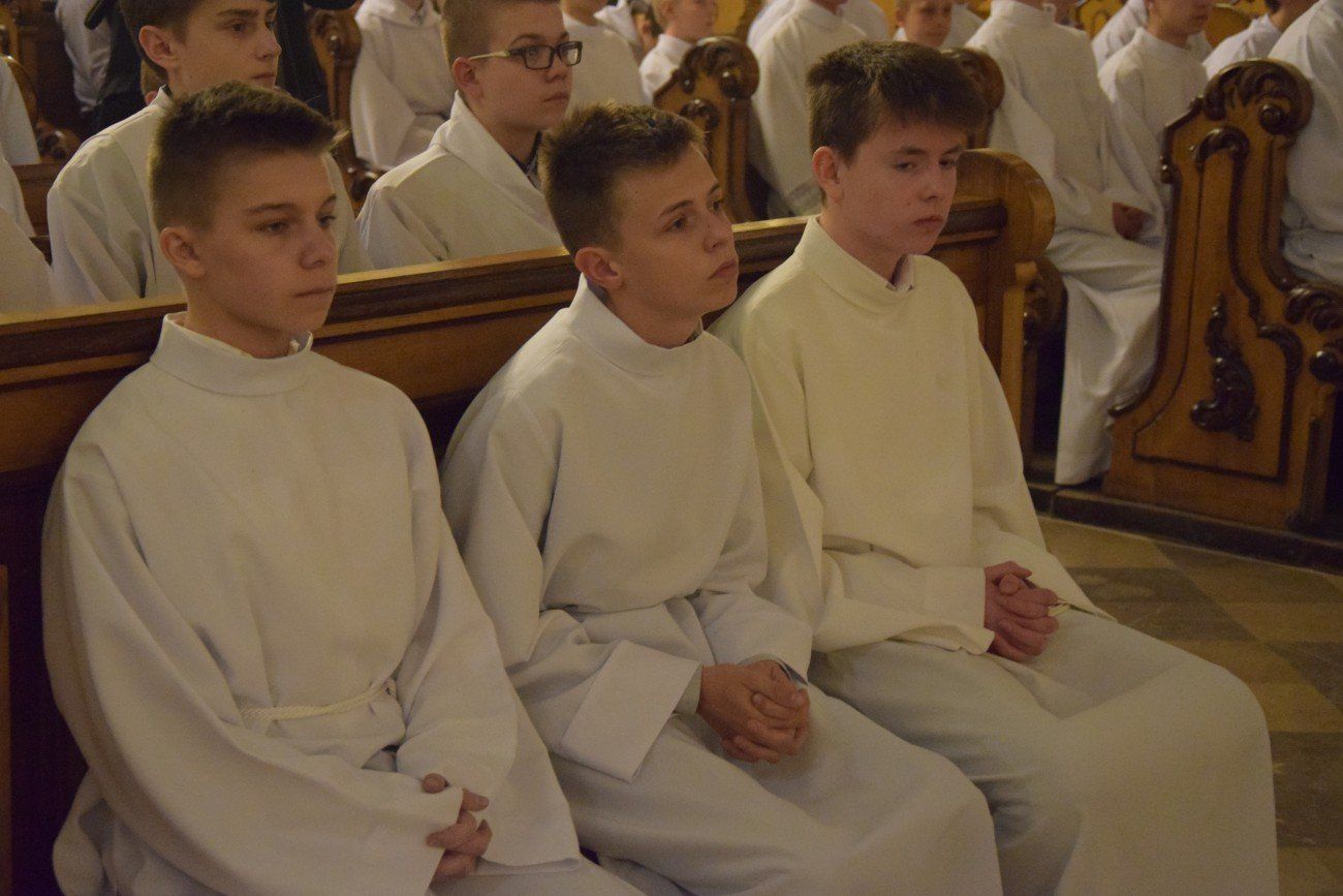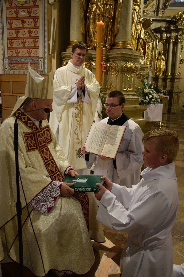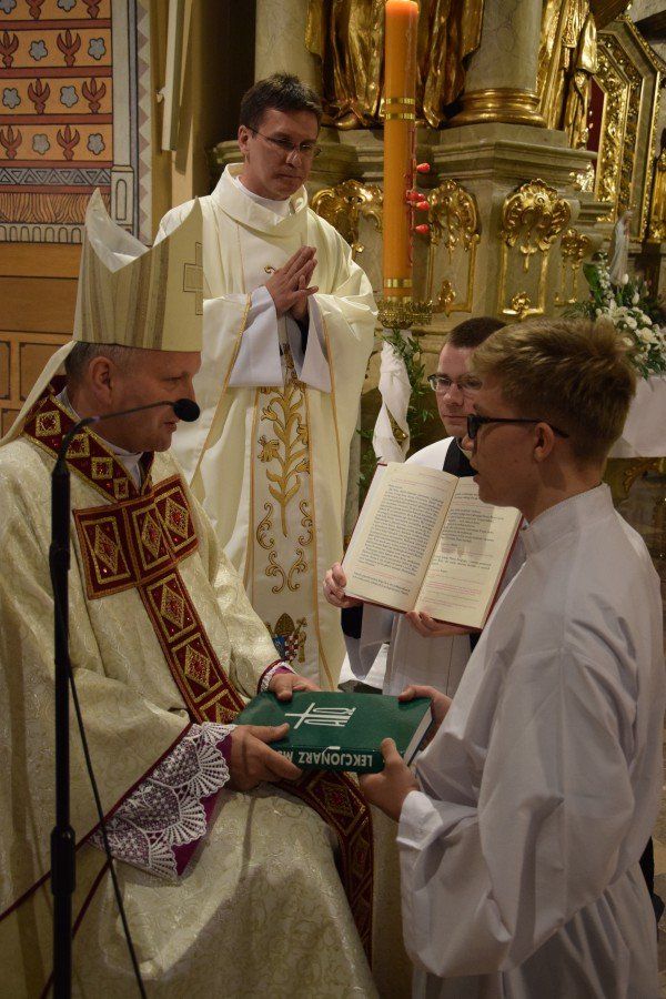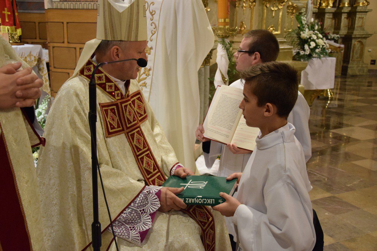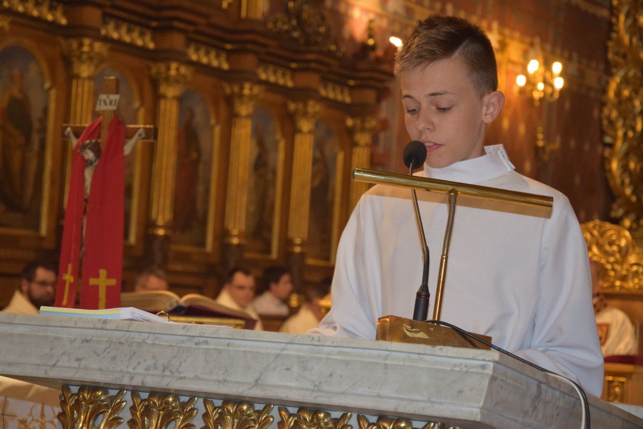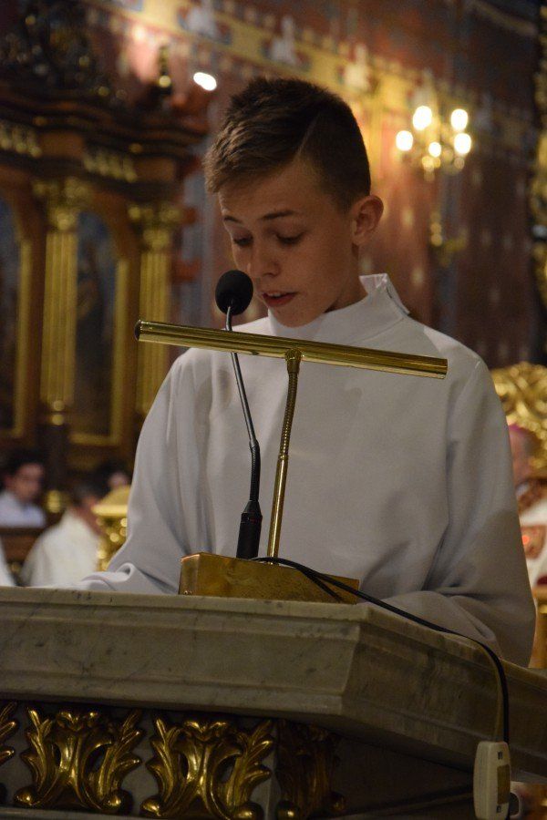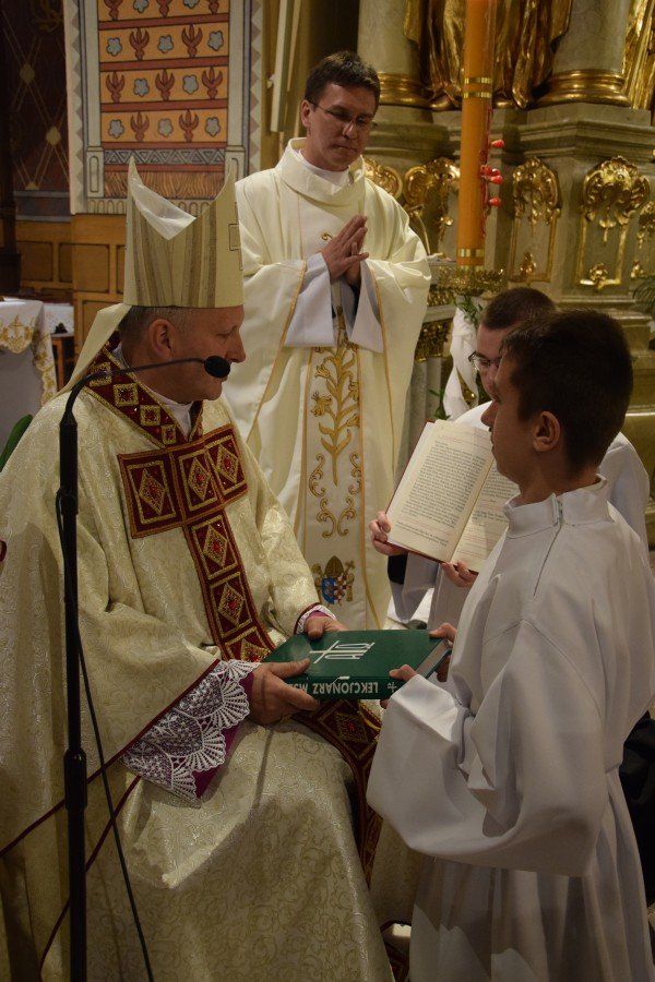 Kulminacją a zarazem podsumowaniem całego kursu lektorskiego była uroczysta Eucharystia w Katedrze Kaliskiej, którą sprawowali księża proboszczowie i wikariusze ministrantów oraz kapłani prowadzący kurs pod przewodnictwem księdza Biskupa Łukasza Buzuna – biskupa pomocniczego naszej diecezji w niedzielne popołudnie, 22 kwietnia. W Eucharystii uczestniczyli rodzice oraz najbliższe rodziny ministrantów, którzy zostali ustanowieni lektorami. Po homilii nastąpiło imienne przedstawienie księdzu Biskupowi kandydatów do przyjęcia posługi lektora oraz parafii, z których pochodzą. Po homilii ksiądz Biskup odmówił modlitwę ustanawiającą lektorów. Następnie ksiądz Biskup wręczył każdemu z ministrantów księgę Pisma Świętego, wypowiadając słowa Przyjmij księgę Pisma Świętego i wiernie przekazuj Słowo Boże, aby coraz mocniej działało w sercach ludzkich. Ksiądz Biskup Łukasz Buzun dokonał także poświęcenia alb i krzyży lektorskich, którymi od tego dnia będą posługiwać się nowo ustanowieni lektorzy. Na zakończenie Eucharystii nowi lektorzy złożyli podziękowania Panu Bogu, księdzu Biskupowi Łukaszowi, kapłanom prowadzącym kurs, proboszczowi Katedry oraz swoim rodzicom, którzy przybyli do Katedry, aby towarzyszyć swoim synom w tym ważnym dla nich dniu.