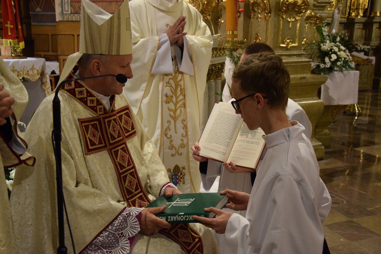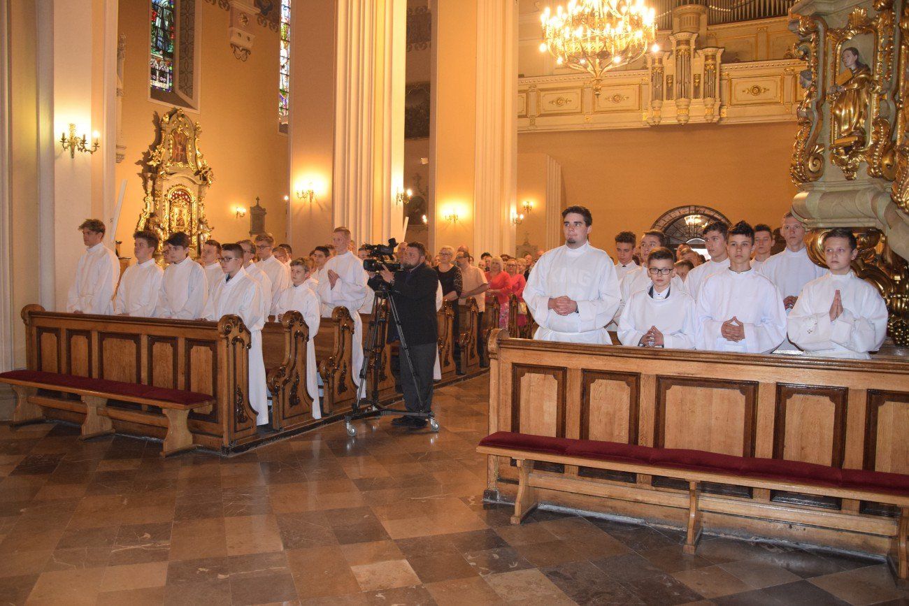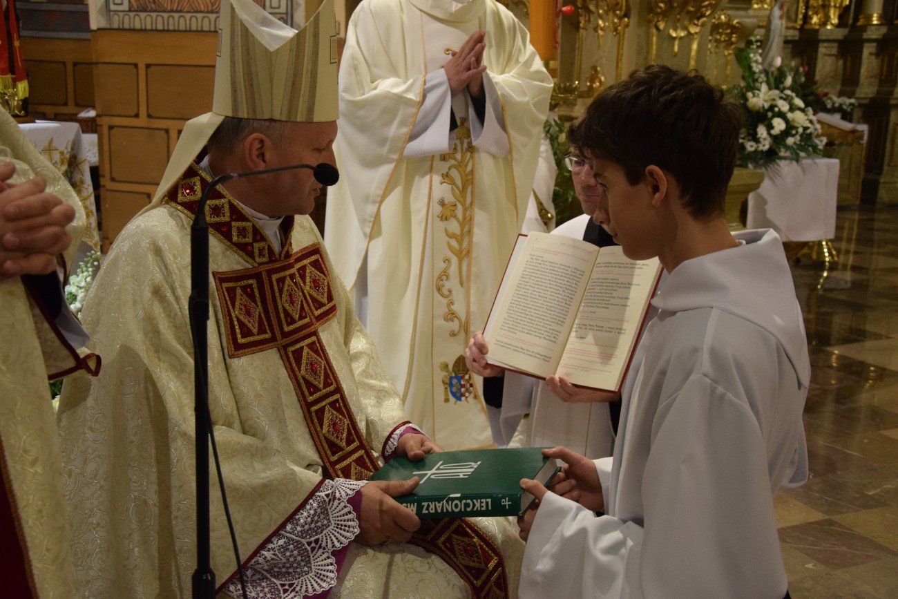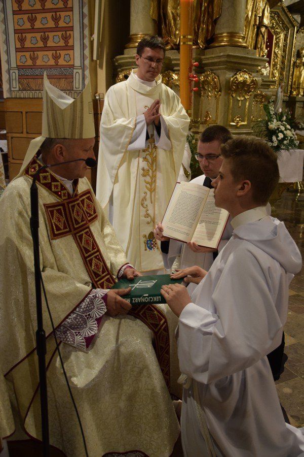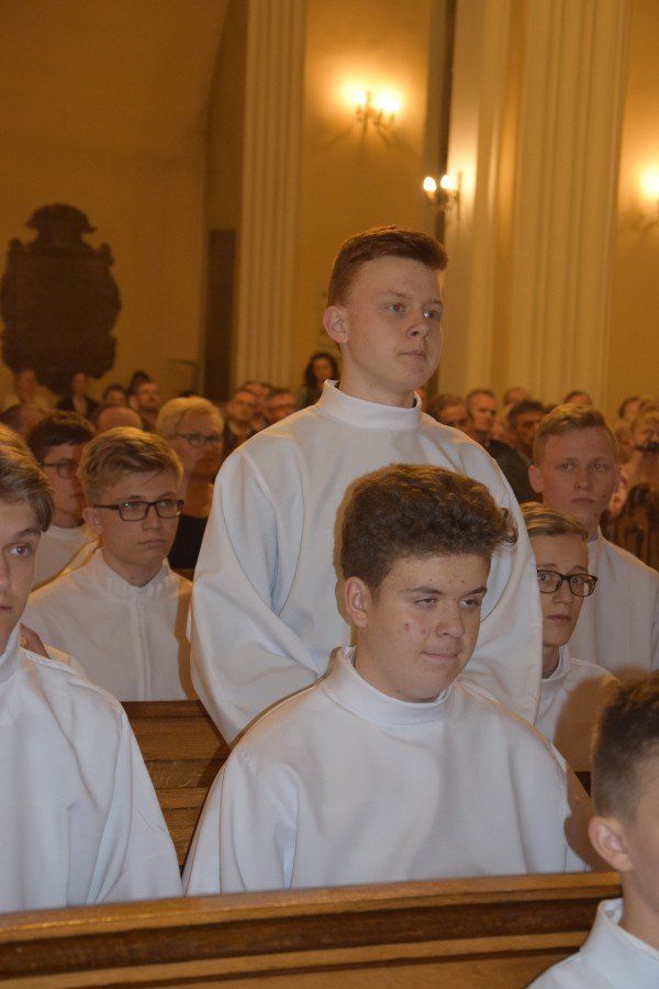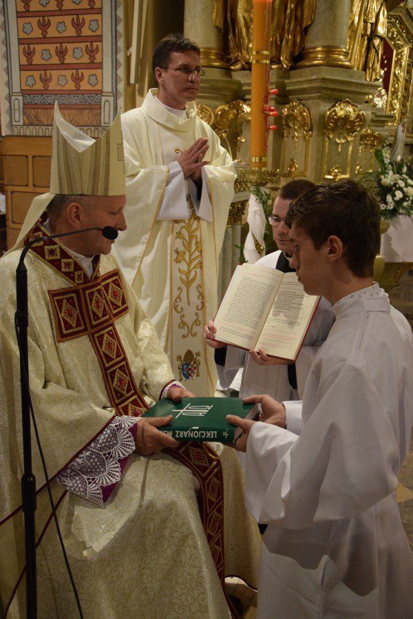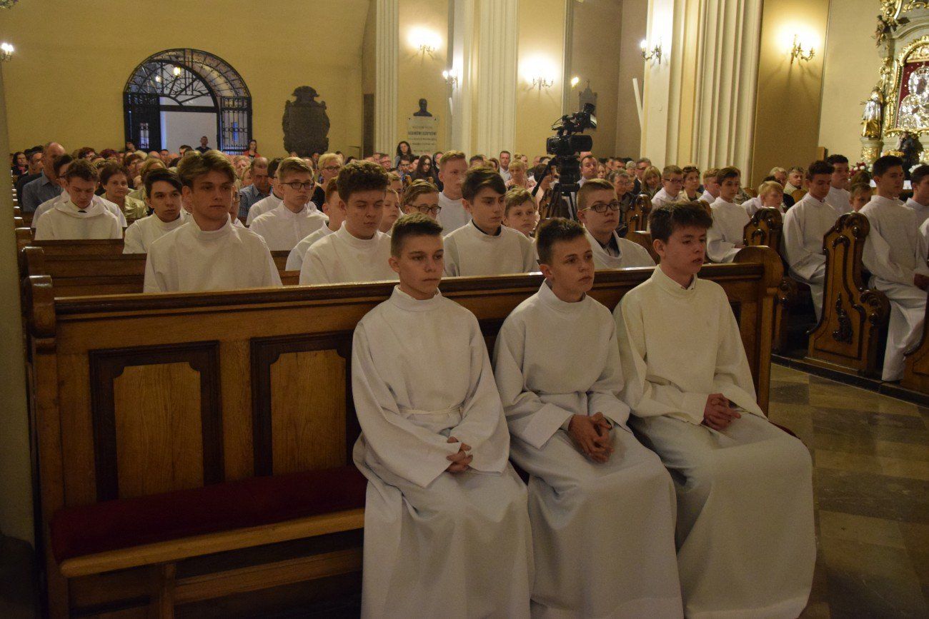 Kulminacją a zarazem podsumowaniem całego kursu lektorskiego była uroczysta Eucharystia w Katedrze Kaliskiej, którą sprawowali księża proboszczowie i wikariusze ministrantów oraz kapłani prowadzący kurs pod przewodnictwem księdza Biskupa Łukasza Buzuna – biskupa pomocniczego naszej diecezji w niedzielne popołudnie, 22 kwietnia. W Eucharystii uczestniczyli rodzice oraz najbliższe rodziny ministrantów, którzy zostali ustanowieni lektorami. Po homilii nastąpiło imienne przedstawienie księdzu Biskupowi kandydatów do przyjęcia posługi lektora oraz parafii, z których pochodzą. Po homilii ksiądz Biskup odmówił modlitwę ustanawiającą lektorów. Następnie ksiądz Biskup wręczył każdemu z ministrantów księgę Pisma Świętego, wypowiadając słowa Przyjmij księgę Pisma Świętego i wiernie przekazuj Słowo Boże, aby coraz mocniej działało w sercach ludzkich. Ksiądz Biskup Łukasz Buzun dokonał także poświęcenia alb i krzyży lektorskich, którymi od tego dnia będą posługiwać się nowo ustanowieni lektorzy. Na zakończenie Eucharystii nowi lektorzy złożyli podziękowania Panu Bogu, księdzu Biskupowi Łukaszowi, kapłanom prowadzącym kurs, proboszczowi Katedry oraz swoim rodzicom, którzy przybyli do Katedry, aby towarzyszyć swoim synom w tym ważnym dla nich dniu.