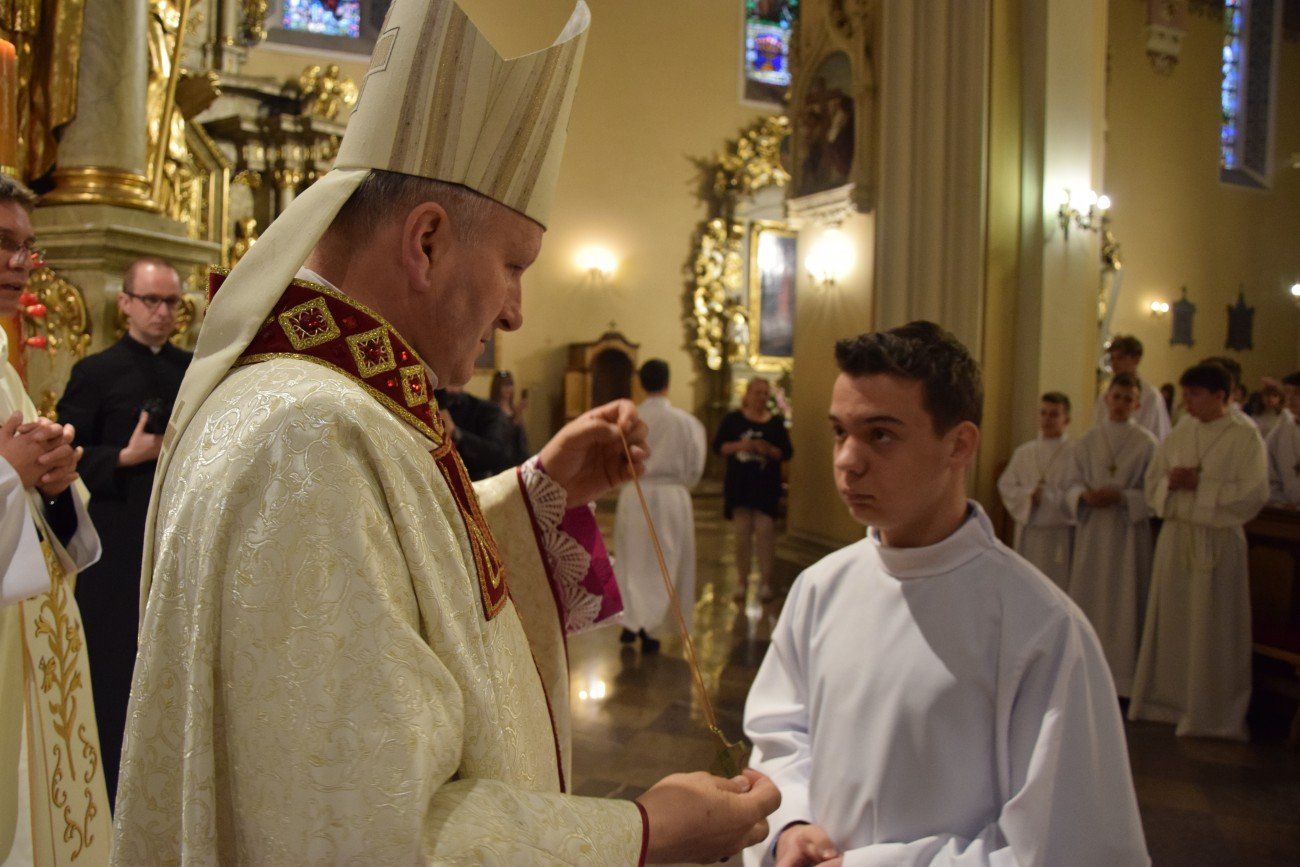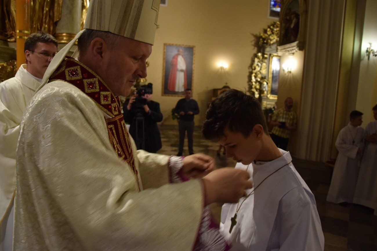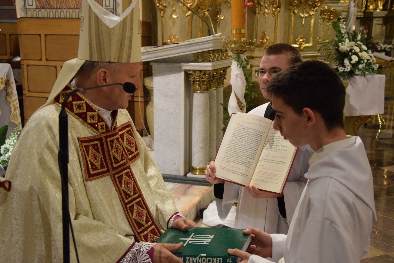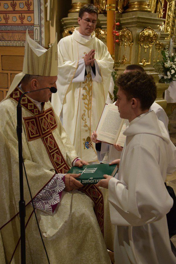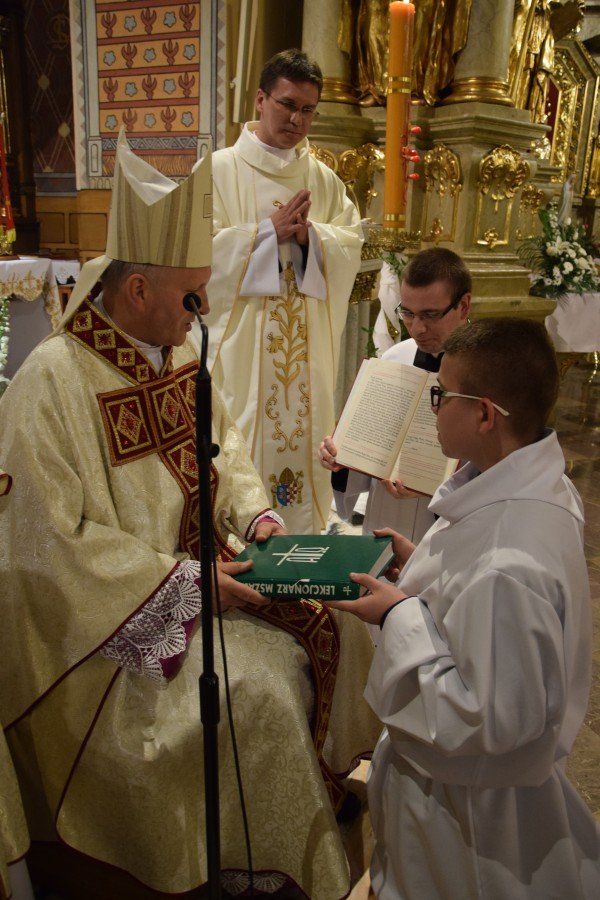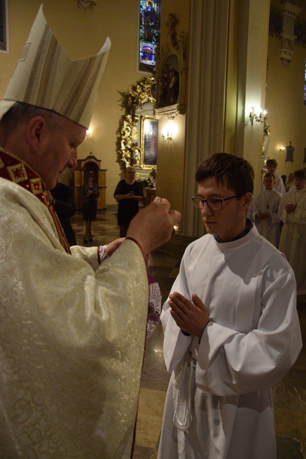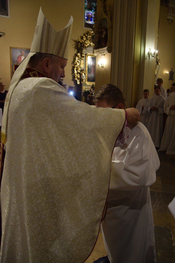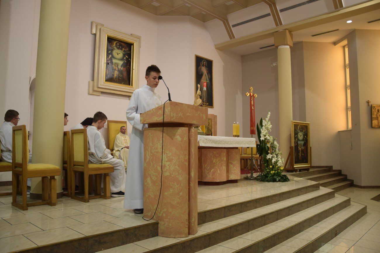Kulminacją a zarazem podsumowaniem całego kursu lektorskiego była uroczysta Eucharystia w Katedrze Kaliskiej, którą sprawowali księża proboszczowie i wikariusze ministrantów oraz kapłani prowadzący kurs pod przewodnictwem księdza Biskupa Łukasza Buzuna – biskupa pomocniczego naszej diecezji w niedzielne popołudnie, 22 kwietnia. W Eucharystii uczestniczyli rodzice oraz najbliższe rodziny ministrantów, którzy zostali ustanowieni lektorami. Po homilii nastąpiło imienne przedstawienie księdzu Biskupowi kandydatów do przyjęcia posługi lektora oraz parafii, z których pochodzą. Po homilii ksiądz Biskup odmówił modlitwę ustanawiającą lektorów. Następnie ksiądz Biskup wręczył każdemu z ministrantów księgę Pisma Świętego, wypowiadając słowa Przyjmij księgę Pisma Świętego i wiernie przekazuj Słowo Boże, aby coraz mocniej działało w sercach ludzkich. Ksiądz Biskup Łukasz Buzun dokonał także poświęcenia alb i krzyży lektorskich, którymi od tego dnia będą posługiwać się nowo ustanowieni lektorzy. Na zakończenie Eucharystii nowi lektorzy złożyli podziękowania Panu Bogu, księdzu Biskupowi Łukaszowi, kapłanom prowadzącym kurs, proboszczowi Katedry oraz swoim rodzicom, którzy przybyli do Katedry, aby towarzyszyć swoim synom w tym ważnym dla nich dniu.