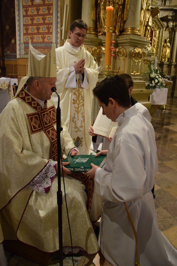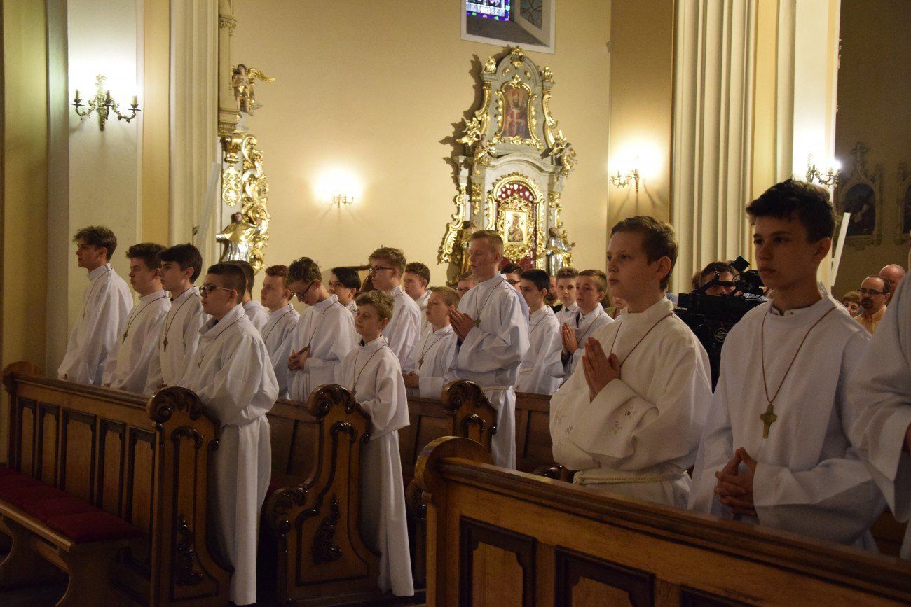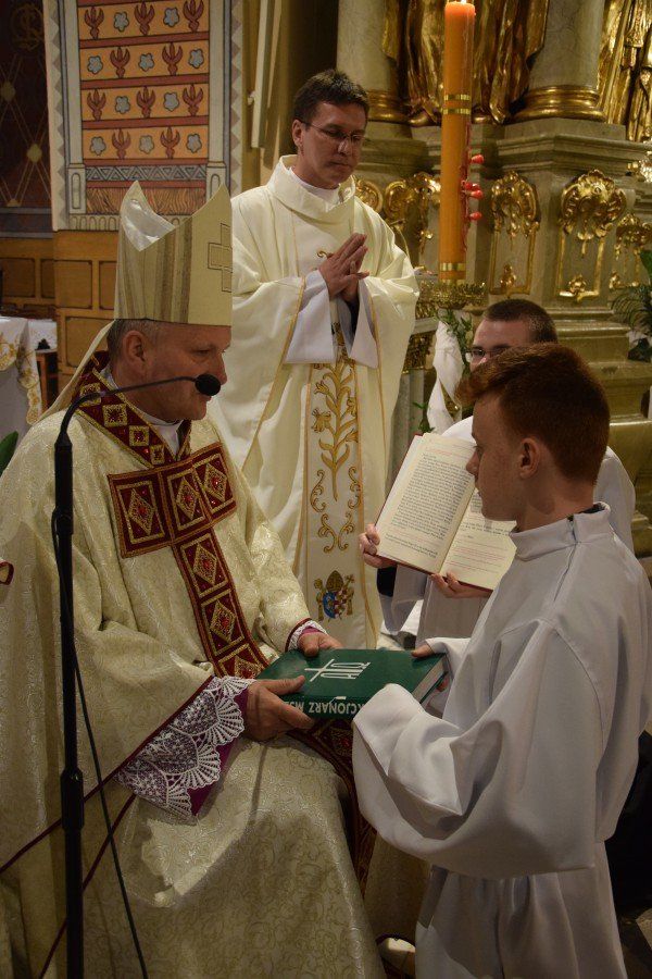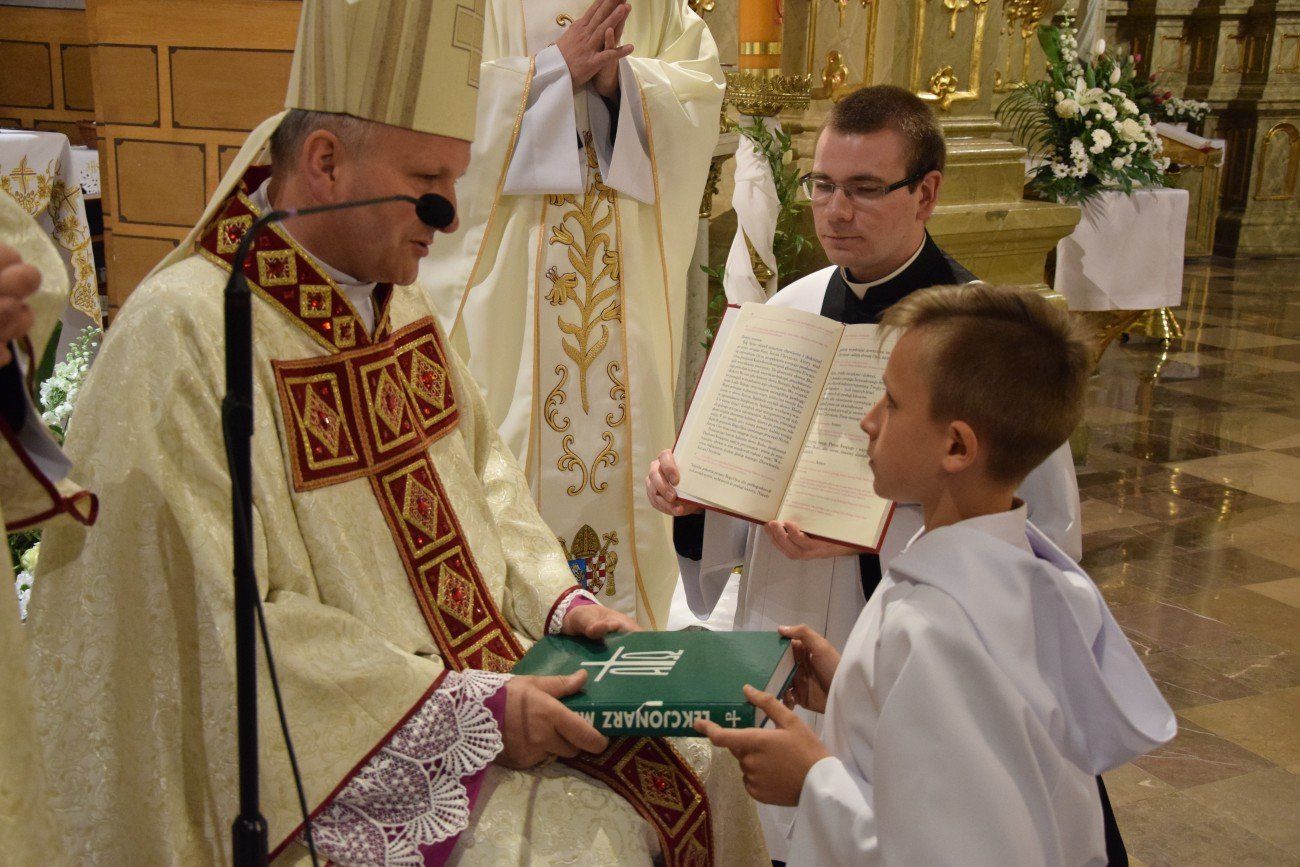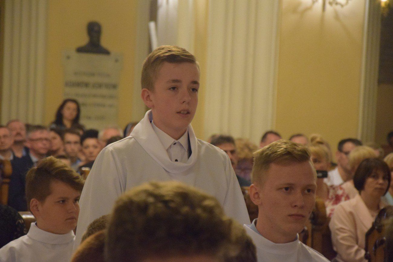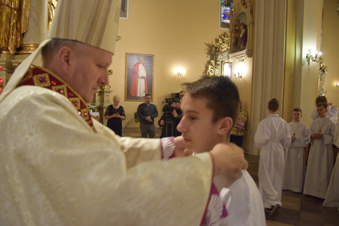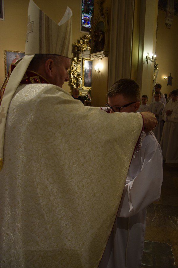 Kulminacją a zarazem podsumowaniem całego kursu lektorskiego była uroczysta Eucharystia w Katedrze Kaliskiej, którą sprawowali księża proboszczowie i wikariusze ministrantów oraz kapłani prowadzący kurs pod przewodnictwem księdza Biskupa Łukasza Buzuna – biskupa pomocniczego naszej diecezji w niedzielne popołudnie, 22 kwietnia. W Eucharystii uczestniczyli rodzice oraz najbliższe rodziny ministrantów, którzy zostali ustanowieni lektorami. Po homilii nastąpiło imienne przedstawienie księdzu Biskupowi kandydatów do przyjęcia posługi lektora oraz parafii, z których pochodzą. Po homilii ksiądz Biskup odmówił modlitwę ustanawiającą lektorów. Następnie ksiądz Biskup wręczył każdemu z ministrantów księgę Pisma Świętego, wypowiadając słowa Przyjmij księgę Pisma Świętego i wiernie przekazuj Słowo Boże, aby coraz mocniej działało w sercach ludzkich. Ksiądz Biskup Łukasz Buzun dokonał także poświęcenia alb i krzyży lektorskich, którymi od tego dnia będą posługiwać się nowo ustanowieni lektorzy. Na zakończenie Eucharystii nowi lektorzy złożyli podziękowania Panu Bogu, księdzu Biskupowi Łukaszowi, kapłanom prowadzącym kurs, proboszczowi Katedry oraz swoim rodzicom, którzy przybyli do Katedry, aby towarzyszyć swoim synom w tym ważnym dla nich dniu.