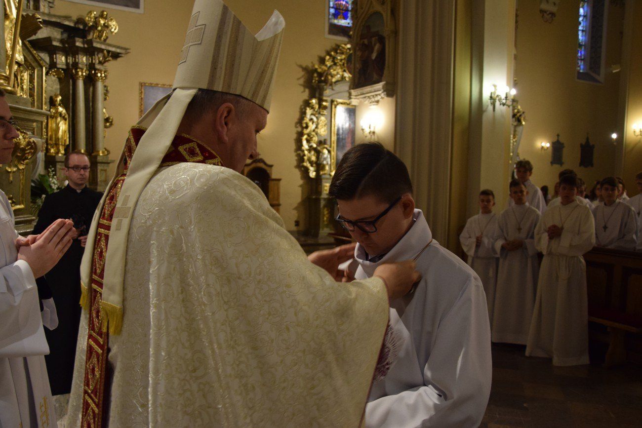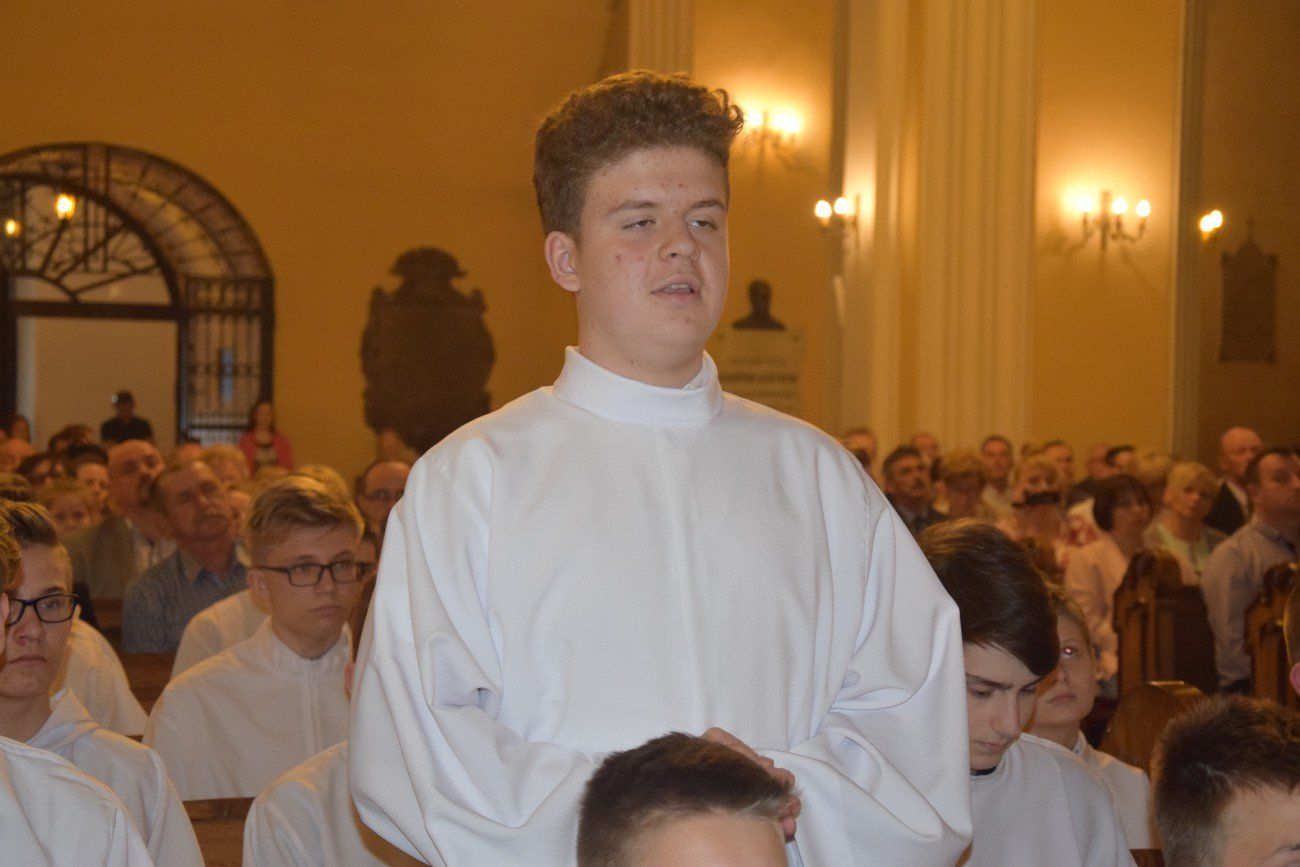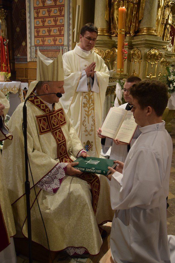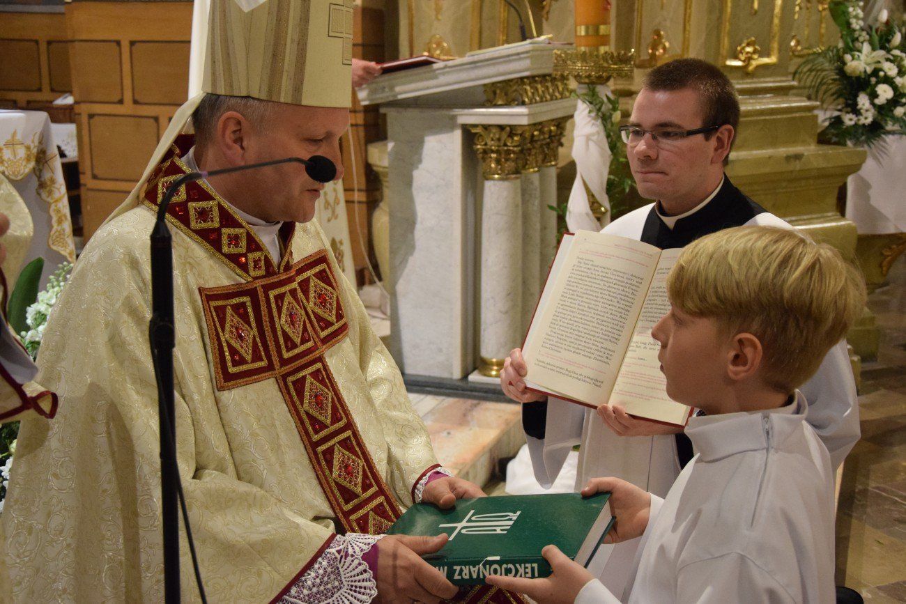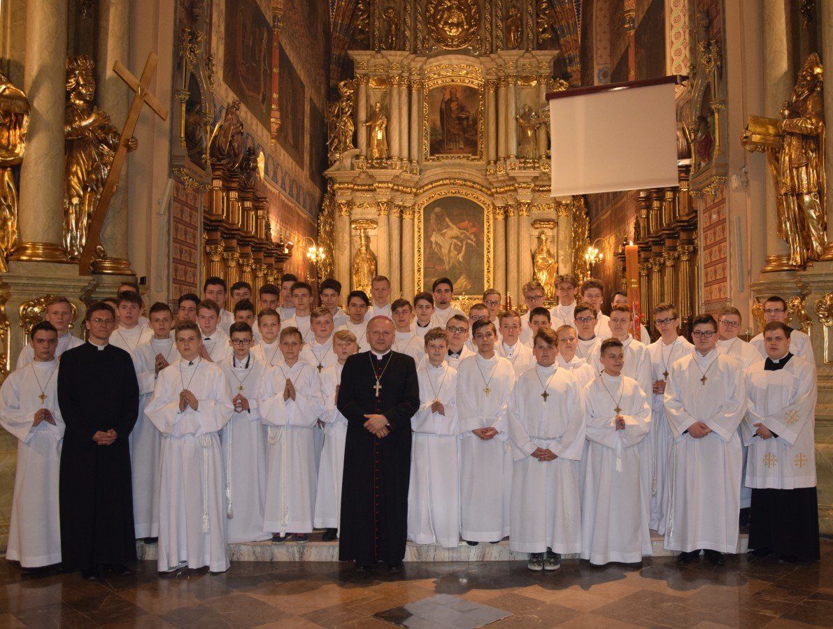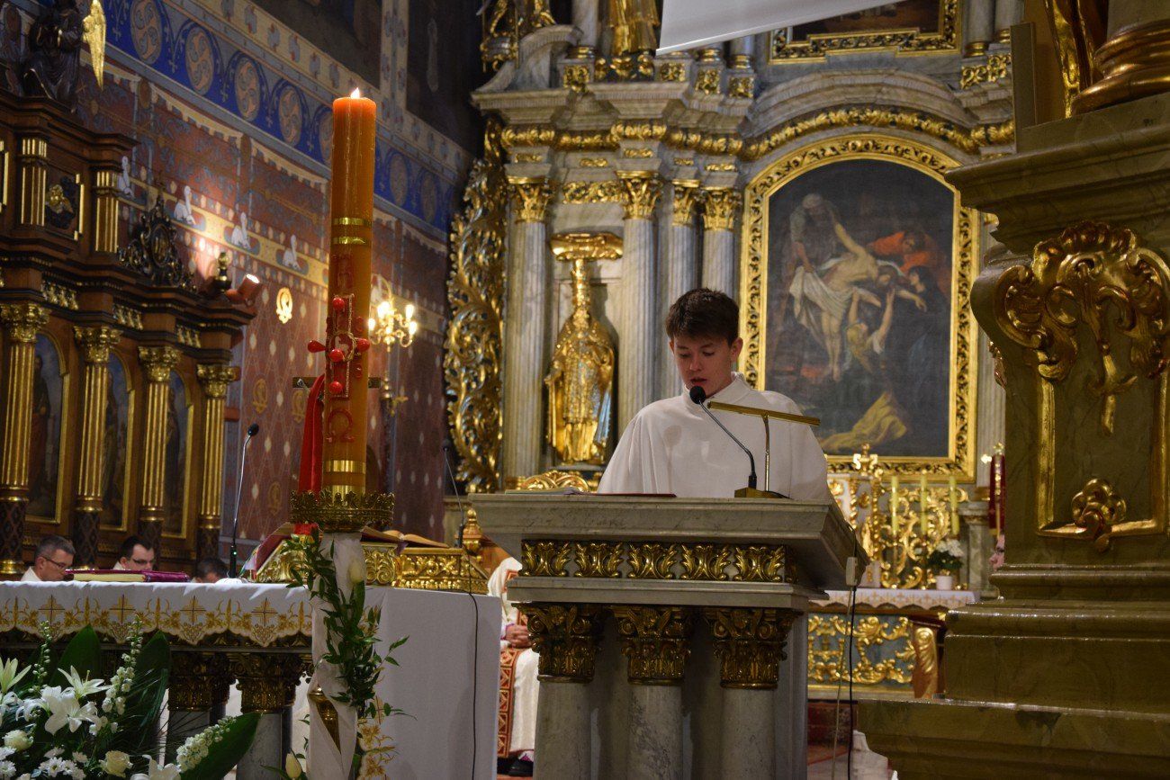Kulminacją a zarazem podsumowaniem całego kursu lektorskiego była uroczysta Eucharystia w Katedrze Kaliskiej, którą sprawowali księża proboszczowie i wikariusze ministrantów oraz kapłani prowadzący kurs pod przewodnictwem księdza Biskupa Łukasza Buzuna – biskupa pomocniczego naszej diecezji w niedzielne popołudnie, 22 kwietnia. W Eucharystii uczestniczyli rodzice oraz najbliższe rodziny ministrantów, którzy zostali ustanowieni lektorami. Po homilii nastąpiło imienne przedstawienie księdzu Biskupowi kandydatów do przyjęcia posługi lektora oraz parafii, z których pochodzą. Po homilii ksiądz Biskup odmówił modlitwę ustanawiającą lektorów. Następnie ksiądz Biskup wręczył każdemu z ministrantów księgę Pisma Świętego, wypowiadając słowa Przyjmij księgę Pisma Świętego i wiernie przekazuj Słowo Boże, aby coraz mocniej działało w sercach ludzkich. Ksiądz Biskup Łukasz Buzun dokonał także poświęcenia alb i krzyży lektorskich, którymi od tego dnia będą posługiwać się nowo ustanowieni lektorzy. Na zakończenie Eucharystii nowi lektorzy złożyli podziękowania Panu Bogu, księdzu Biskupowi Łukaszowi, kapłanom prowadzącym kurs, proboszczowi Katedry oraz swoim rodzicom, którzy przybyli do Katedry, aby towarzyszyć swoim synom w tym ważnym dla nich dniu.