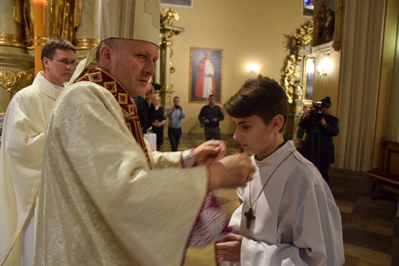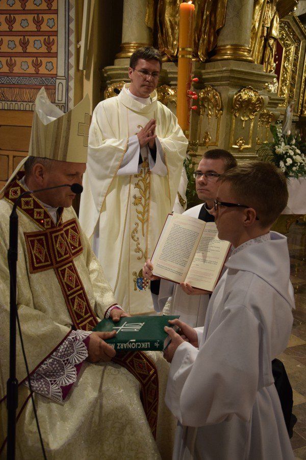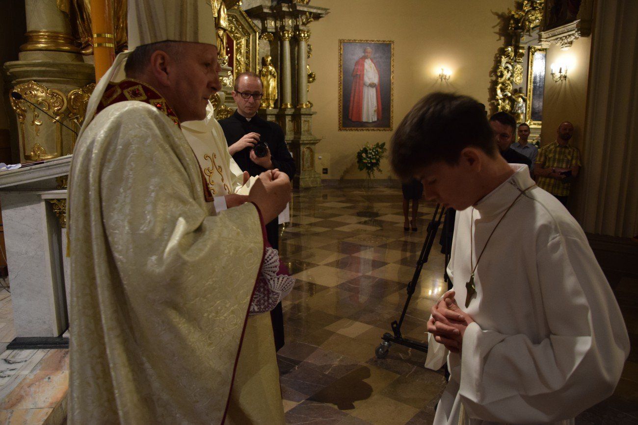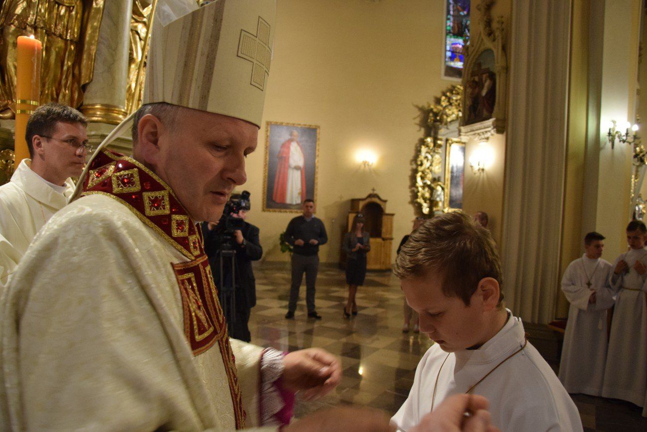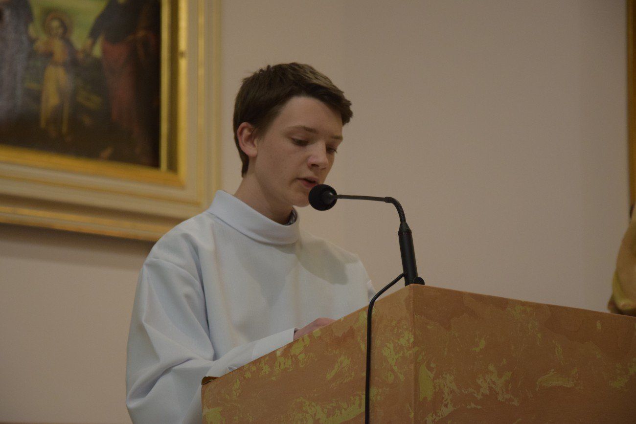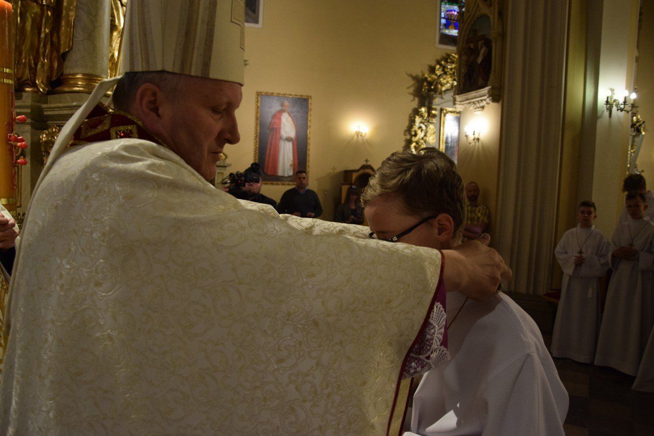 Kulminacją a zarazem podsumowaniem całego kursu lektorskiego była uroczysta Eucharystia w Katedrze Kaliskiej, którą sprawowali księża proboszczowie i wikariusze ministrantów oraz kapłani prowadzący kurs pod przewodnictwem księdza Biskupa Łukasza Buzuna – biskupa pomocniczego naszej diecezji w niedzielne popołudnie, 22 kwietnia. W Eucharystii uczestniczyli rodzice oraz najbliższe rodziny ministrantów, którzy zostali ustanowieni lektorami. Po homilii nastąpiło imienne przedstawienie księdzu Biskupowi kandydatów do przyjęcia posługi lektora oraz parafii, z których pochodzą. Po homilii ksiądz Biskup odmówił modlitwę ustanawiającą lektorów. Następnie ksiądz Biskup wręczył każdemu z ministrantów księgę Pisma Świętego, wypowiadając słowa Przyjmij księgę Pisma Świętego i wiernie przekazuj Słowo Boże, aby coraz mocniej działało w sercach ludzkich. Ksiądz Biskup Łukasz Buzun dokonał także poświęcenia alb i krzyży lektorskich, którymi od tego dnia będą posługiwać się nowo ustanowieni lektorzy. Na zakończenie Eucharystii nowi lektorzy złożyli podziękowania Panu Bogu, księdzu Biskupowi Łukaszowi, kapłanom prowadzącym kurs, proboszczowi Katedry oraz swoim rodzicom, którzy przybyli do Katedry, aby towarzyszyć swoim synom w tym ważnym dla nich dniu.