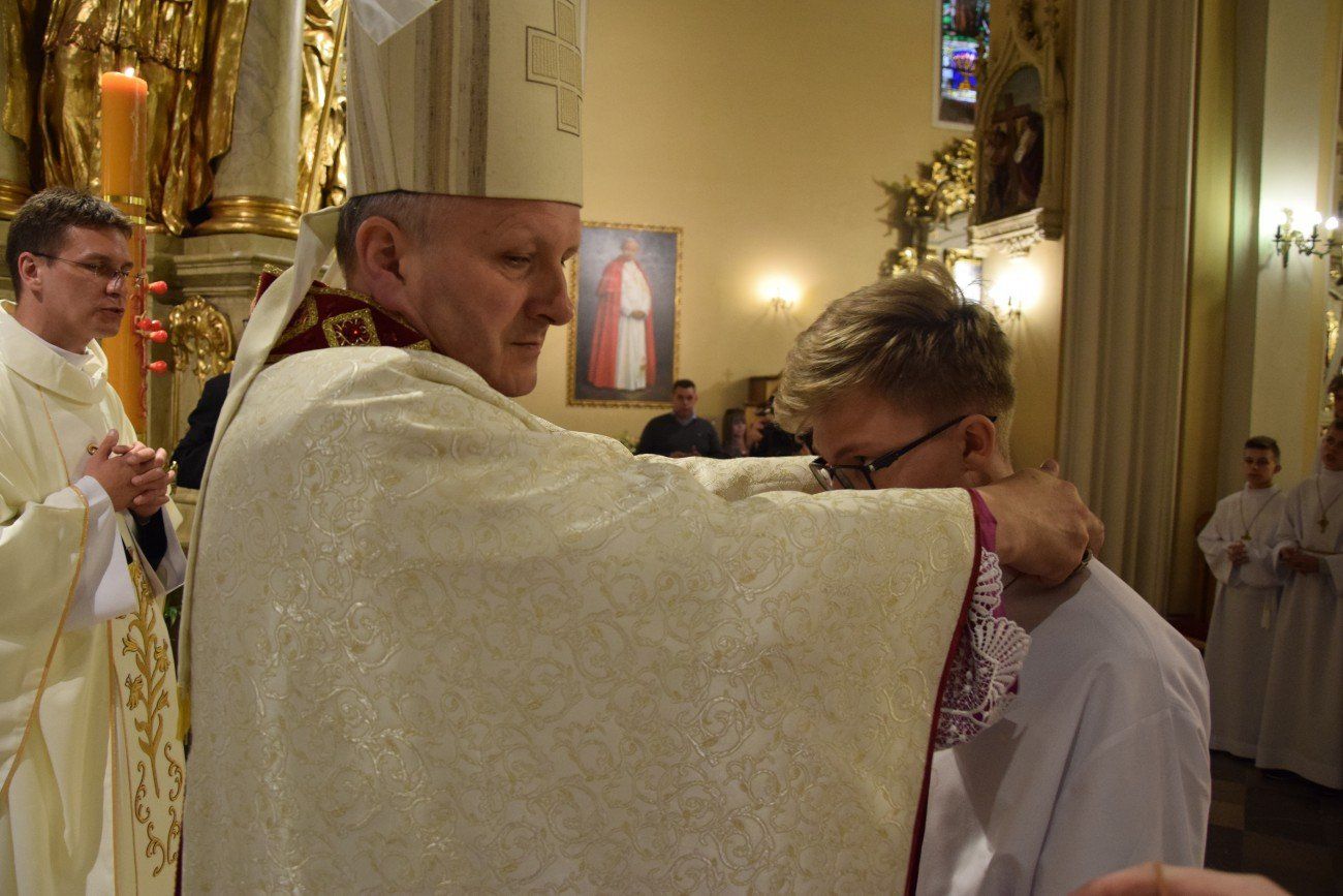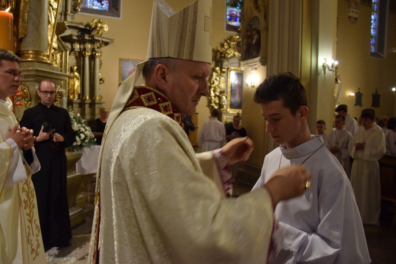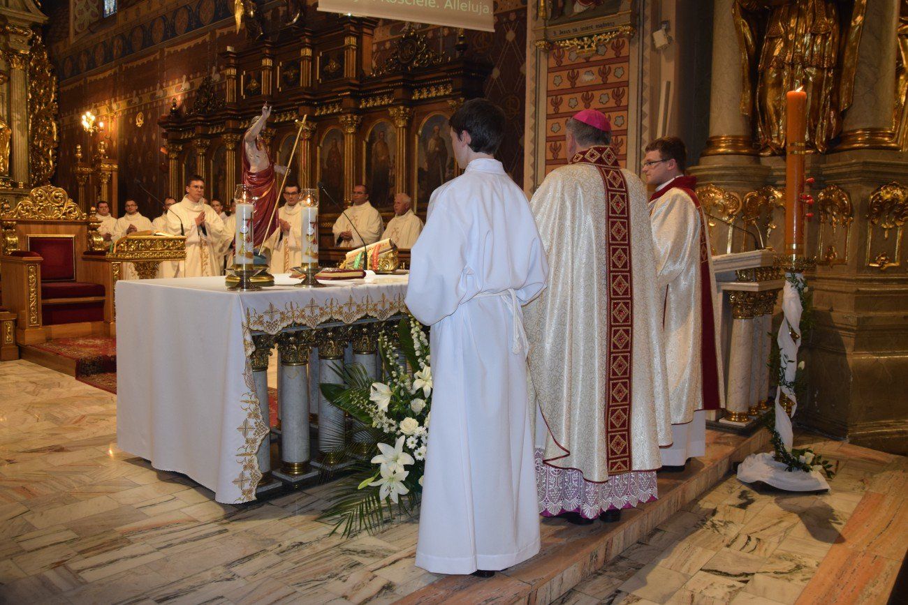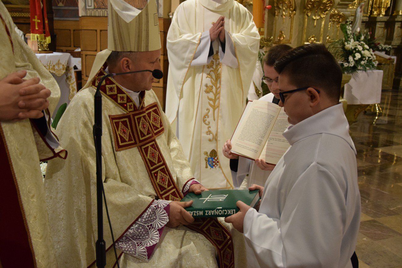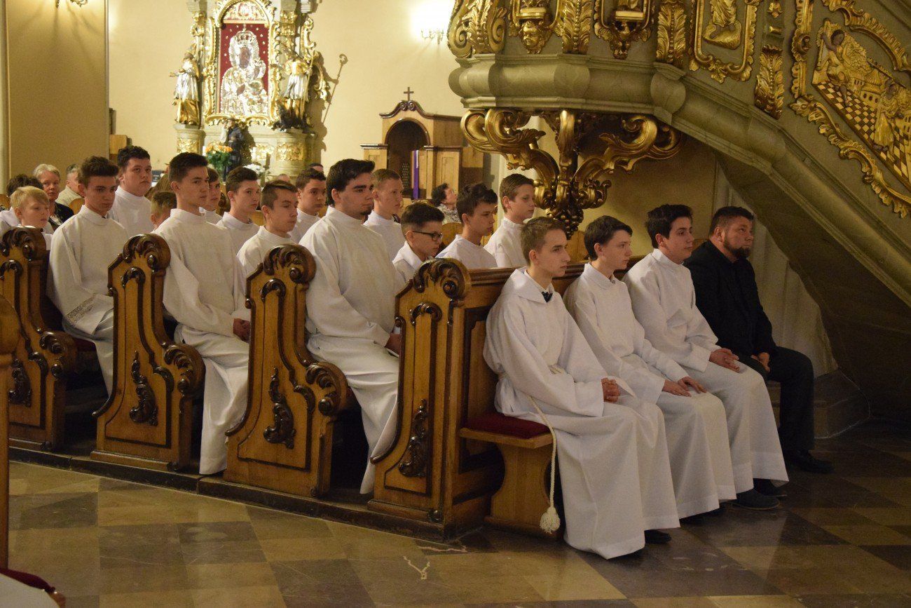 Kulminacją a zarazem podsumowaniem całego kursu lektorskiego była uroczysta Eucharystia w Katedrze Kaliskiej, którą sprawowali księża proboszczowie i wikariusze ministrantów oraz kapłani prowadzący kurs pod przewodnictwem księdza Biskupa Łukasza Buzuna – biskupa pomocniczego naszej diecezji w niedzielne popołudnie, 22 kwietnia. W Eucharystii uczestniczyli rodzice oraz najbliższe rodziny ministrantów, którzy zostali ustanowieni lektorami. Po homilii nastąpiło imienne przedstawienie księdzu Biskupowi kandydatów do przyjęcia posługi lektora oraz parafii, z których pochodzą. Po homilii ksiądz Biskup odmówił modlitwę ustanawiającą lektorów. Następnie ksiądz Biskup wręczył każdemu z ministrantów księgę Pisma Świętego, wypowiadając słowa Przyjmij księgę Pisma Świętego i wiernie przekazuj Słowo Boże, aby coraz mocniej działało w sercach ludzkich. Ksiądz Biskup Łukasz Buzun dokonał także poświęcenia alb i krzyży lektorskich, którymi od tego dnia będą posługiwać się nowo ustanowieni lektorzy. Na zakończenie Eucharystii nowi lektorzy złożyli podziękowania Panu Bogu, księdzu Biskupowi Łukaszowi, kapłanom prowadzącym kurs, proboszczowi Katedry oraz swoim rodzicom, którzy przybyli do Katedry, aby towarzyszyć swoim synom w tym ważnym dla nich dniu.
