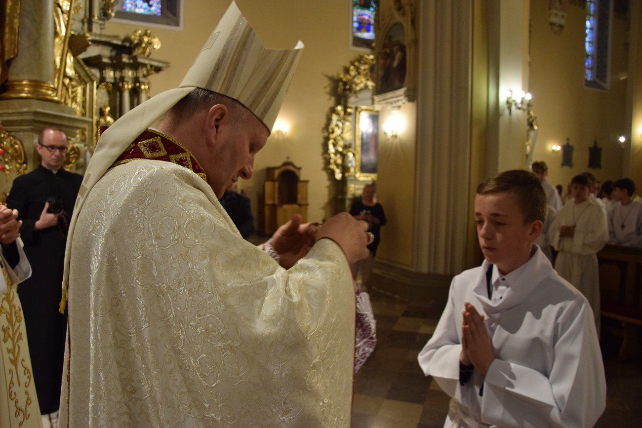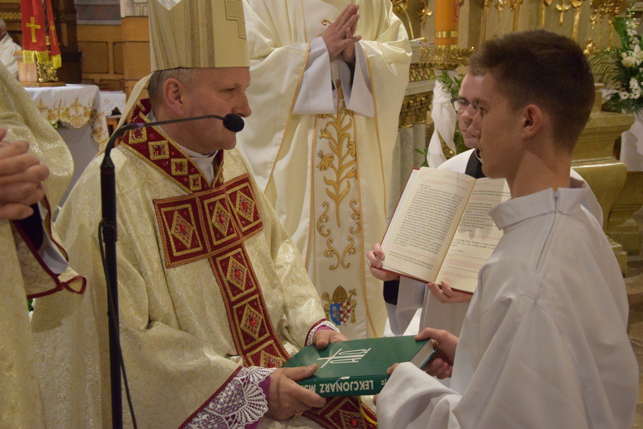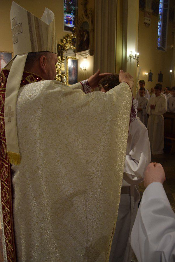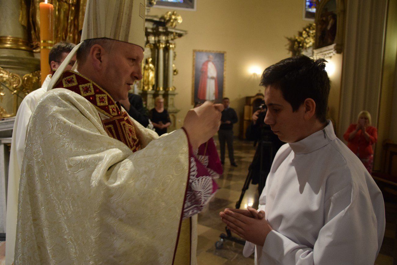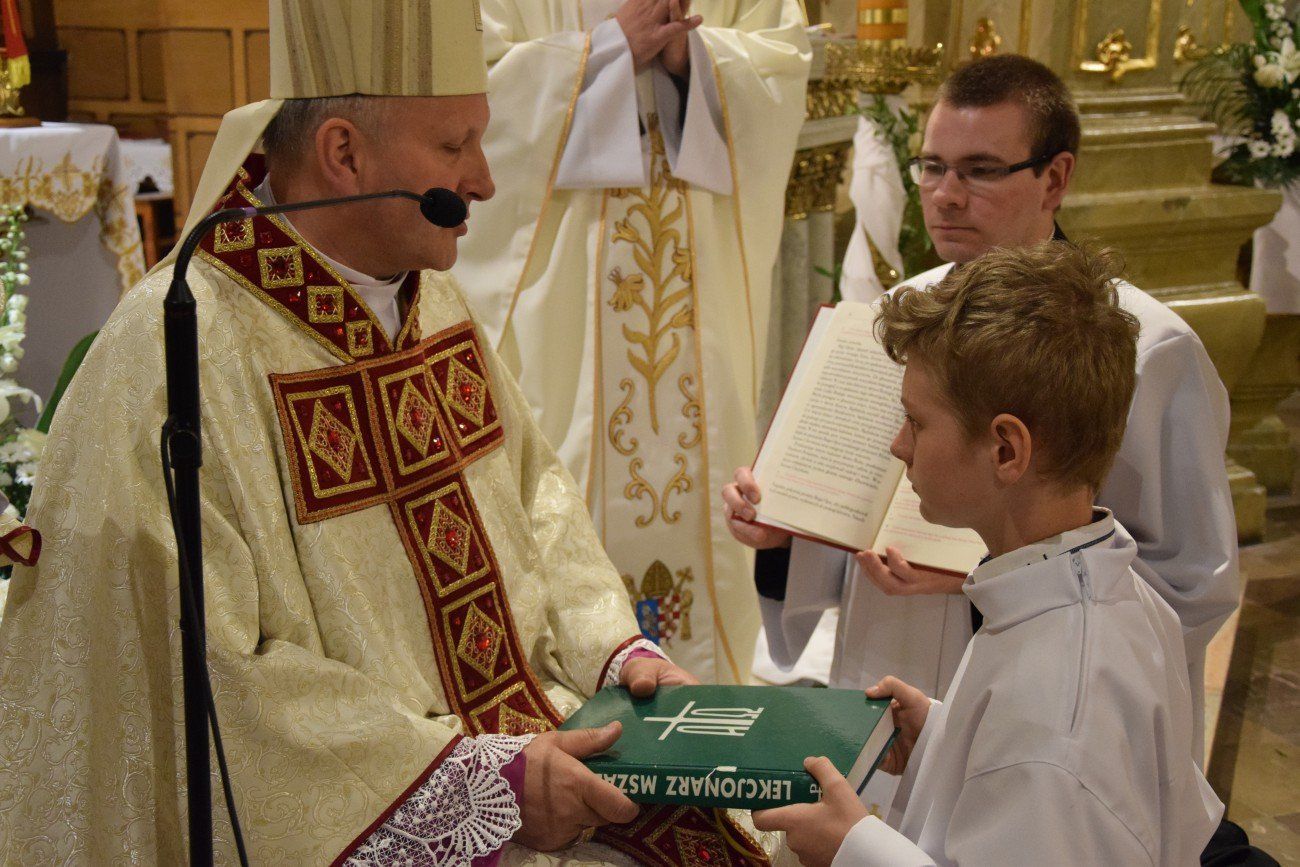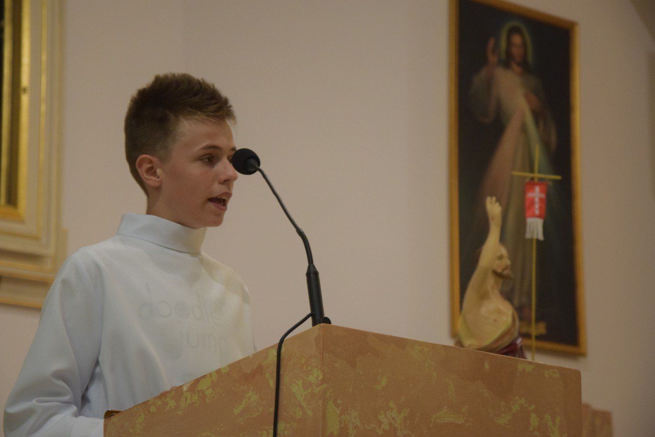 Kulminacją a zarazem podsumowaniem całego kursu lektorskiego była uroczysta Eucharystia w Katedrze Kaliskiej, którą sprawowali księża proboszczowie i wikariusze ministrantów oraz kapłani prowadzący kurs pod przewodnictwem księdza Biskupa Łukasza Buzuna – biskupa pomocniczego naszej diecezji w niedzielne popołudnie, 22 kwietnia. W Eucharystii uczestniczyli rodzice oraz najbliższe rodziny ministrantów, którzy zostali ustanowieni lektorami. Po homilii nastąpiło imienne przedstawienie księdzu Biskupowi kandydatów do przyjęcia posługi lektora oraz parafii, z których pochodzą. Po homilii ksiądz Biskup odmówił modlitwę ustanawiającą lektorów. Następnie ksiądz Biskup wręczył każdemu z ministrantów księgę Pisma Świętego, wypowiadając słowa Przyjmij księgę Pisma Świętego i wiernie przekazuj Słowo Boże, aby coraz mocniej działało w sercach ludzkich. Ksiądz Biskup Łukasz Buzun dokonał także poświęcenia alb i krzyży lektorskich, którymi od tego dnia będą posługiwać się nowo ustanowieni lektorzy. Na zakończenie Eucharystii nowi lektorzy złożyli podziękowania Panu Bogu, księdzu Biskupowi Łukaszowi, kapłanom prowadzącym kurs, proboszczowi Katedry oraz swoim rodzicom, którzy przybyli do Katedry, aby towarzyszyć swoim synom w tym ważnym dla nich dniu.
