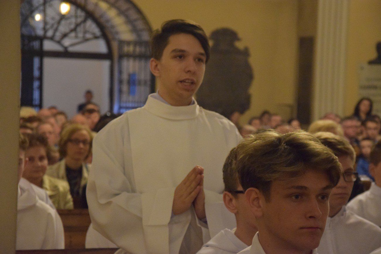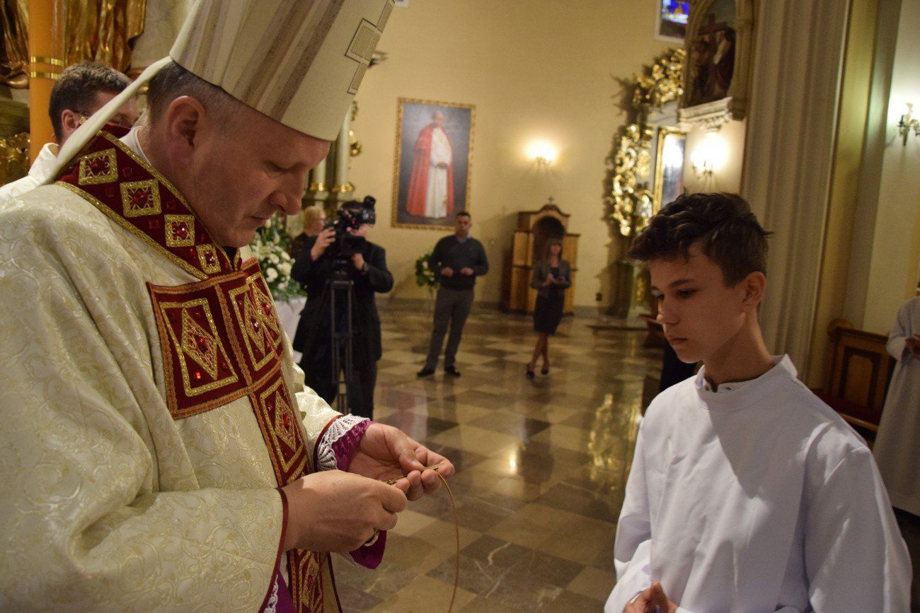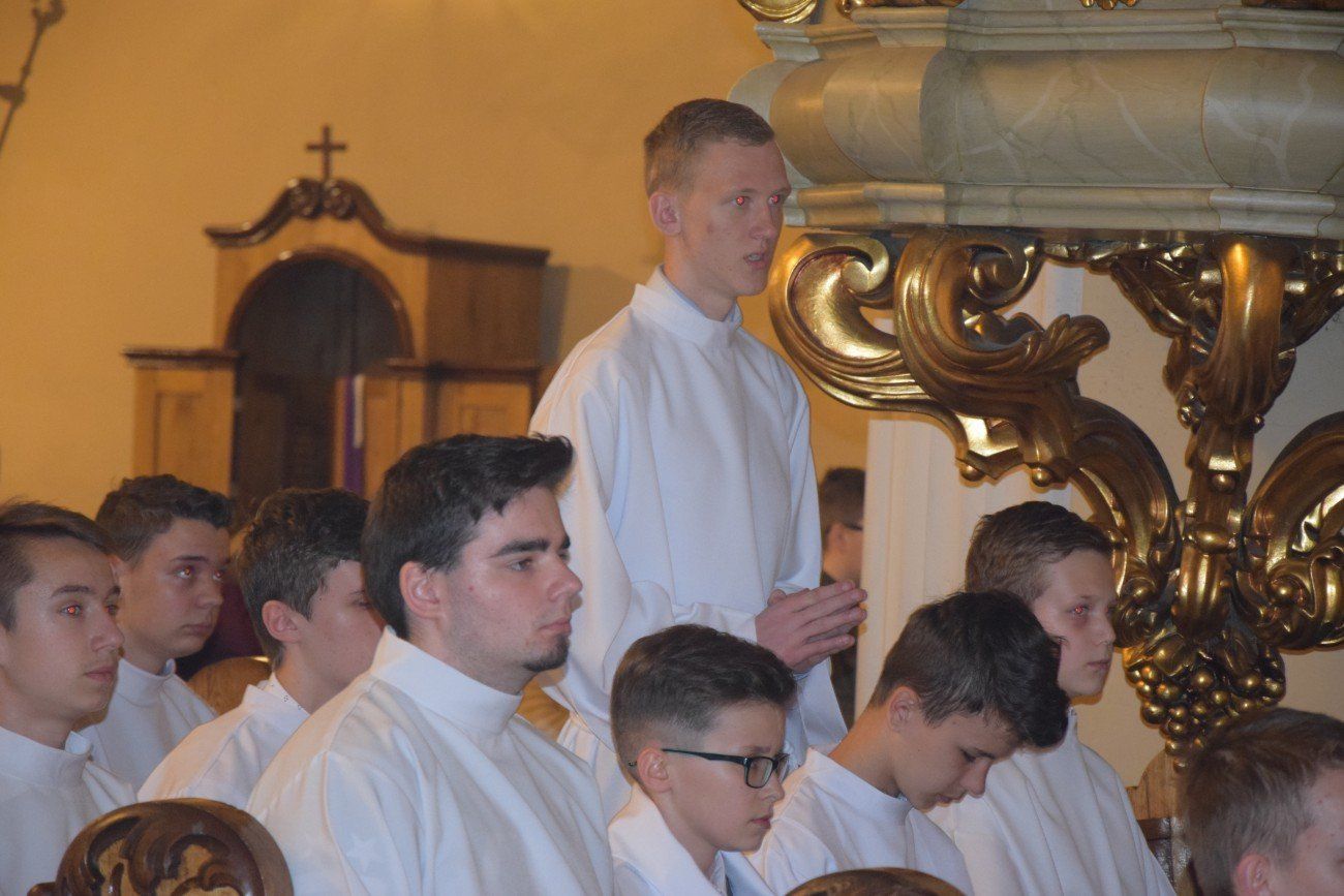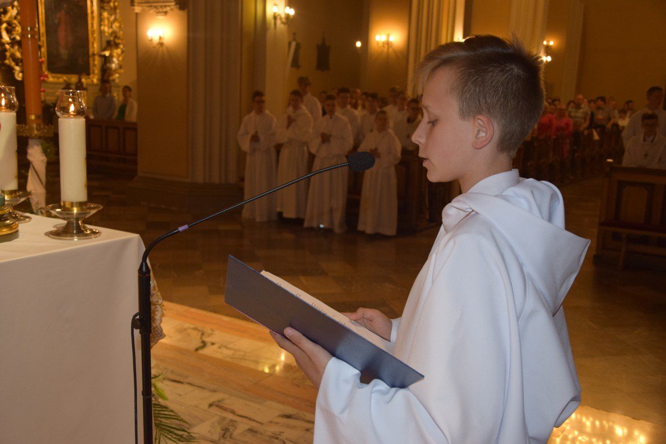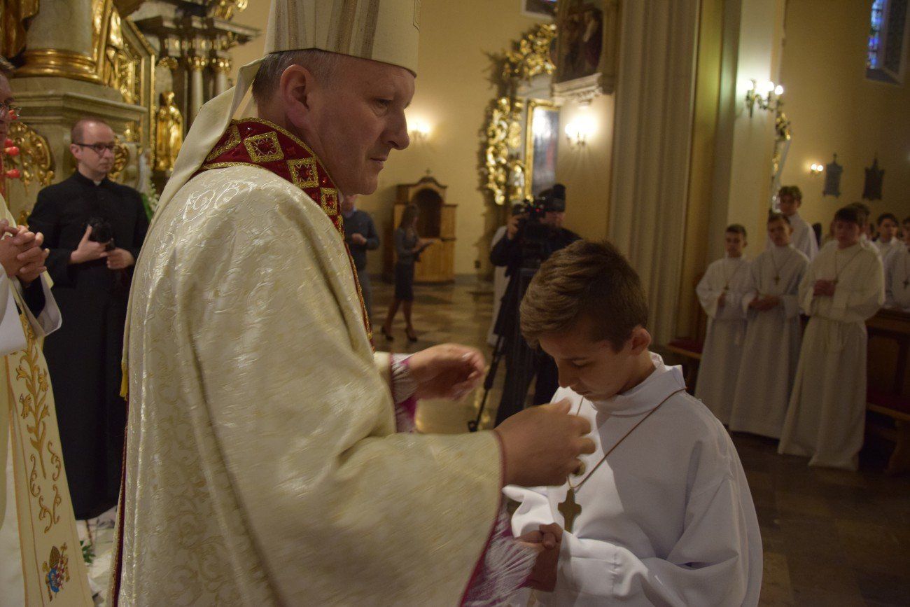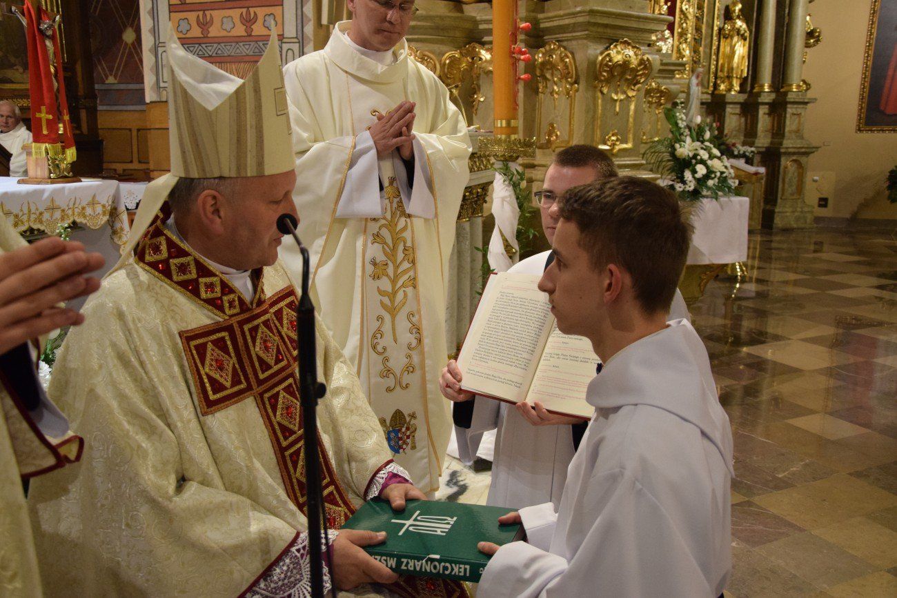 Kulminacją a zarazem podsumowaniem całego kursu lektorskiego była uroczysta Eucharystia w Katedrze Kaliskiej, którą sprawowali księża proboszczowie i wikariusze ministrantów oraz kapłani prowadzący kurs pod przewodnictwem księdza Biskupa Łukasza Buzuna – biskupa pomocniczego naszej diecezji w niedzielne popołudnie, 22 kwietnia. W Eucharystii uczestniczyli rodzice oraz najbliższe rodziny ministrantów, którzy zostali ustanowieni lektorami. Po homilii nastąpiło imienne przedstawienie księdzu Biskupowi kandydatów do przyjęcia posługi lektora oraz parafii, z których pochodzą. Po homilii ksiądz Biskup odmówił modlitwę ustanawiającą lektorów. Następnie ksiądz Biskup wręczył każdemu z ministrantów księgę Pisma Świętego, wypowiadając słowa Przyjmij księgę Pisma Świętego i wiernie przekazuj Słowo Boże, aby coraz mocniej działało w sercach ludzkich. Ksiądz Biskup Łukasz Buzun dokonał także poświęcenia alb i krzyży lektorskich, którymi od tego dnia będą posługiwać się nowo ustanowieni lektorzy. Na zakończenie Eucharystii nowi lektorzy złożyli podziękowania Panu Bogu, księdzu Biskupowi Łukaszowi, kapłanom prowadzącym kurs, proboszczowi Katedry oraz swoim rodzicom, którzy przybyli do Katedry, aby towarzyszyć swoim synom w tym ważnym dla nich dniu.