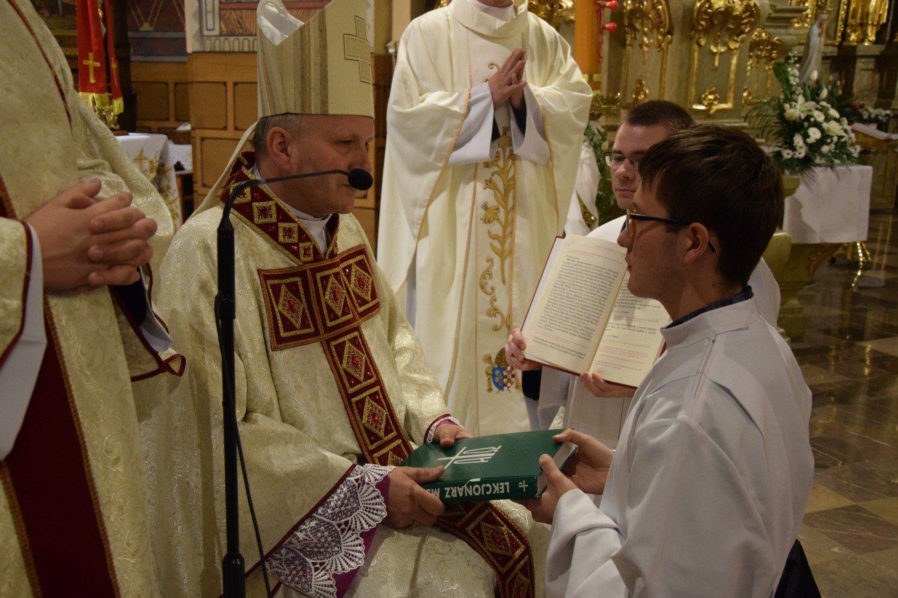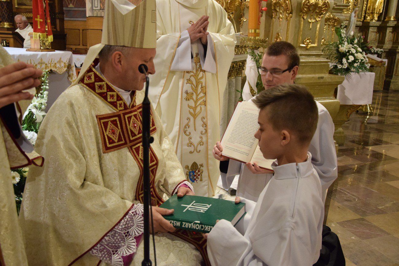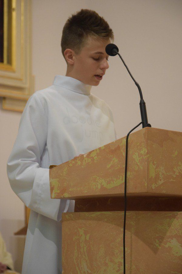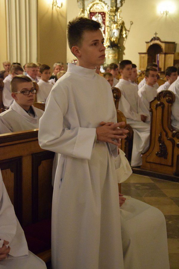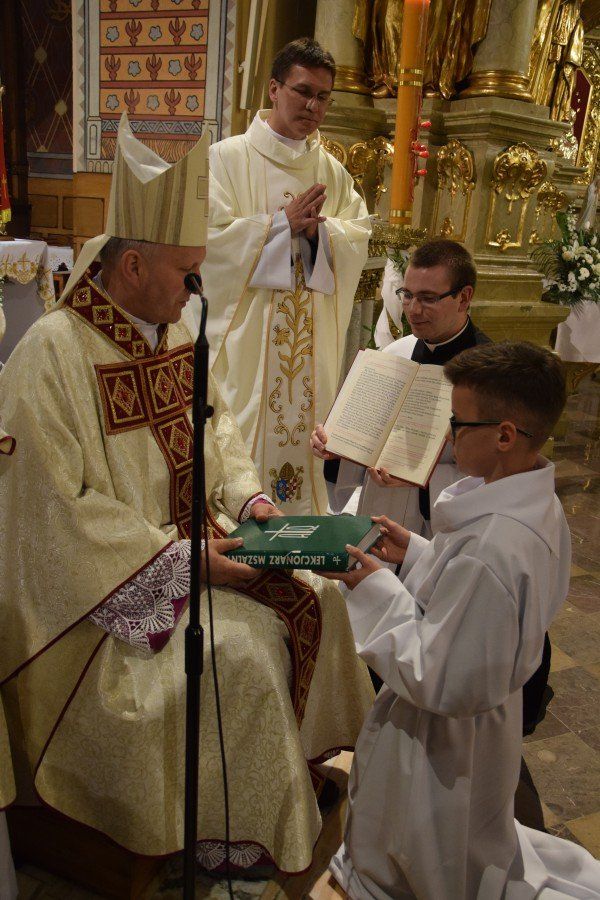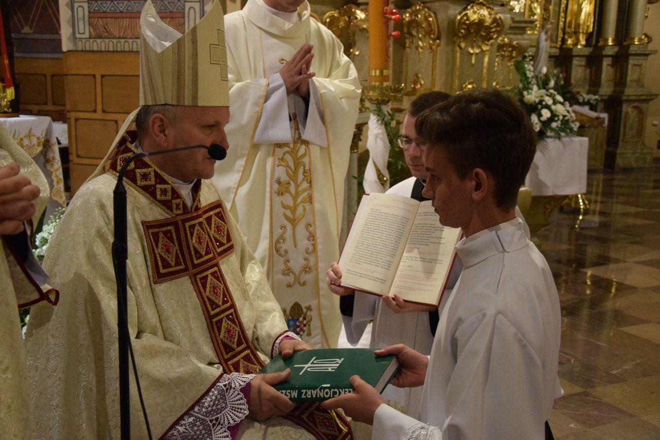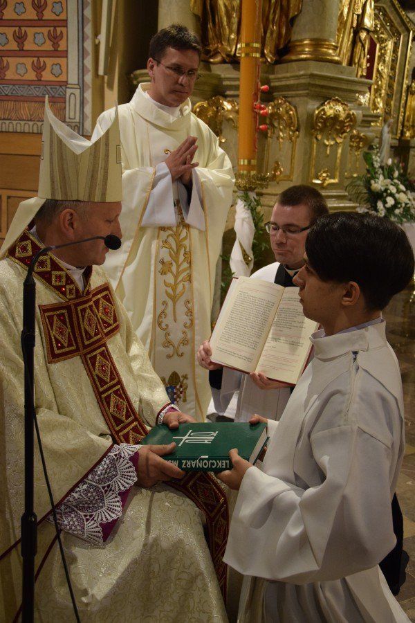 Kulminacją a zarazem podsumowaniem całego kursu lektorskiego była uroczysta Eucharystia w Katedrze Kaliskiej, którą sprawowali księża proboszczowie i wikariusze ministrantów oraz kapłani prowadzący kurs pod przewodnictwem księdza Biskupa Łukasza Buzuna – biskupa pomocniczego naszej diecezji w niedzielne popołudnie, 22 kwietnia. W Eucharystii uczestniczyli rodzice oraz najbliższe rodziny ministrantów, którzy zostali ustanowieni lektorami. Po homilii nastąpiło imienne przedstawienie księdzu Biskupowi kandydatów do przyjęcia posługi lektora oraz parafii, z których pochodzą. Po homilii ksiądz Biskup odmówił modlitwę ustanawiającą lektorów. Następnie ksiądz Biskup wręczył każdemu z ministrantów księgę Pisma Świętego, wypowiadając słowa Przyjmij księgę Pisma Świętego i wiernie przekazuj Słowo Boże, aby coraz mocniej działało w sercach ludzkich. Ksiądz Biskup Łukasz Buzun dokonał także poświęcenia alb i krzyży lektorskich, którymi od tego dnia będą posługiwać się nowo ustanowieni lektorzy. Na zakończenie Eucharystii nowi lektorzy złożyli podziękowania Panu Bogu, księdzu Biskupowi Łukaszowi, kapłanom prowadzącym kurs, proboszczowi Katedry oraz swoim rodzicom, którzy przybyli do Katedry, aby towarzyszyć swoim synom w tym ważnym dla nich dniu.