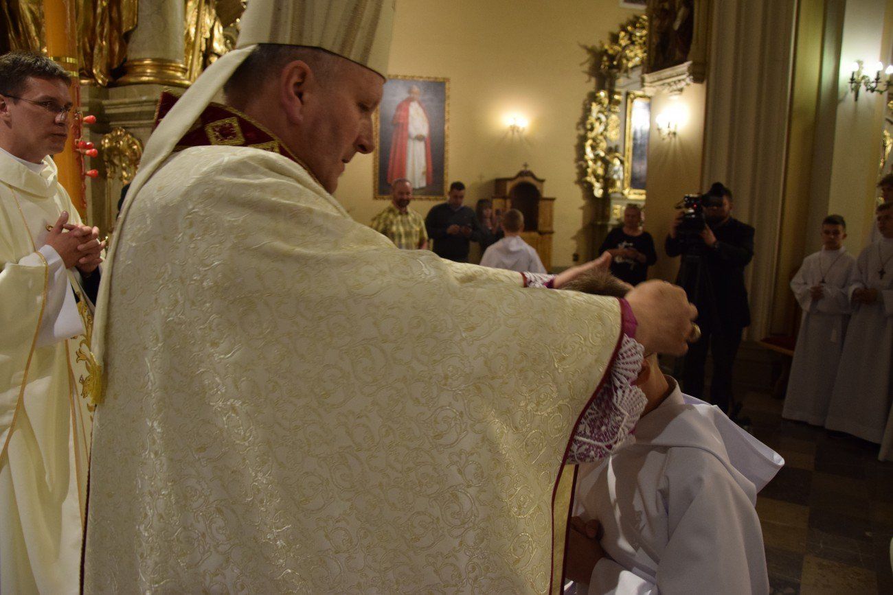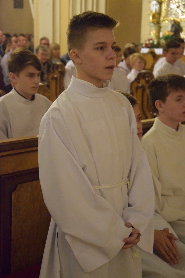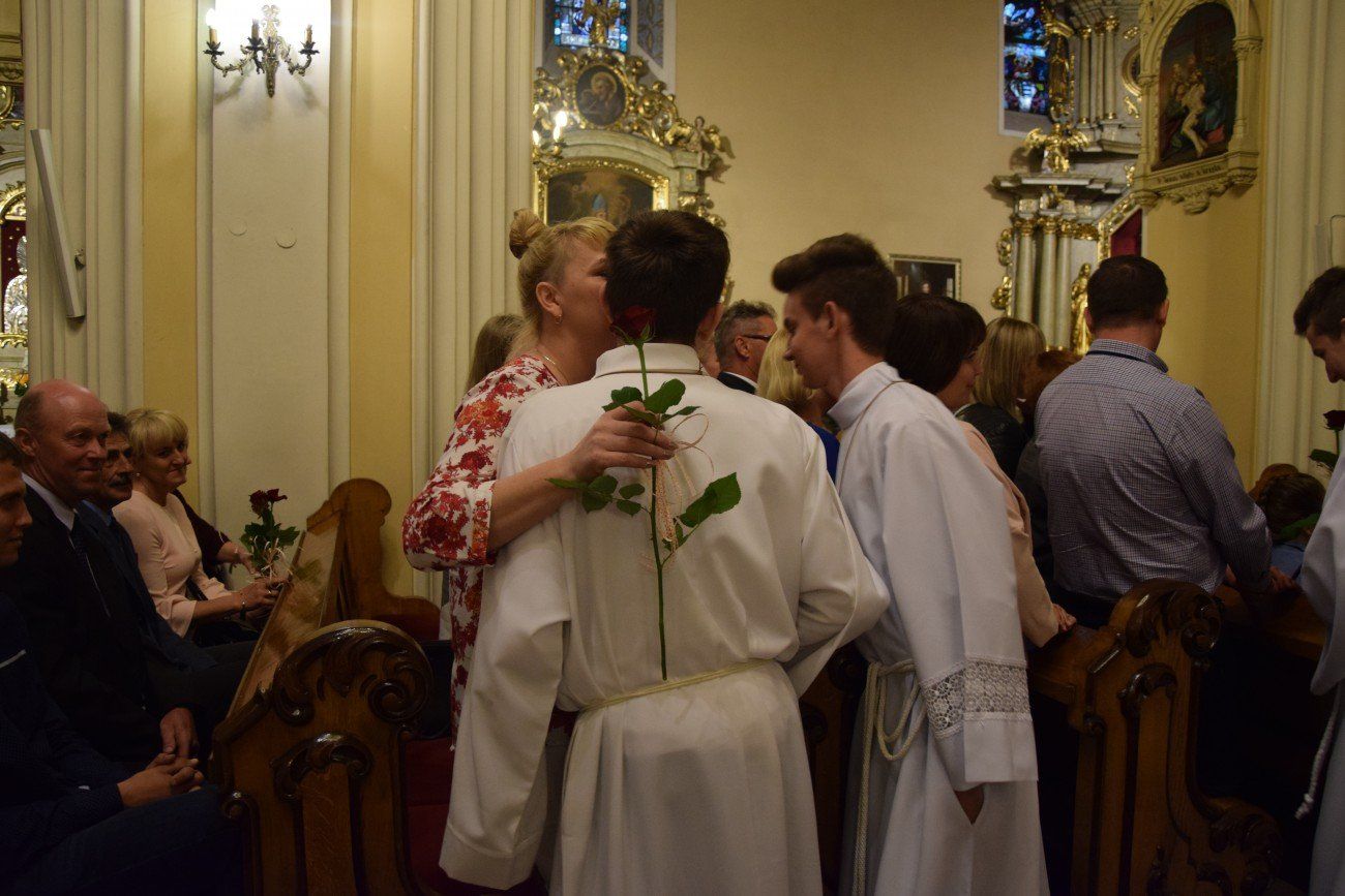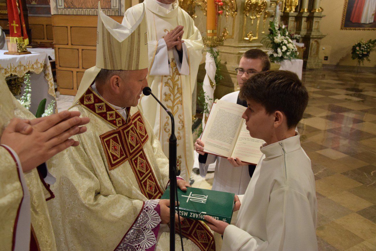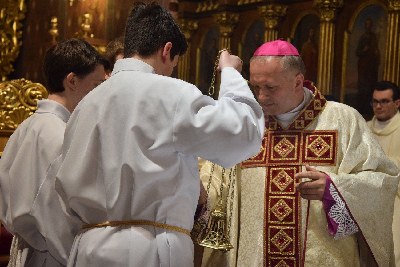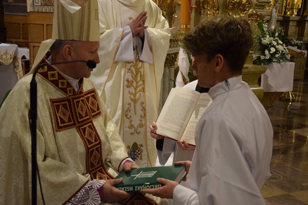 Kulminacją a zarazem podsumowaniem całego kursu lektorskiego była uroczysta Eucharystia w Katedrze Kaliskiej, którą sprawowali księża proboszczowie i wikariusze ministrantów oraz kapłani prowadzący kurs pod przewodnictwem księdza Biskupa Łukasza Buzuna – biskupa pomocniczego naszej diecezji w niedzielne popołudnie, 22 kwietnia. W Eucharystii uczestniczyli rodzice oraz najbliższe rodziny ministrantów, którzy zostali ustanowieni lektorami. Po homilii nastąpiło imienne przedstawienie księdzu Biskupowi kandydatów do przyjęcia posługi lektora oraz parafii, z których pochodzą. Po homilii ksiądz Biskup odmówił modlitwę ustanawiającą lektorów. Następnie ksiądz Biskup wręczył każdemu z ministrantów księgę Pisma Świętego, wypowiadając słowa Przyjmij księgę Pisma Świętego i wiernie przekazuj Słowo Boże, aby coraz mocniej działało w sercach ludzkich. Ksiądz Biskup Łukasz Buzun dokonał także poświęcenia alb i krzyży lektorskich, którymi od tego dnia będą posługiwać się nowo ustanowieni lektorzy. Na zakończenie Eucharystii nowi lektorzy złożyli podziękowania Panu Bogu, księdzu Biskupowi Łukaszowi, kapłanom prowadzącym kurs, proboszczowi Katedry oraz swoim rodzicom, którzy przybyli do Katedry, aby towarzyszyć swoim synom w tym ważnym dla nich dniu.