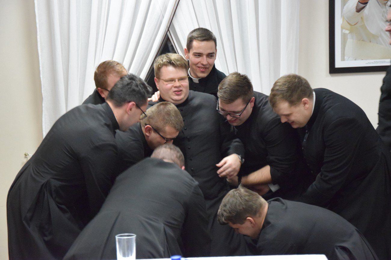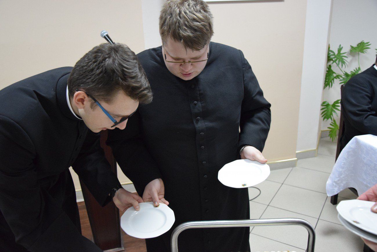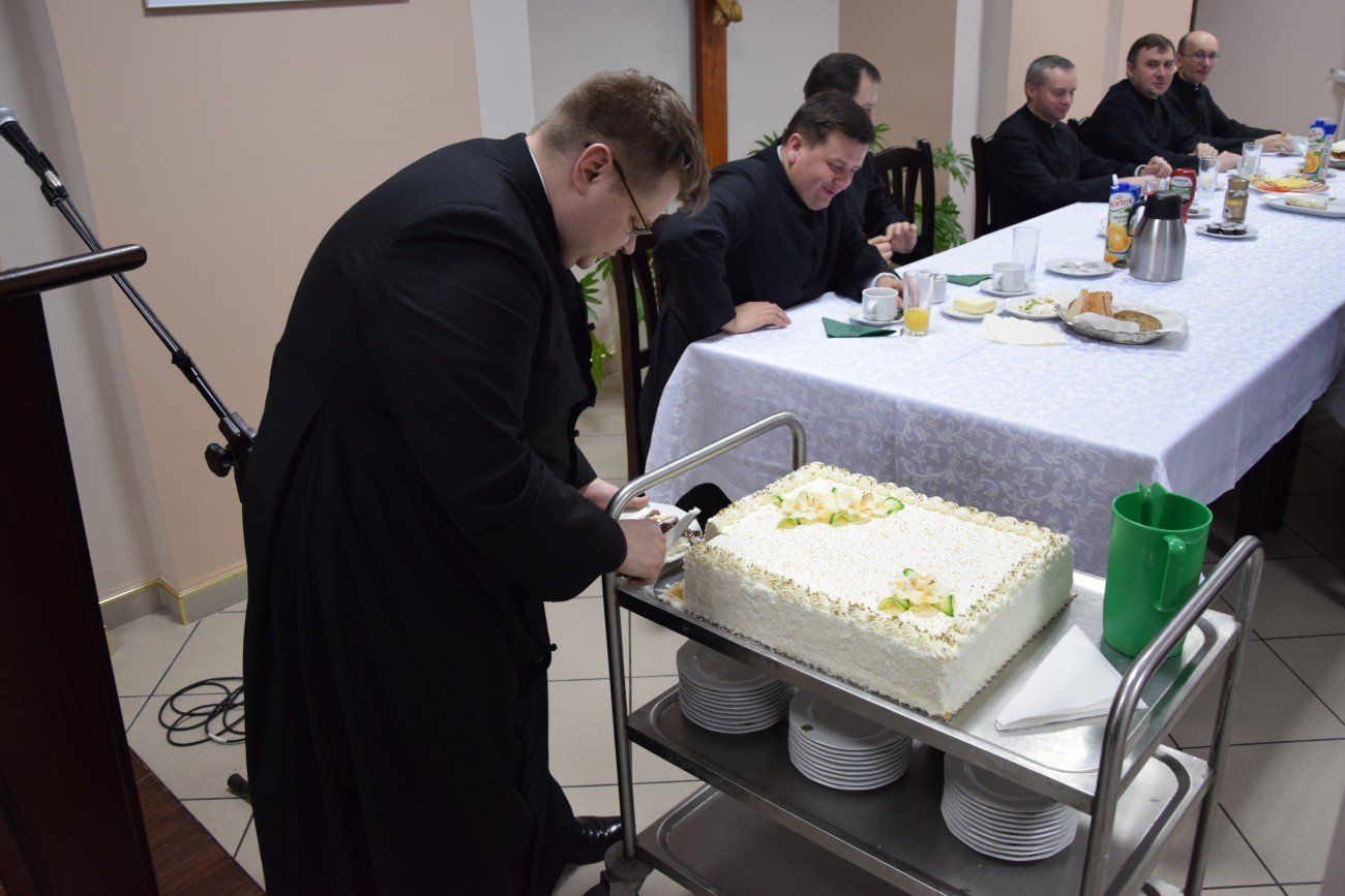 Po Eucharystii wszyscy zgromadzili się w seminaryjnym refektarzu na uroczystej kolacji, podczas której nie zabrakło prymicyjnego tortu oraz dobrego humoru.
