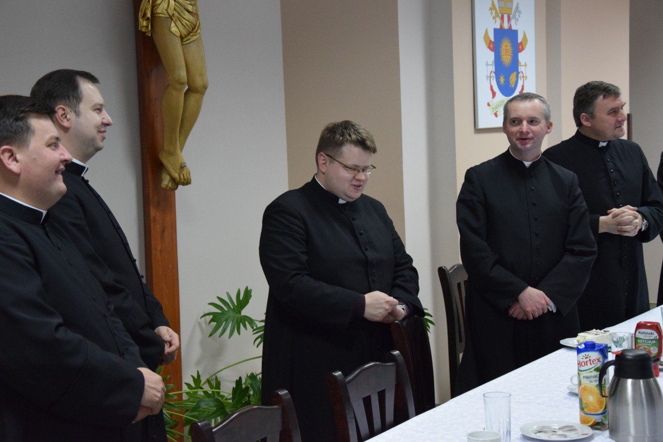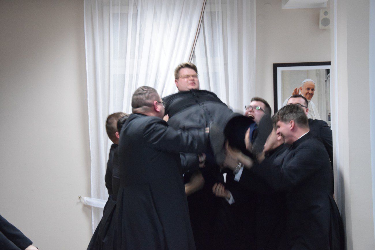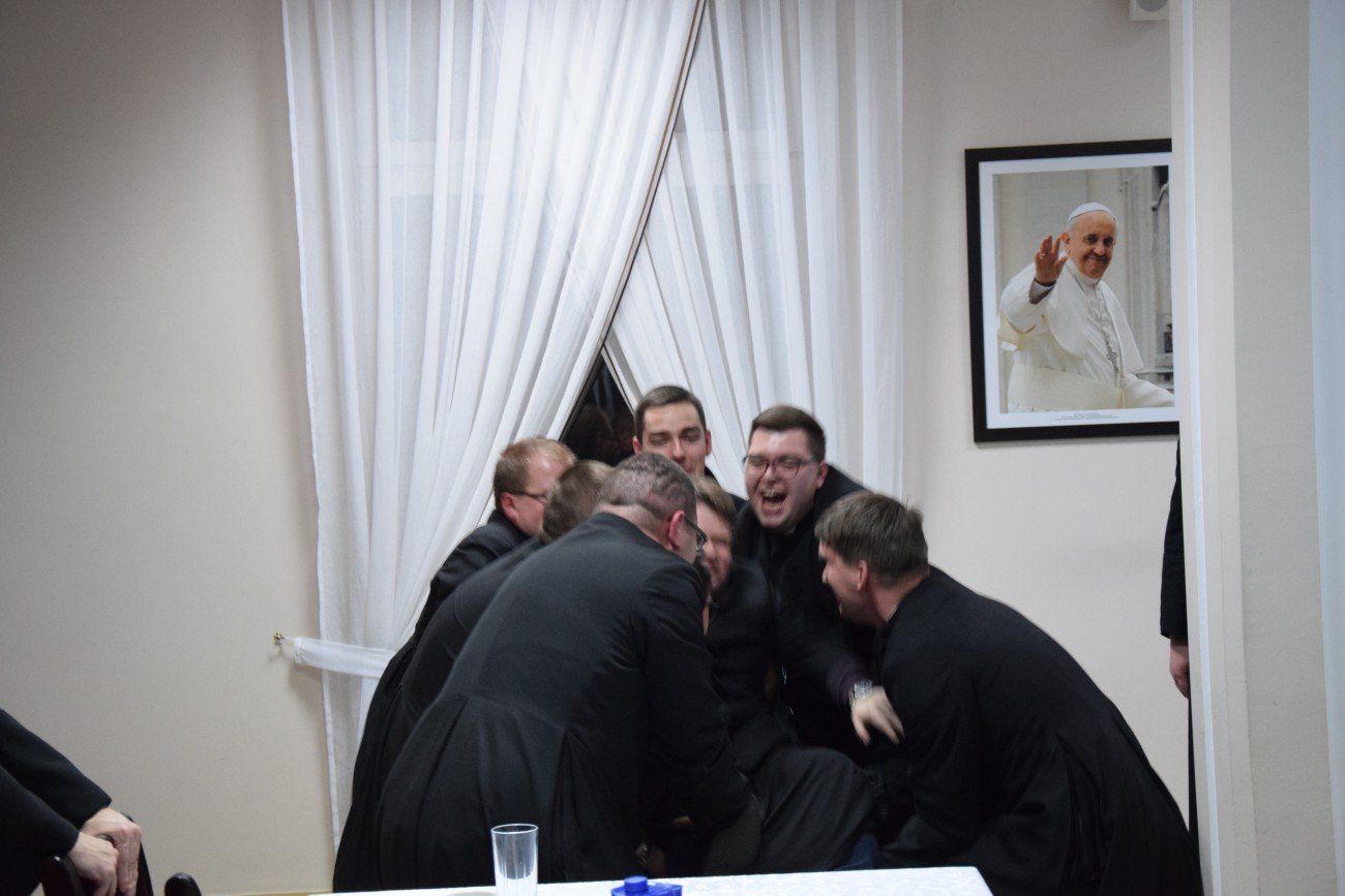 Po Eucharystii wszyscy zgromadzili się w seminaryjnym refektarzu na uroczystej kolacji, podczas której nie zabrakło prymicyjnego tortu oraz dobrego humoru.