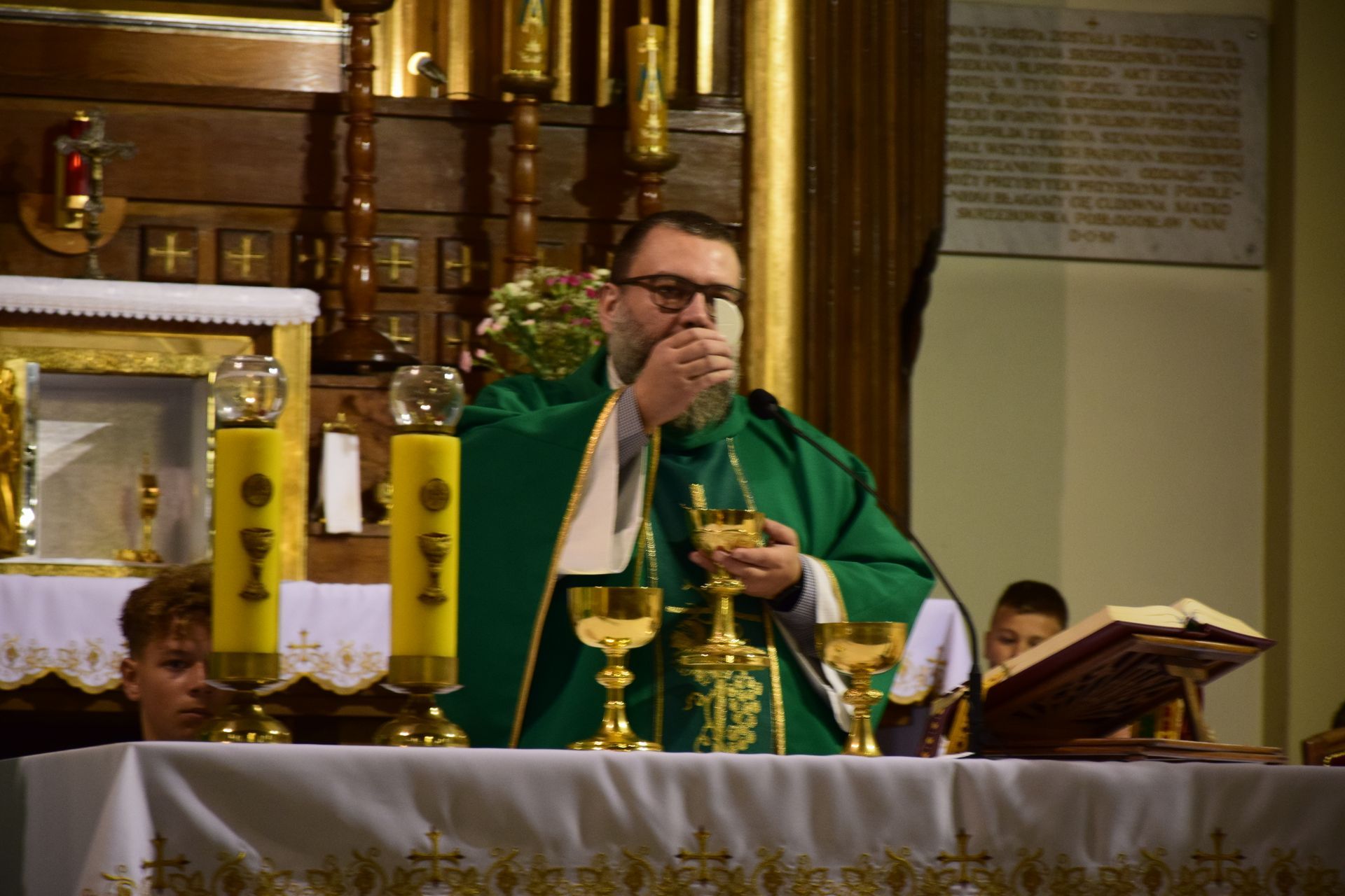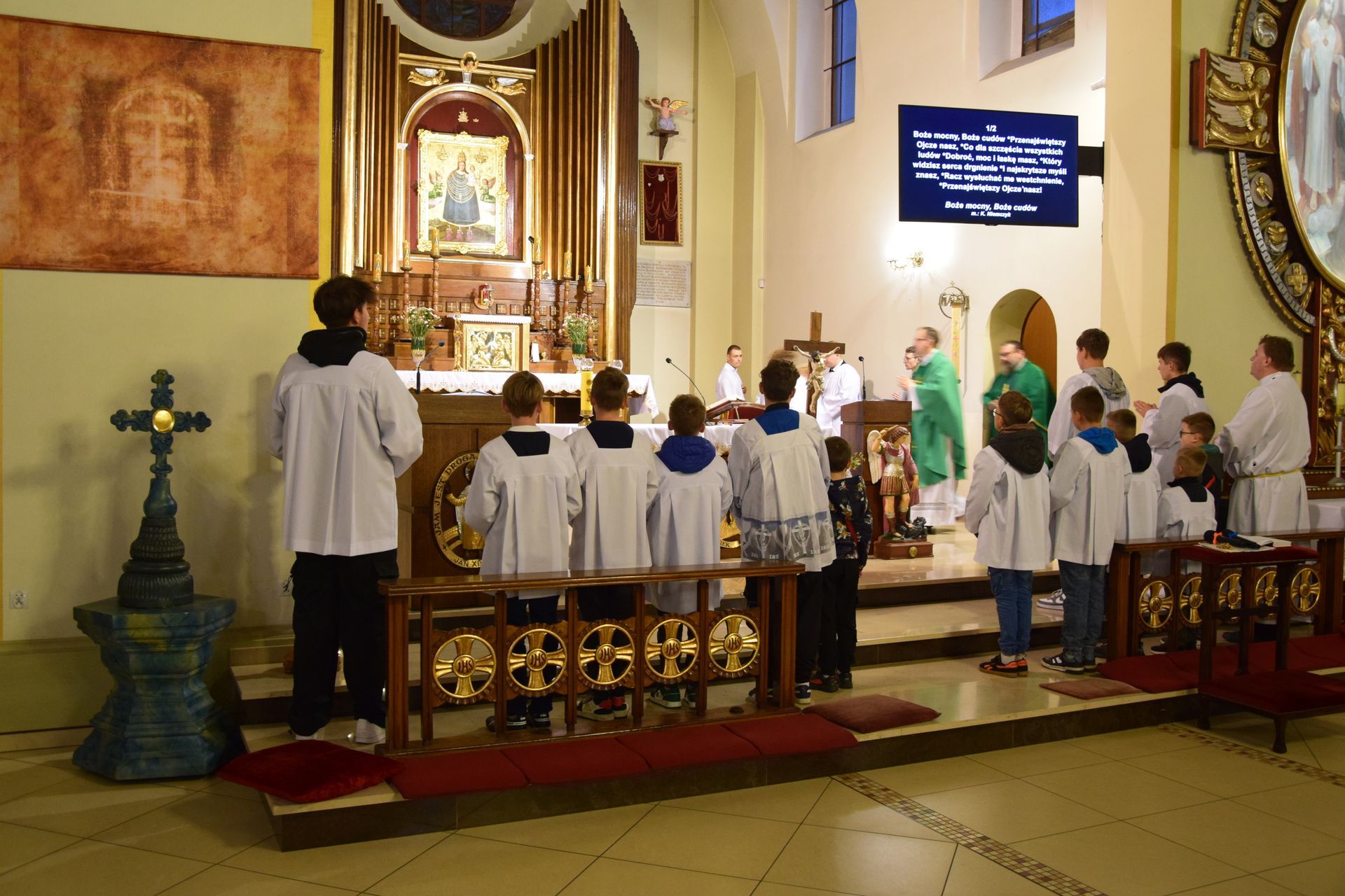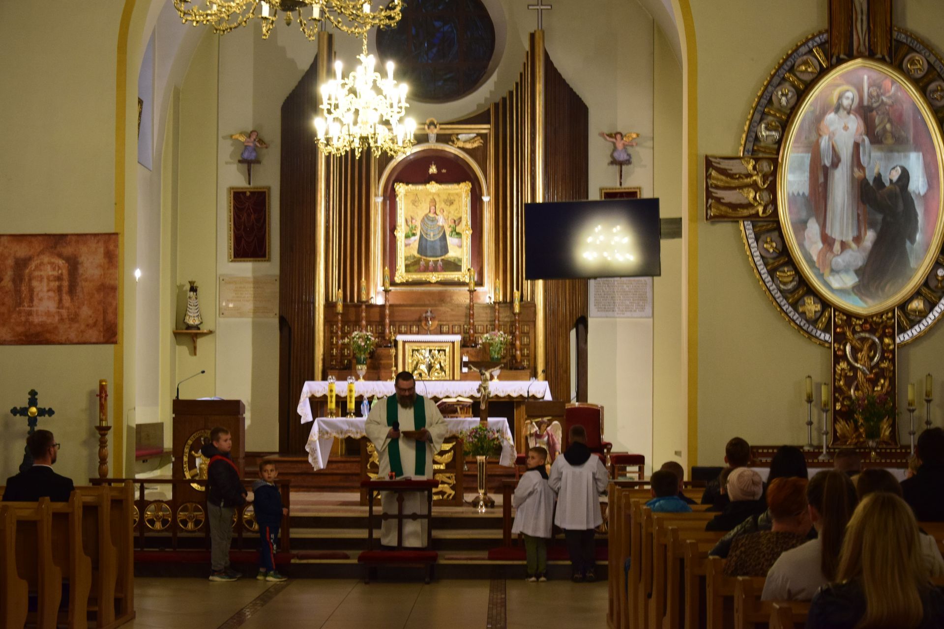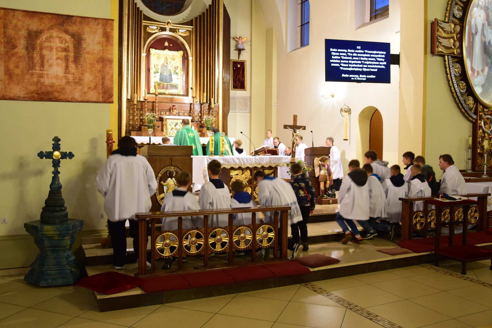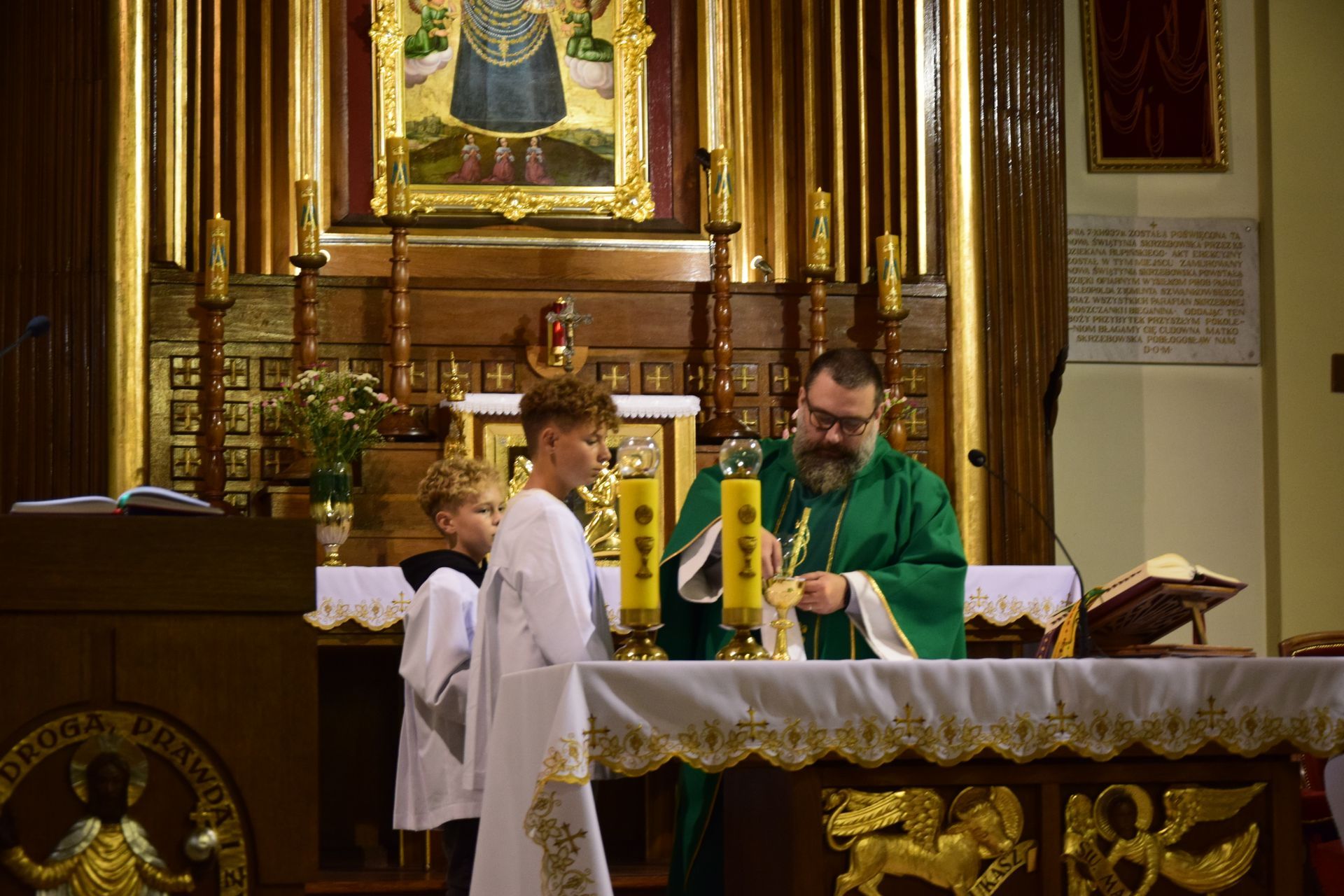 Po zakończeniu pierwszej części spotkania, przeszliśmy do kościoła, gdzie wspólnie modliliśmy się na Eucharystii. Mszy świętej przewodniczył tamtejszy proboszcz - ks. Aleksander Piekielny, a homilię wygłosił ks. wicerektor Waldemar Graczyk. Po zakończonej modlitwie wróciliśmy do Starej Obory, gdzie już czekał przygotowany dla nas grill. Była to świetna okazja do różnego rodzaju rozmów i opowiedzenia, jak nam się żyje w seminarium.