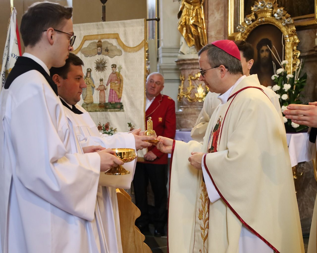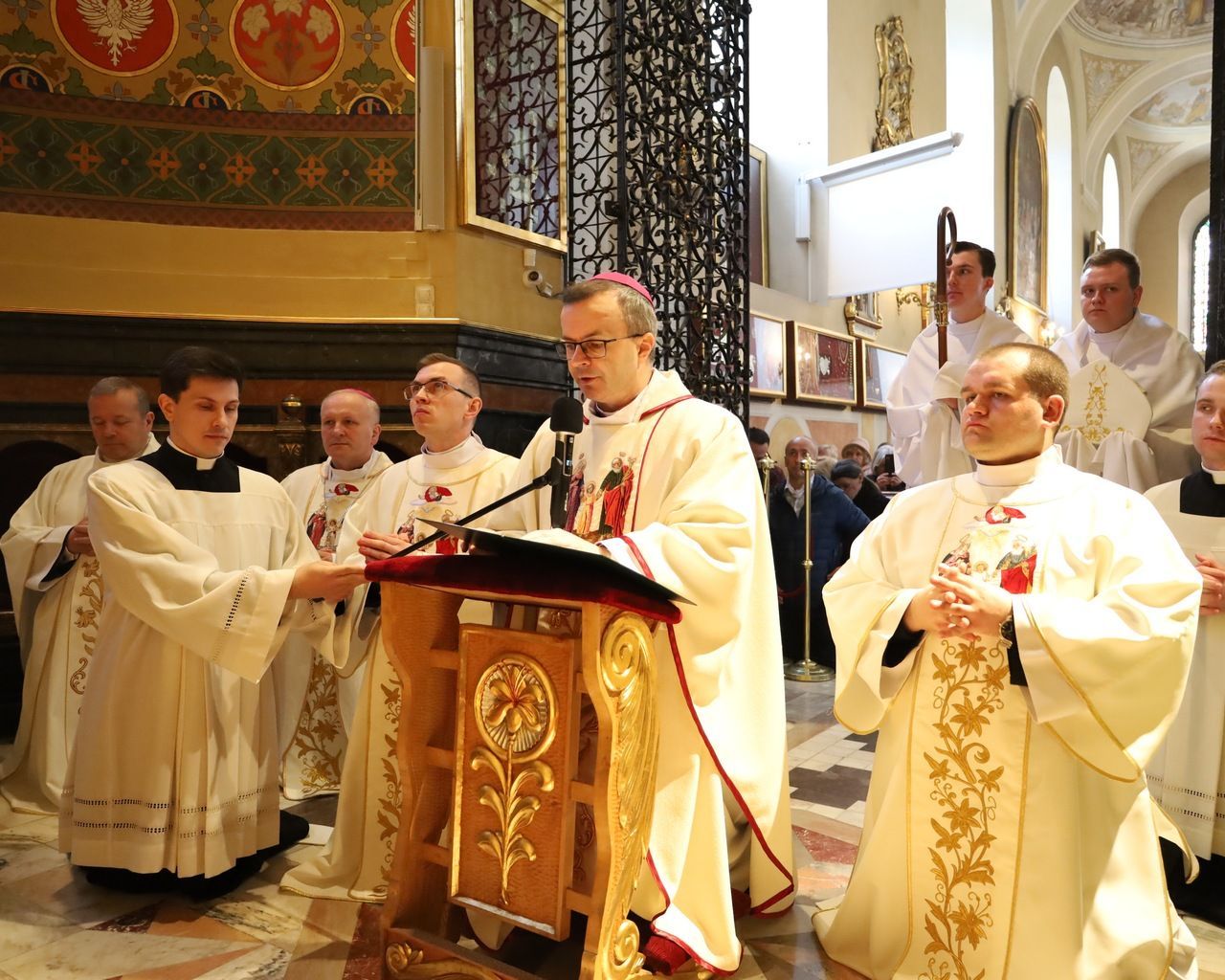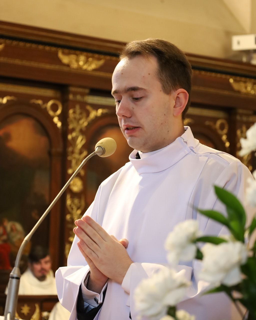26 października w XXX Niedzielę Zwykłą mieliśmy okazję przeżywać bardzo ważny dzień dla braci z kursu III i Jakuba z kursu IV, którzy wobec Kościoła wyrazili swoją gotowość do przygotowania się do święceń diakonatu i prezbiteratu oraz kształtowania swojego życia w duchu wiernej służby Chrystusowi i Jego Kościołowi, a wypowiadając swoje "Chcę" zostali włączeni do grona kandydatów do święceń diakonatu i prezbiteratu. Zewnętrznym wyrazem ich gotowości są obłóczyny, czyli przyjęcie stroju duchownego, którym jest sutanna. W gronie 13 kleryków znalazło się 3 braci z diecezji kaliskiej - kl. Mikołaj, kl. Marcel oraz kl. Piotr. Dzisiejszą uroczystość rozpoczęliśmy poranną jutrznią, której przewodniczył ks. dr Jan Frąckowiak - rektor Arcybiskupiego Seminarium Duchownego w Poznaniu. Wygłosił także homilię, w której wytłumaczył jak ważna jest dzisiejsza decyzja braci przeżywających swoją kandydaturę i obłóczyny. Powiedział, że: Wasze "jestem", które dzisiaj wypowiecie ma być tym samym "jestem", które wypowiecie, gdy biskup wyśle was na pierwszą parafię i które będziecie wypowiadać przez całe swoje życie. Eucharystii, podczas której nasi bracia przyjęli kandydaturę i obłóczyny, przewodniczył JE bp Grzegorz Balcerek - biskup pomocniczy archidiecezji poznańskiej. Wraz z nim we wspólnej modlitwie towarzyszyli nam również księża moderatorzy oraz księża proboszczowie, rodziny i bliscy braci, których uroczystość obchodziliśmy. Po zakończonej Eucharystii, na II piętrze miała miejsce nasza seminaryjna tradycja, którą jest "przyklepanie sutanny", a następnie wszyscy udaliśmy się na refektarz, aby wraz z braćmi z kursu III oraz Jakubem z kursu IV radować się tym ważnym dla nich dniem. Zdjęcia za: Arcybiskupie Seminarium Duchowne w Poznaniu