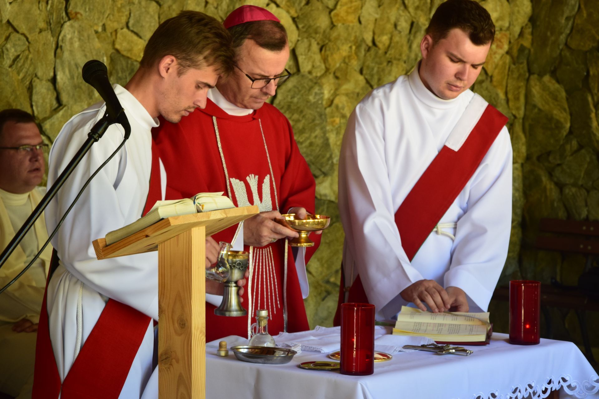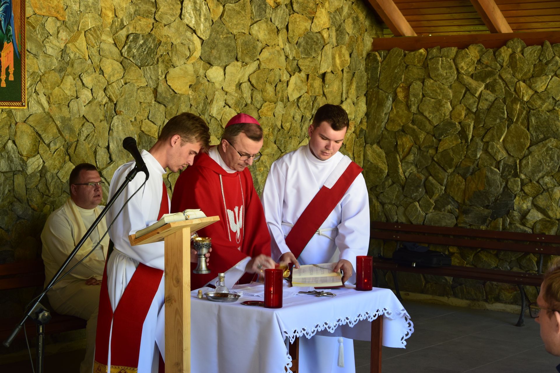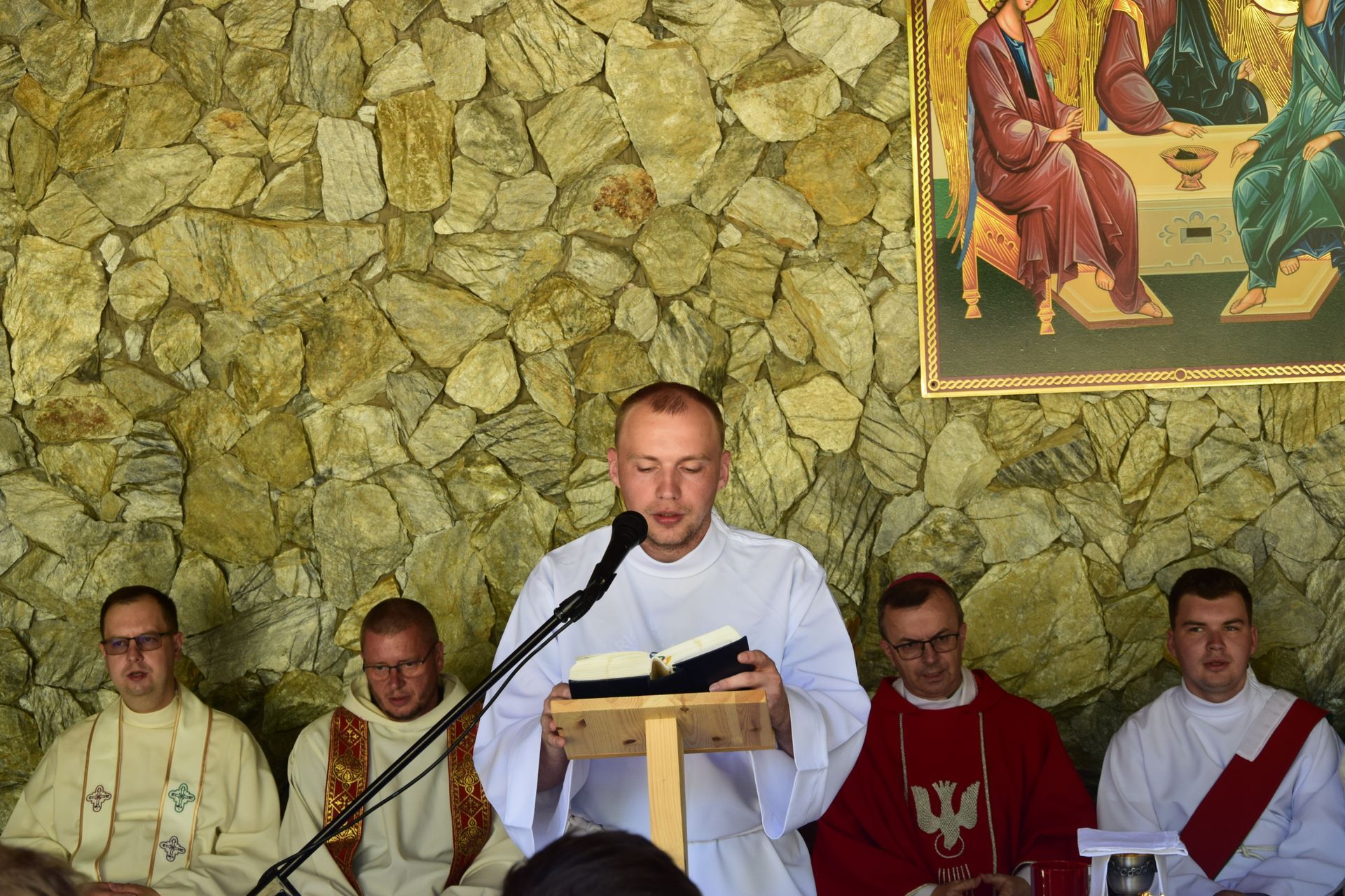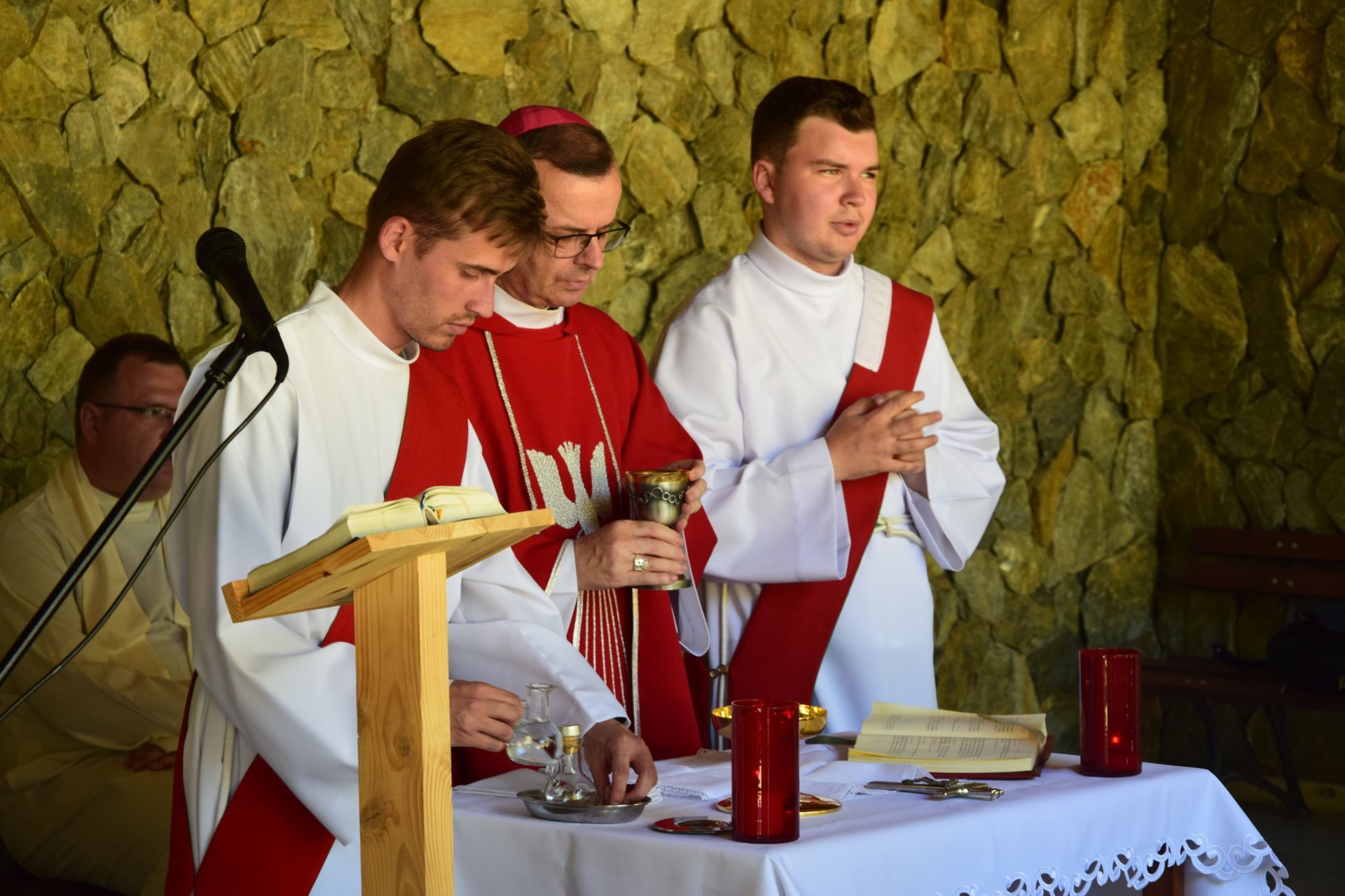 Gdy już dotarliśmy na miejsce docelowe, a więc na Górę Krzyża Jubileuszowego, chwilę odpoczęliśmy po czym wspólnie przeżyliśmy dziękczynną Eucharystię pod przewodnictwem bp. Damiana Bryla. Homilię podczas niej wygłosił do nas ks. Marcin Wiśniewski. Zawarł on podczas niej kilka ważnych myśli: