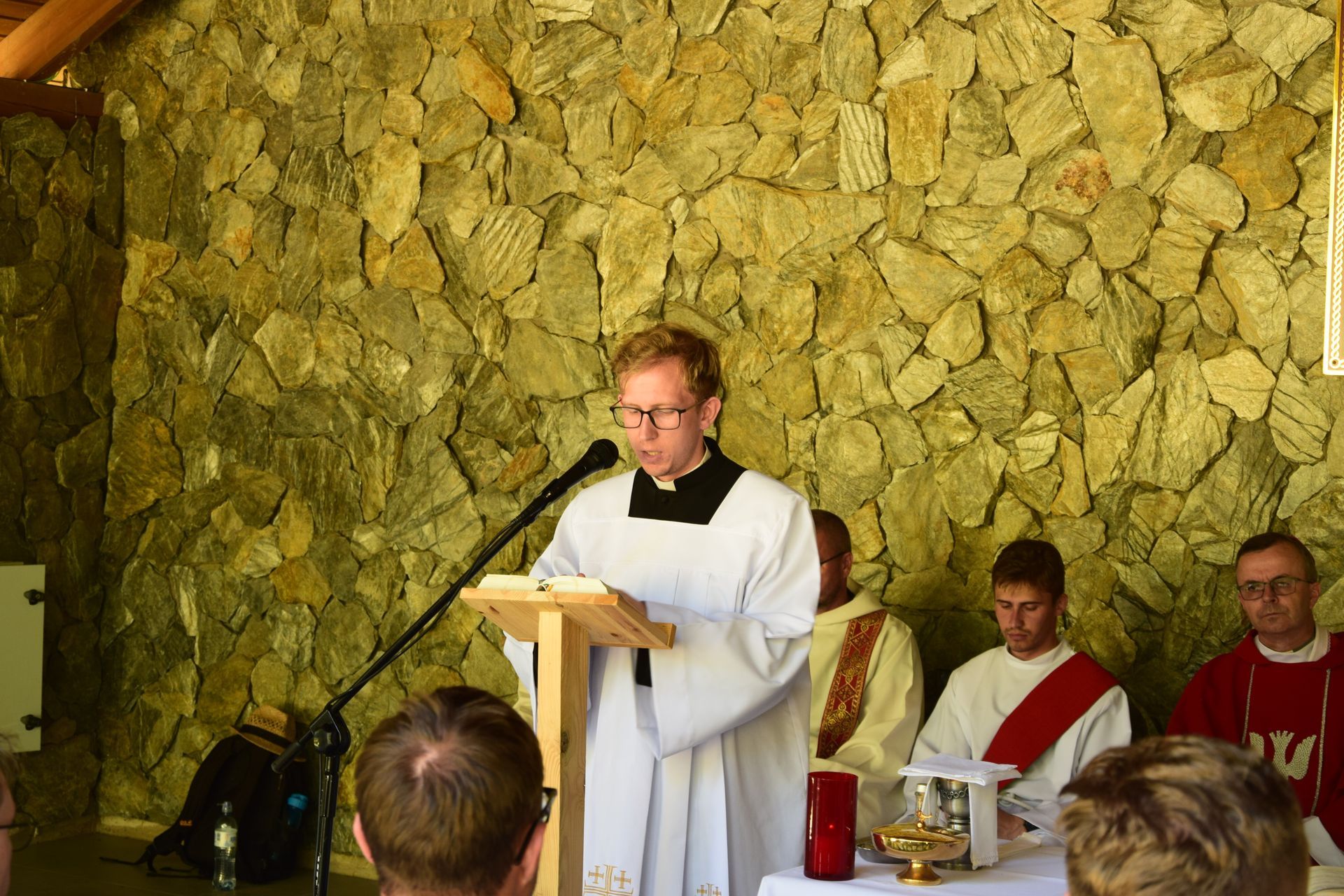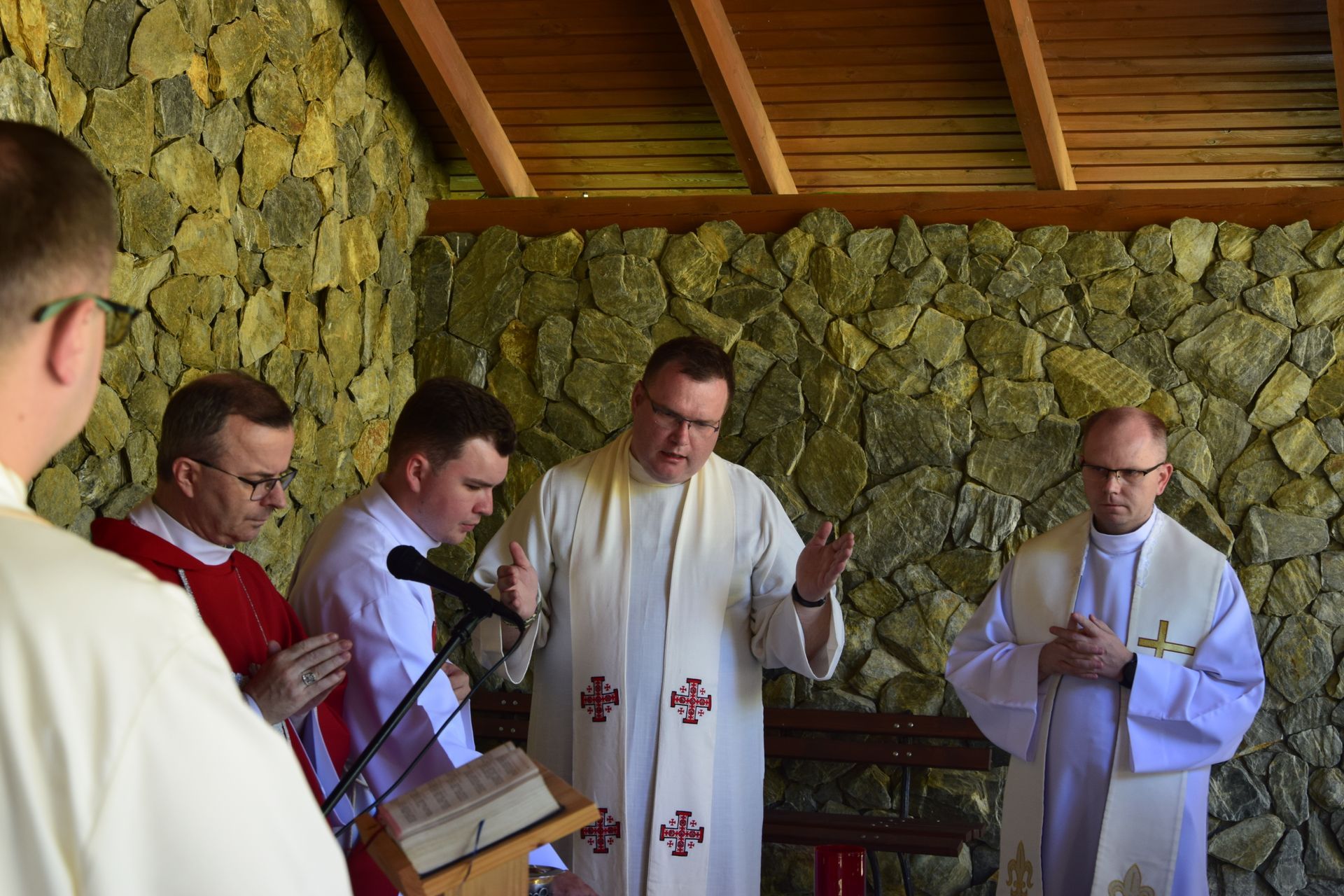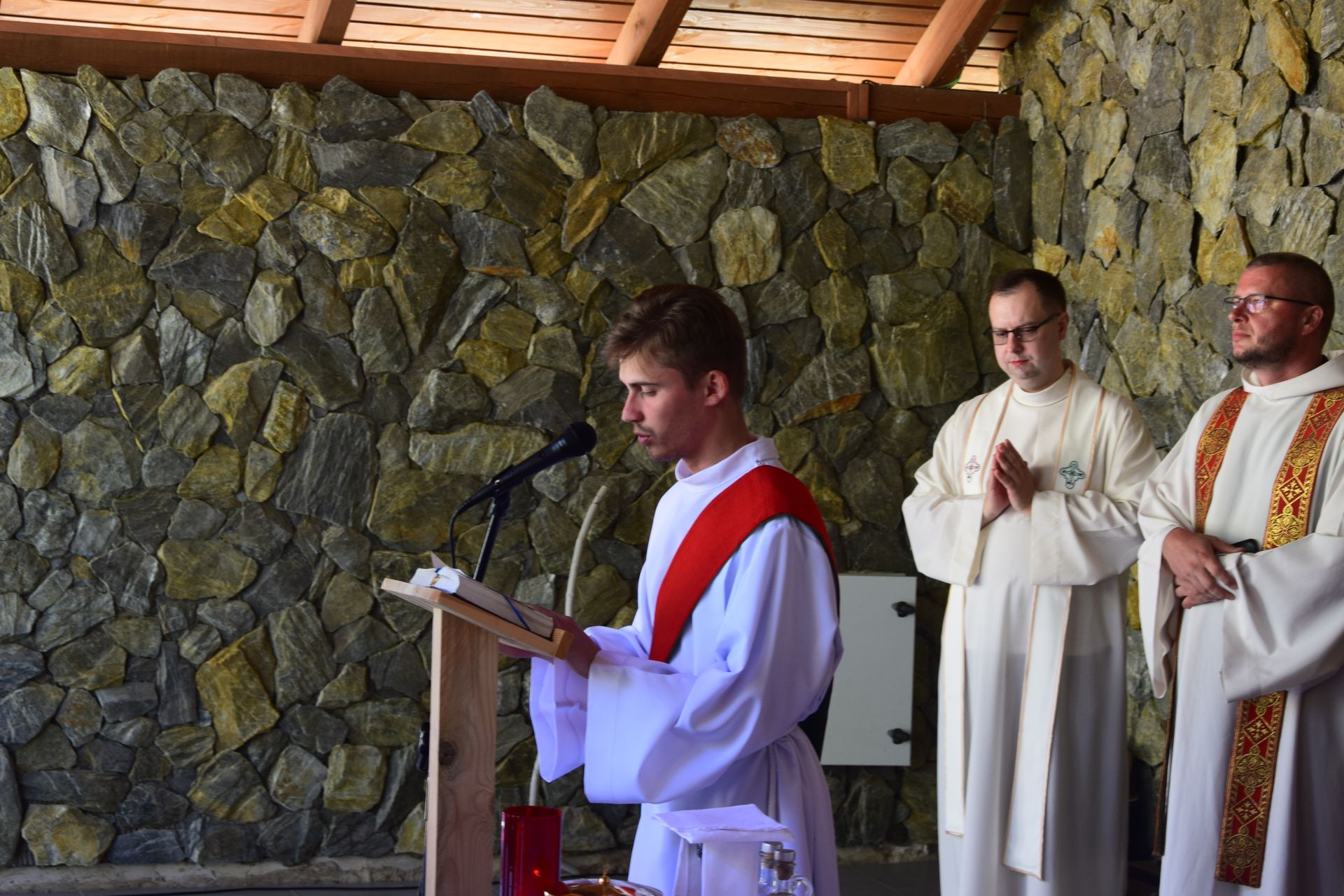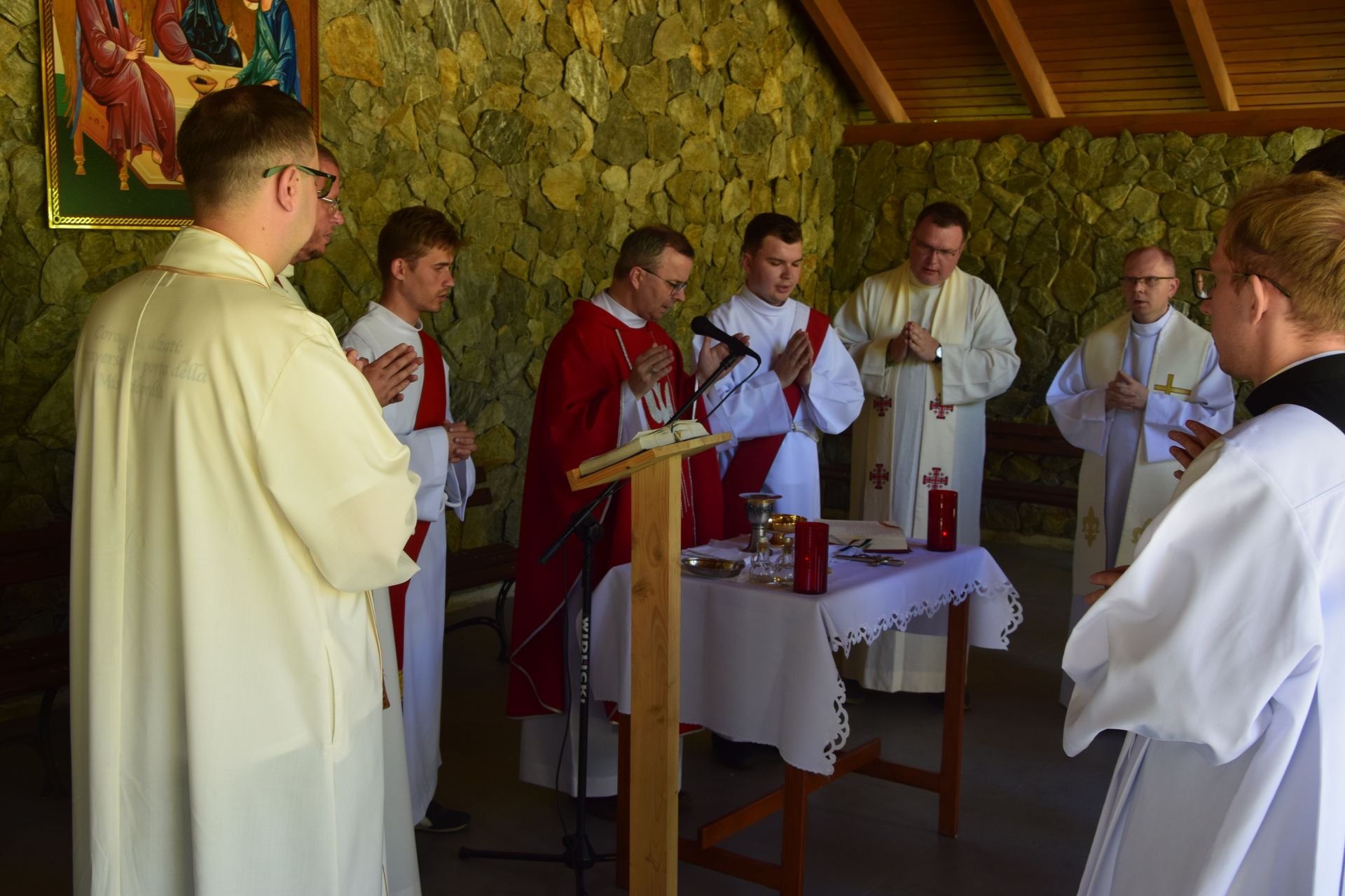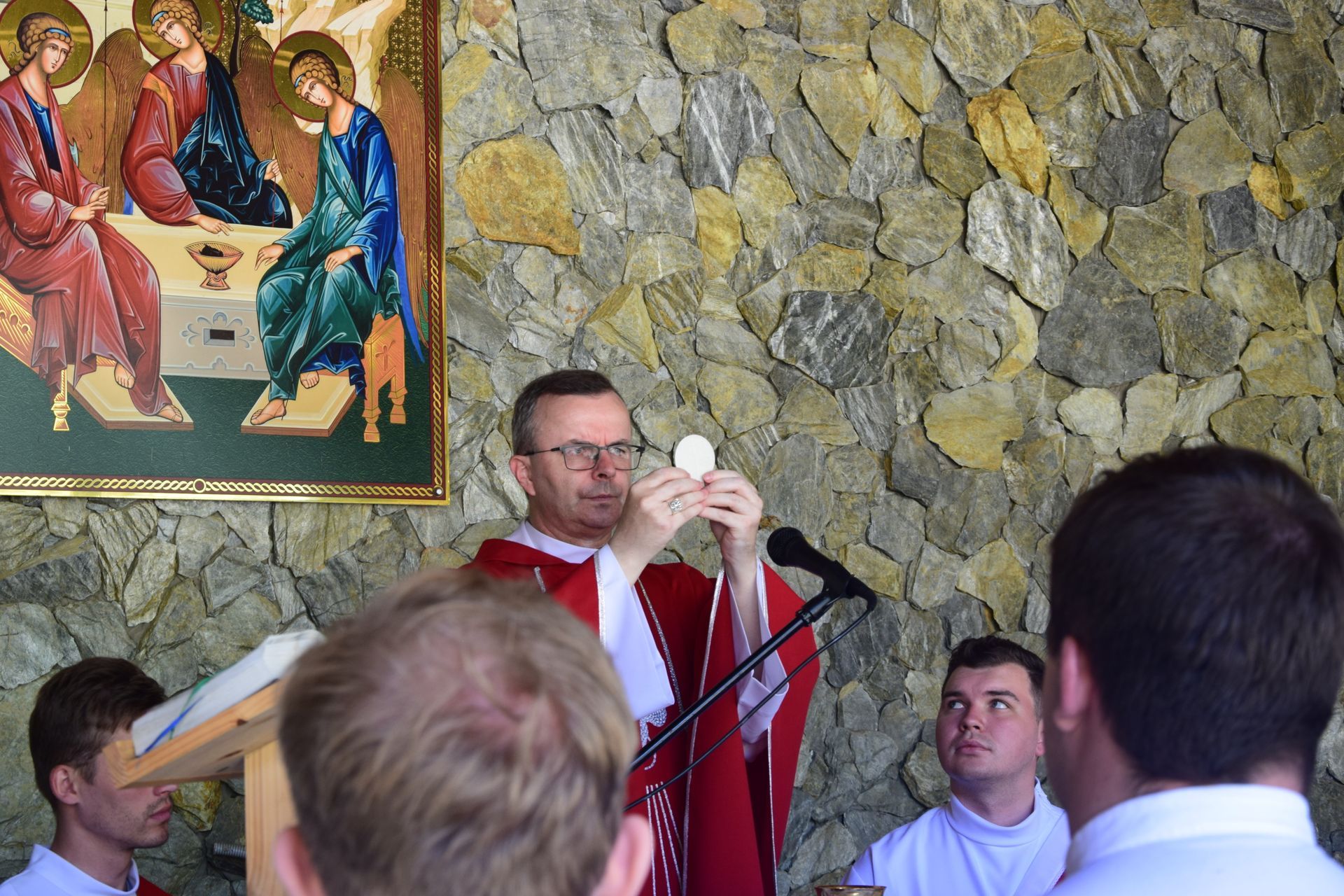Gdy już dotarliśmy na miejsce docelowe, a więc na Górę Krzyża Jubileuszowego, chwilę odpoczęliśmy po czym wspólnie przeżyliśmy dziękczynną Eucharystię pod przewodnictwem bp. Damiana Bryla. Homilię podczas niej wygłosił do nas ks. Marcin Wiśniewski. Zawarł on podczas niej kilka ważnych myśli: