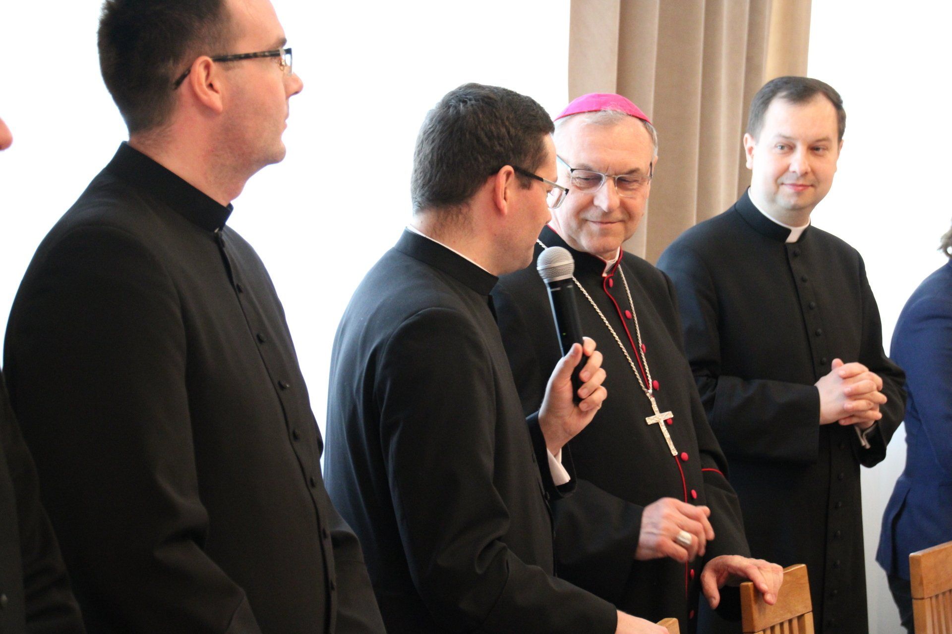 17 grudnia, w środę mieliśmy okazję przeżywać w naszej wspólnocie wigilię seminaryjną. Na początku zeszliśmy się wspólnie do auli seminaryjnej, aby razem z pasterzami naszych diecezji, przełożonymi, klerykami, pracownikami naszego seminarium oraz zaproszonymi gośćmi obejrzeć sztukę przygotowaną dla nas przez braci z kursu IV, pt. "Niczego nie będzie". Spektakl mówił o seminaryjnej rzeczywistości przygotowywania się do świąt Bożego Narodzenia oraz o naszej kruchości, która wtedy wychodzi na jaw. Mogliśmy ujrzeć całokształt formowania się jasełek, a więc po kolei były to: 1) Egzorta z księdzem prefektem, który informuje kleryków o takim obowiązku, który na nich spada 2) Scena wspólnej kawy w pokoju jednego z kleryków i burza mózgów o jasełkach 3) Pierwsza próba, która się kompletnie nie układa 4) Pierwsza scena odgrywana w nocy o szukaniu sensu przedstawienia 5) Wieszanie dekoracji, podczas której wywiązuje się ogromna kłótnia między klerykami 6) Druga scena odgrywana w nocy o głębokich przemyśleniach i refleksjach, gdzie powinniśmy tego sensu i głębi jasełek szukać 7) Dzień przedstawienia, podczas którego nic nie wychodzi, każdy jest już przemęczony i klerycy mają dość siebie nawzajem, lecz w momencie największego załamania zaczynają widzieć cel tych jasełek - że Bóg ma się narodzić w naszym sercu, nawet jeśli jest ono tak kruche jak rzeczywistość przedstawiona na jasełkach Po odegranych jasełkach i życzeniach złożonych przez seniora kursu IV, który przygotowywał jasełka głos zabrał JE abp metropolita poznański Zbigniew Zieliński. Podczas swojego przemówienia, podziękował on za odegrany spektakl z głębokim przesłaniem, a także osobiście złożył życzenia wszystkim zebranym na auli seminaryjnej. Po odczytaniu fragmentu Ewangelii przez dk. Dominika Grolewskiego, wszyscy połamaliśmy się opłatkiem i złożyliśmy sobie życzenia, a gdy już wszyscy byli gotowi, zeszliśmy na nasz seminaryjny refektarz, aby przejść do kolejnego etapu świętowania wigilii w naszej wspólnocie, a więc spożywania wieczerzy wigilijnej przy wspólnym stole. Podczas wieczerzy mieliśmy okazję wspólnie zaśpiewać kolędy oraz usłyszeć przemówienia naszych pasterzy, zakończone życzeniami oraz błogosławieństwem. Dziękujemy wszystkim, którzy przybyli do naszego domu, aby świętować ten radosny i uroczysty dzień w naszej wspólnocie seminaryjnej. Zdjęcia za: Arcybiskupie Seminarium Duchowne w Poznaniu.