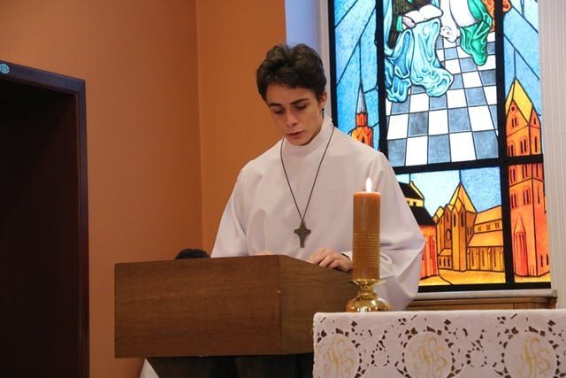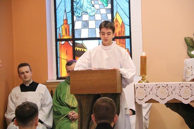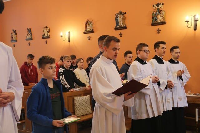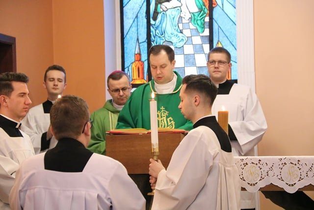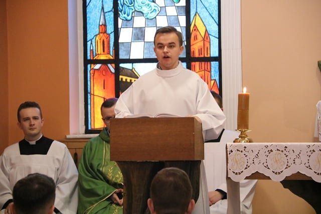 26 października w XXX Niedzielę Zwykłą mieliśmy okazję przeżywać bardzo ważny dzień dla braci z kursu III i Jakuba z kursu IV, którzy wobec Kościoła wyrazili swoją gotowość do przygotowania się do święceń diakonatu i prezbiteratu oraz kształtowania swojego życia w duchu wiernej służby Chrystusowi i Jego Kościołowi, a wypowiadając swoje "Chcę" zostali włączeni do grona kandydatów do święceń diakonatu i prezbiteratu. Zewnętrznym wyrazem ich gotowości są obłóczyny, czyli przyjęcie stroju duchownego, którym jest sutanna. W gronie 13 kleryków znalazło się 3 braci z diecezji kaliskiej - kl. Mikołaj, kl. Marcel oraz kl. Piotr. Dzisiejszą uroczystość rozpoczęliśmy poranną jutrznią, której przewodniczył ks. dr Jan Frąckowiak - rektor Arcybiskupiego Seminarium Duchownego w Poznaniu. Wygłosił także homilię, w której wytłumaczył jak ważna jest dzisiejsza decyzja braci przeżywających swoją kandydaturę i obłóczyny. Powiedział, że: Wasze "jestem", które dzisiaj wypowiecie ma być tym samym "jestem", które wypowiecie, gdy biskup wyśle was na pierwszą parafię i które będziecie wypowiadać przez całe swoje życie. Eucharystii, podczas której nasi bracia przyjęli kandydaturę i obłóczyny, przewodniczył JE bp Grzegorz Balcerek - biskup pomocniczy archidiecezji poznańskiej. Wraz z nim we wspólnej modlitwie towarzyszyli nam również księża moderatorzy oraz księża proboszczowie, rodziny i bliscy braci, których uroczystość obchodziliśmy. Po zakończonej Eucharystii, na II piętrze miała miejsce nasza seminaryjna tradycja, którą jest "przyklepanie sutanny", a następnie wszyscy udaliśmy się na refektarz, aby wraz z braćmi z kursu III oraz Jakubem z kursu IV radować się tym ważnym dla nich dniem. Zdjęcia za: Arcybiskupie Seminarium Duchowne w Poznaniu