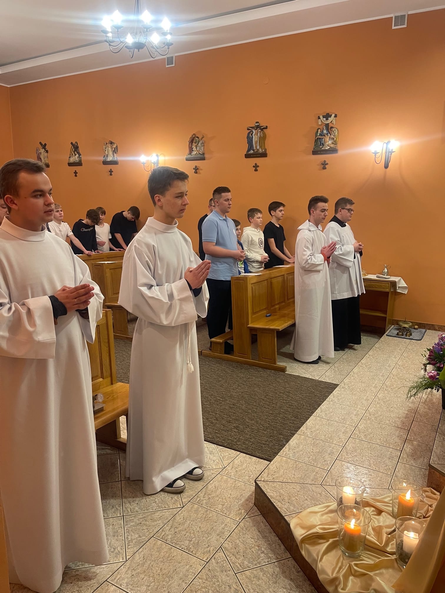W dniach 11-12 października mieliśmy okazję przebywać na terenie dekanatu raszkowskiego w ramach niedzieli powołań. Była to dla nas okazja, aby podzielić się z innymi świadectwem naszego powołania oraz porozmawiać o seminarium i nie tylko. Niedzielę powołań rozpoczęliśmy w sobotę o godzinie 17.00 podczas spotkania z ministrantami oraz młodzieżą w Starej Oborze przy parafii pw. Zwiastowania Pańskiego w Skrzebowej. W trakcie spotkania mogliśmy lepiej się poznać poprzez integrację i liturgię. Była okazja do wysłuchania świadectwa jednego z nas, obejrzenia przygotowanej scenki oraz posłuchania o seminarium - jak wygląda i czym jest. Po zakończeniu pierwszej części spotkania, przeszliśmy do kościoła, gdzie wspólnie modliliśmy się na Eucharystii. Mszy świętej przewodniczył tamtejszy proboszcz - ks. Aleksander Piekielny, a homilię wygłosił ks. wicerektor Waldemar Graczyk. Po zakończonej modlitwie wróciliśmy do Starej Obory, gdzie już czekał przygotowany dla nas grill. Była to świetna okazja do różnego rodzaju rozmów i opowiedzenia, jak nam się żyje w seminarium. Na następny dzień nasi bracia udali się parafii dekanatu raszkowskiego, aby wygłaszać swoje świadectwa powołań: 1. Parafia Niepokalanego Serca Maryi , Roszki 2. Parafia Podwyższenia Krzyża Świętego , Raszków 3. Parafia Zwiastowania Pańskiego , Skrzebowa 4. Parafia św. Katarzyny Aleksandryjskiej , Pogrzybów 5. Parafia św. Mateusza , Górzno 6. Parafia św. Michała Archanioła , Szczury 7. Parafia św. Wojciecha , Janków Zaleśny 8. Parafia św. Wojciecha , Lewków Dziękujemy wszystkim proboszczom z dekanatu raszkowskiego za tak miłe przyjęcie i ugoszczenie nas w swoich parafiach. Szczególnie podziękowania pragniemy przekazać ks. Aleksandrowi Piekielnemu oraz Kołu Gospodyń Wiejskich Moszczanka-Skrzebowa działającym przy parafii Skrzebowa za zorganizowanie spotkania dla ministrantów i młodzieży z całego dekanatu. Pragniemy również prosić o modlitwę w intencji tej niedzieli powołań, aby przyniosła dobre owoce w życiu ludzi, których na niej spotkaliśmy.