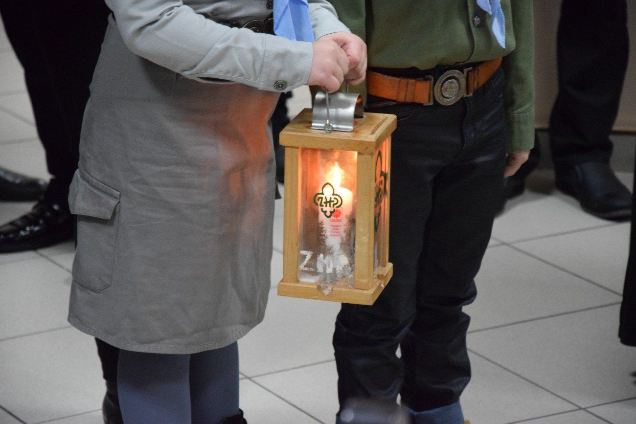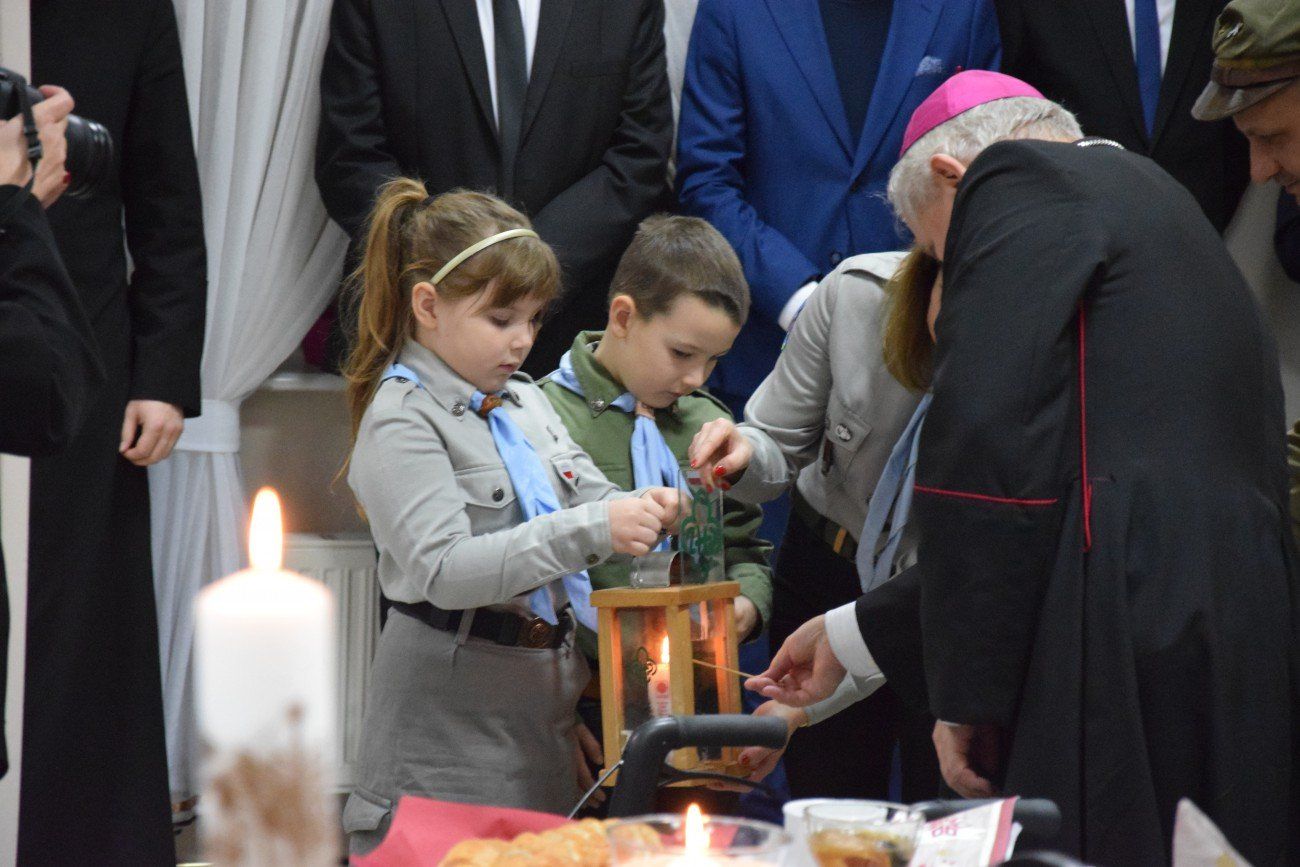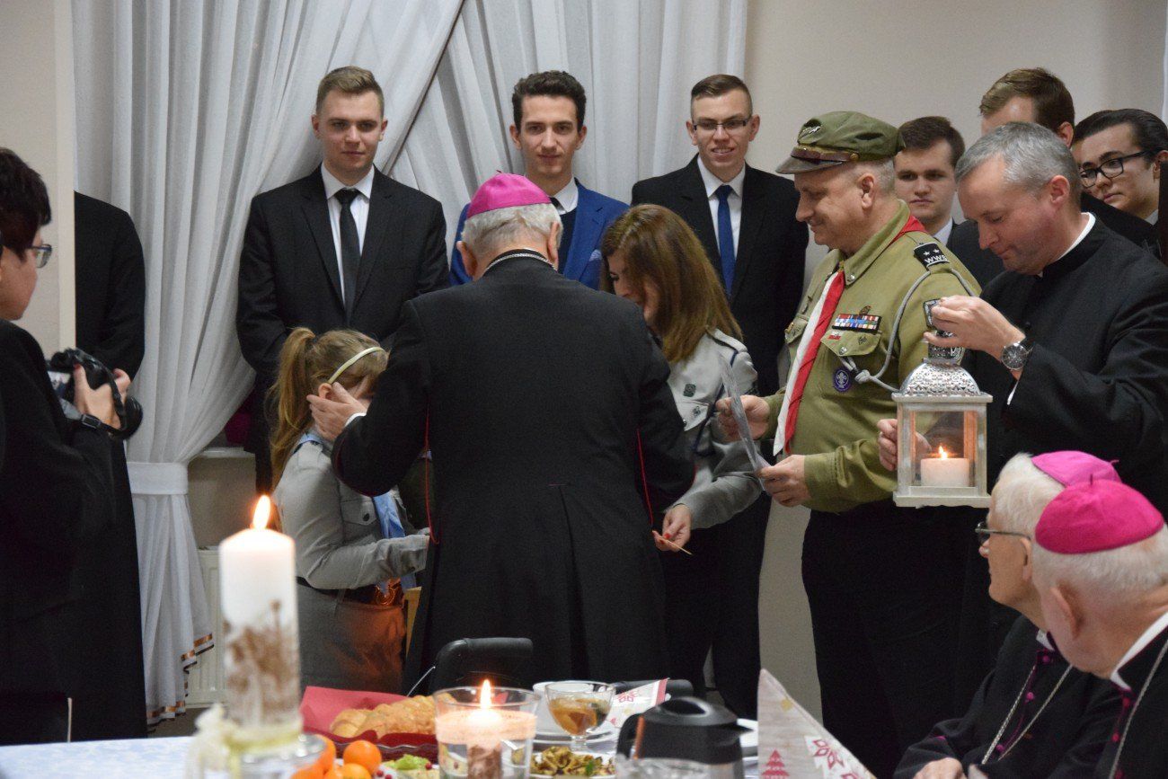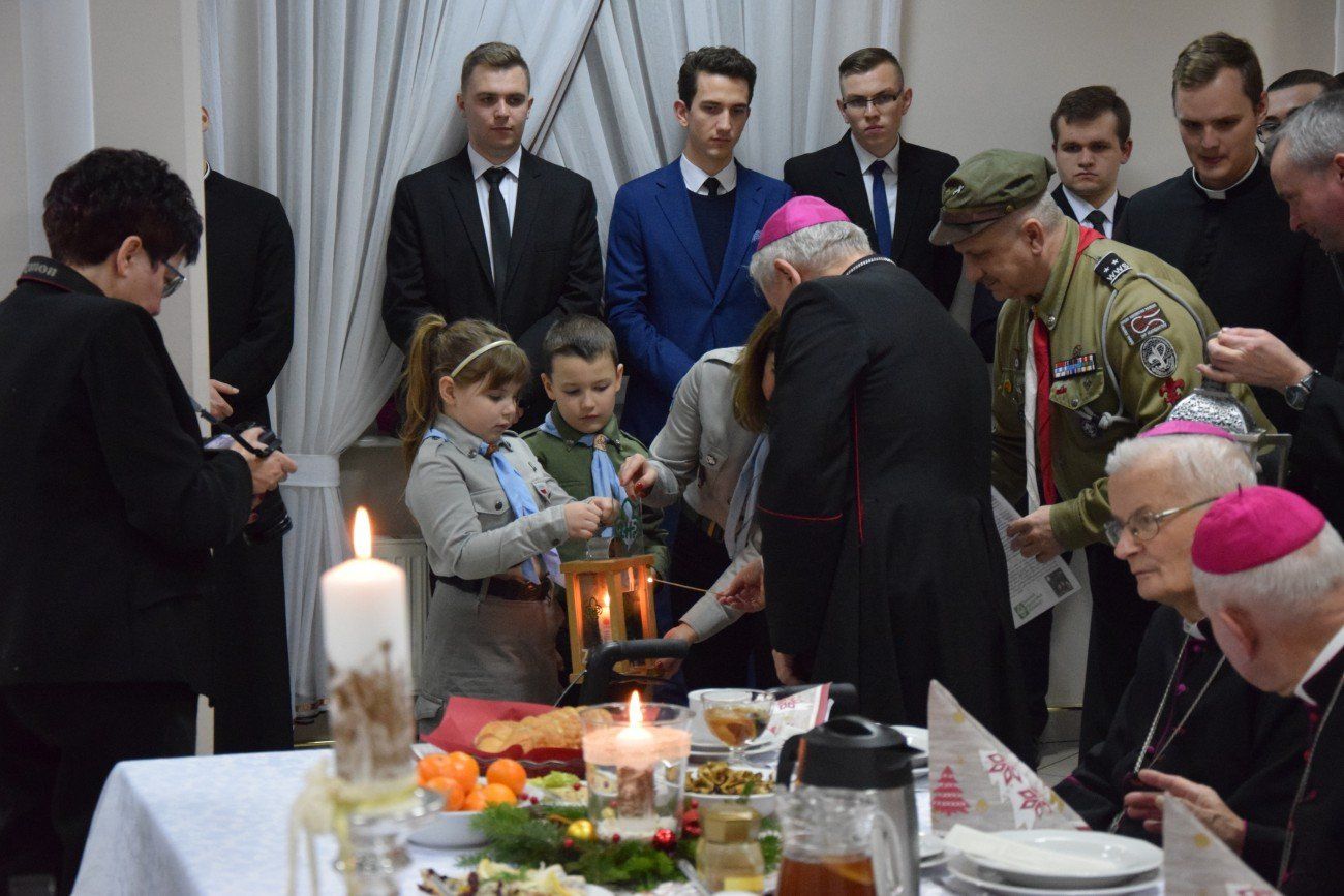 Podczas wieczerzy wigilijnej harcerze przekazali bp. Edwardowi Janiakowi Betlejemskie Światło Pokoju.