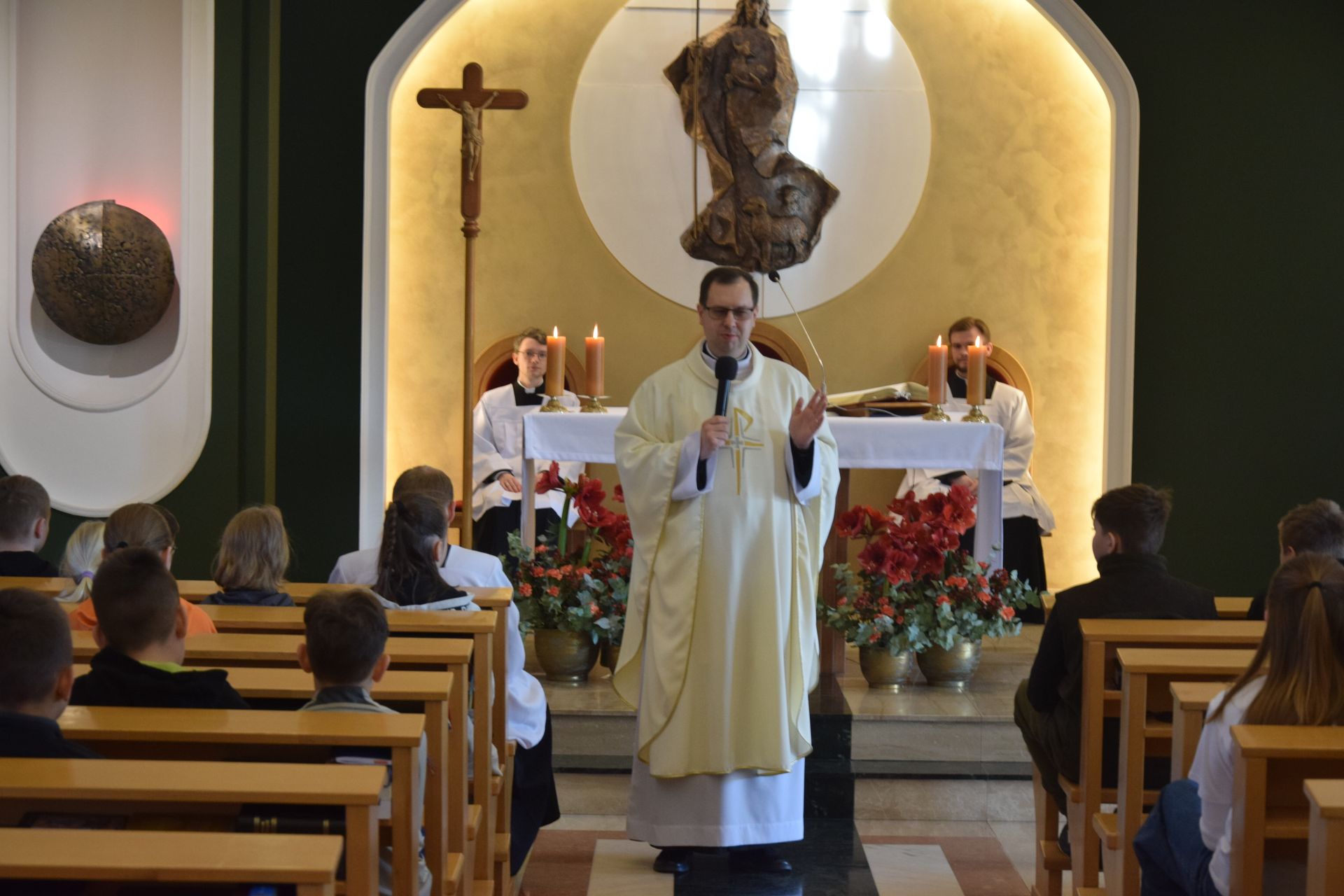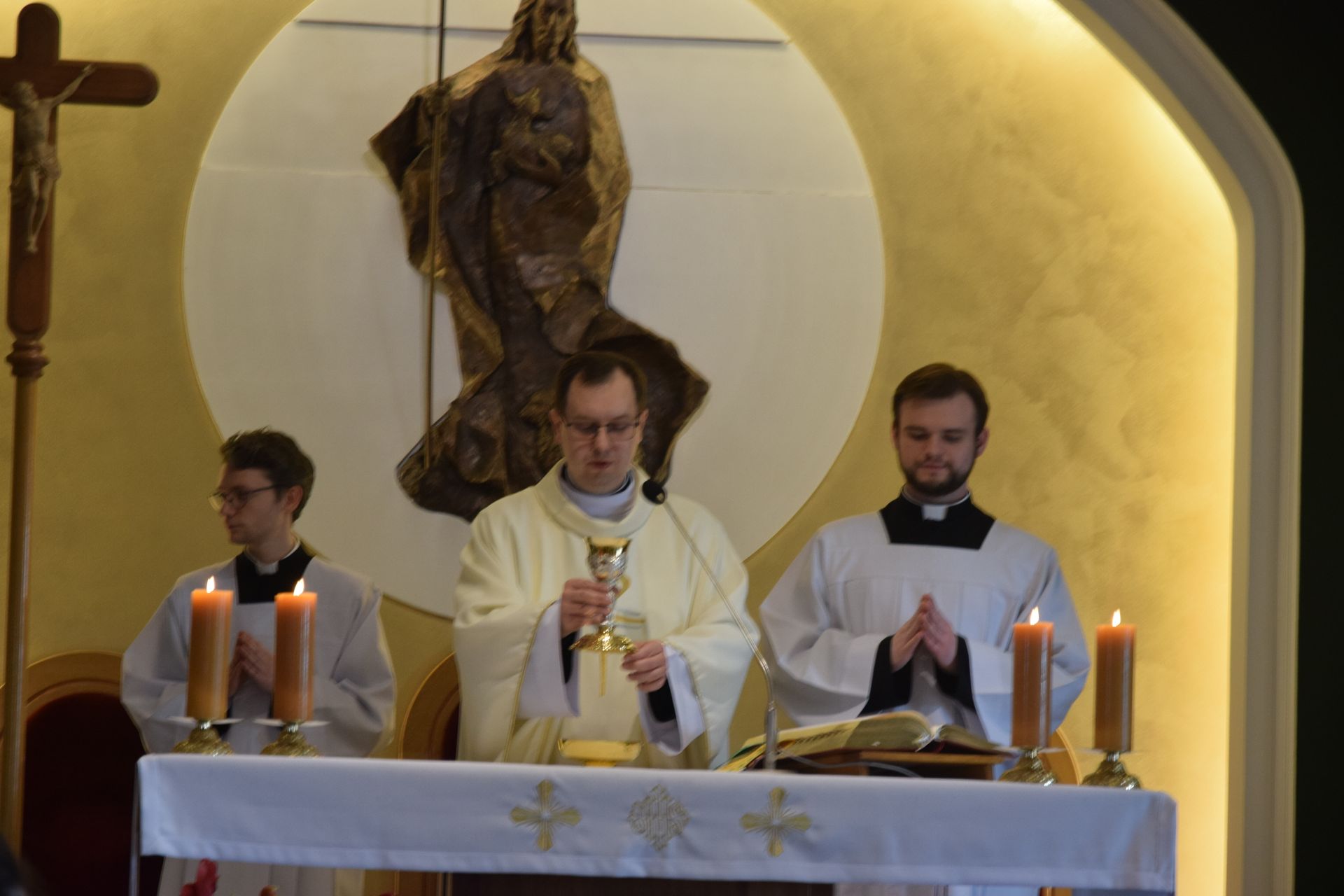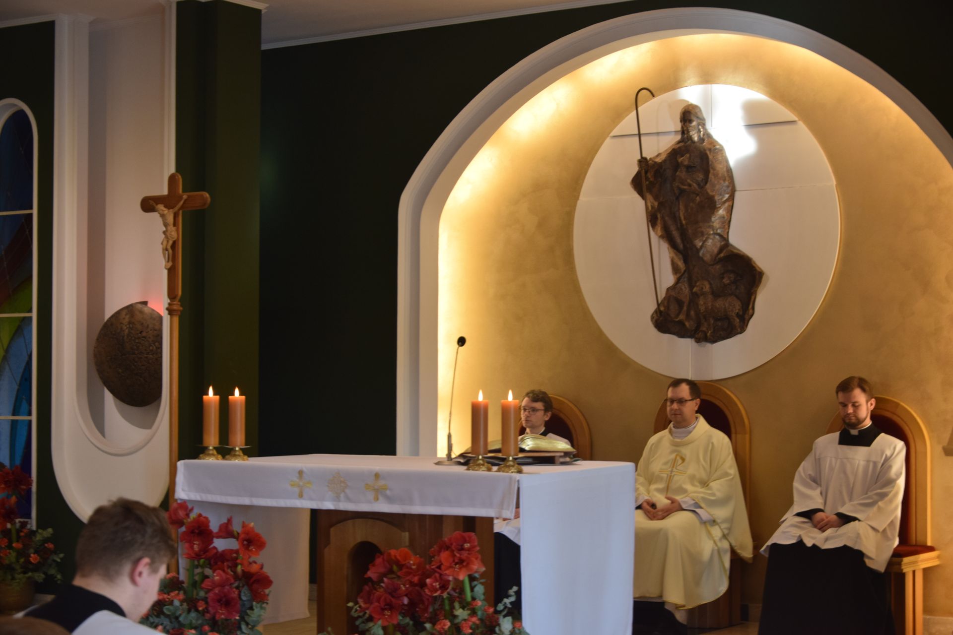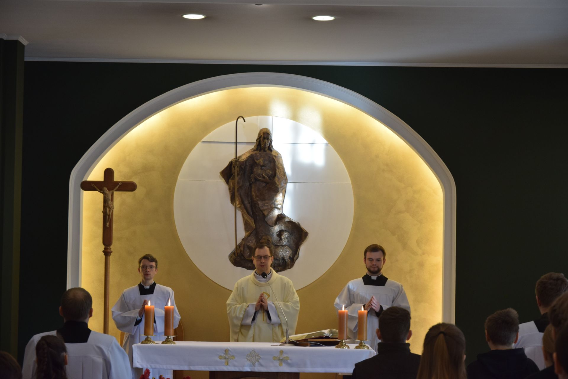 Nasze spotkanie rozpoczęliśmy od wspólnej Eucharystii w górnej kaplicy, której przewodniczył ks. wicerektor Waldemar Graczyk. Wygłosił on także do nas homilię, podczas której mogliśmy również usłyszeć kilka słów o dzisiejszym patronie - św. Janie Bosko, o którym opowiedział nam kl. Piotr.