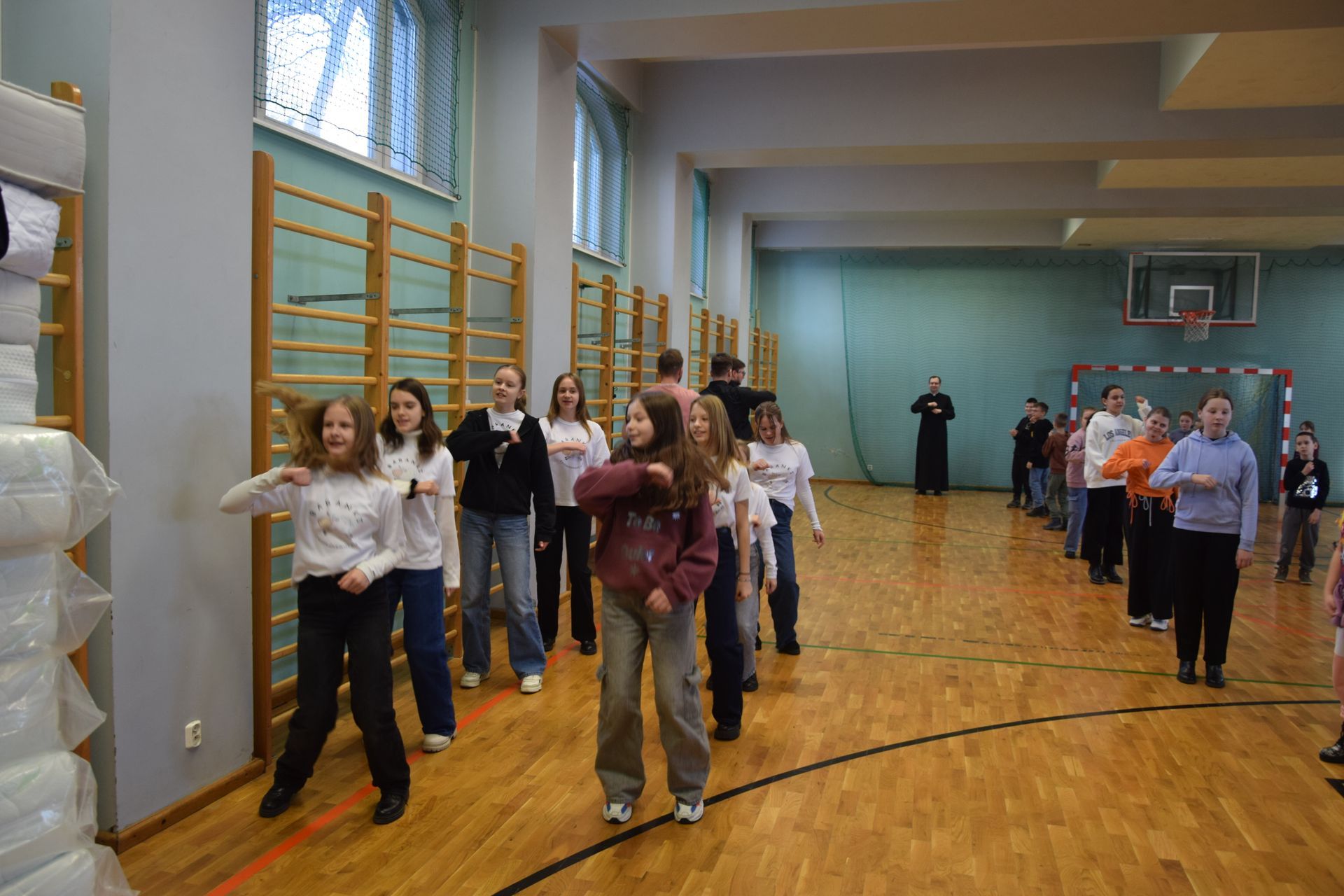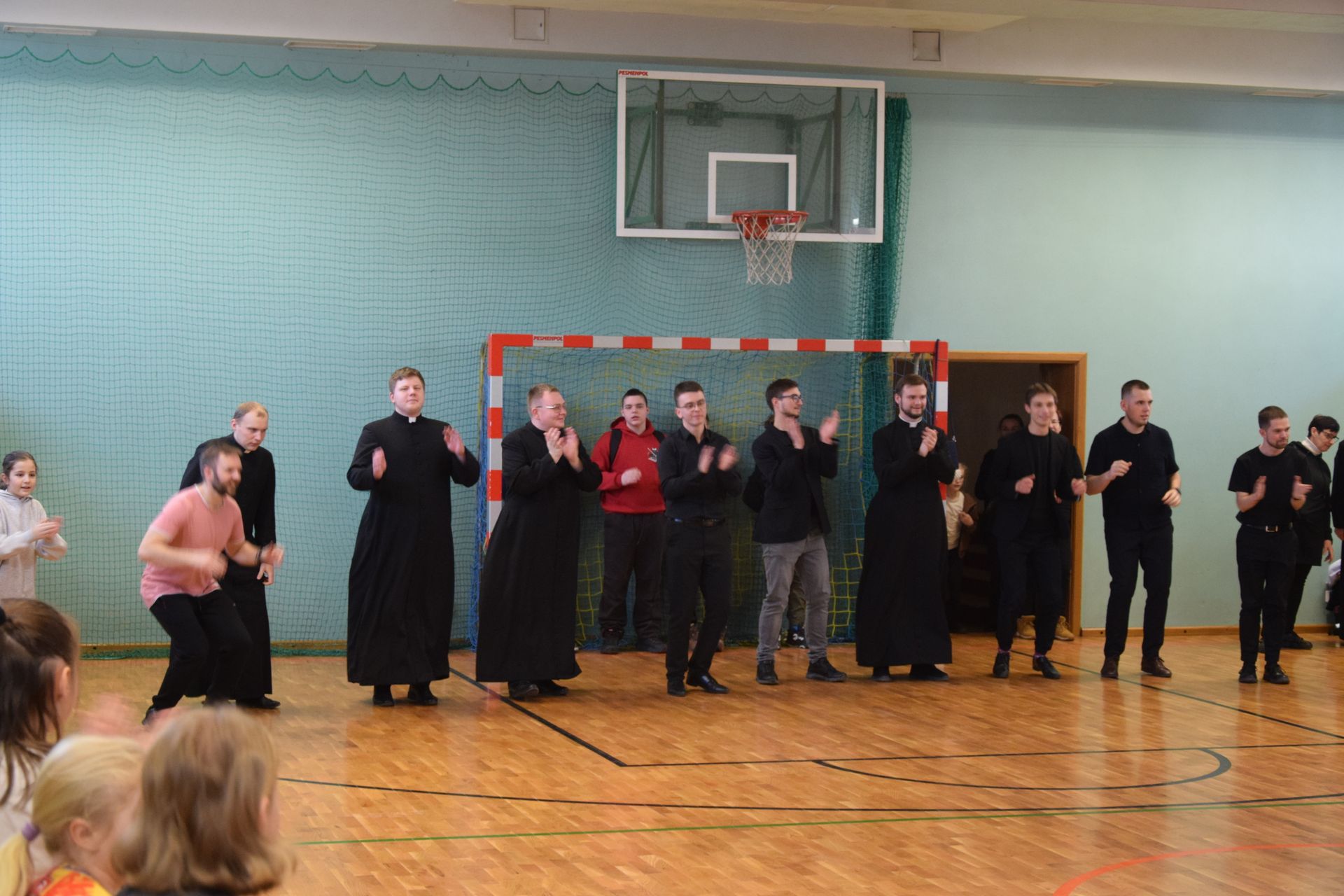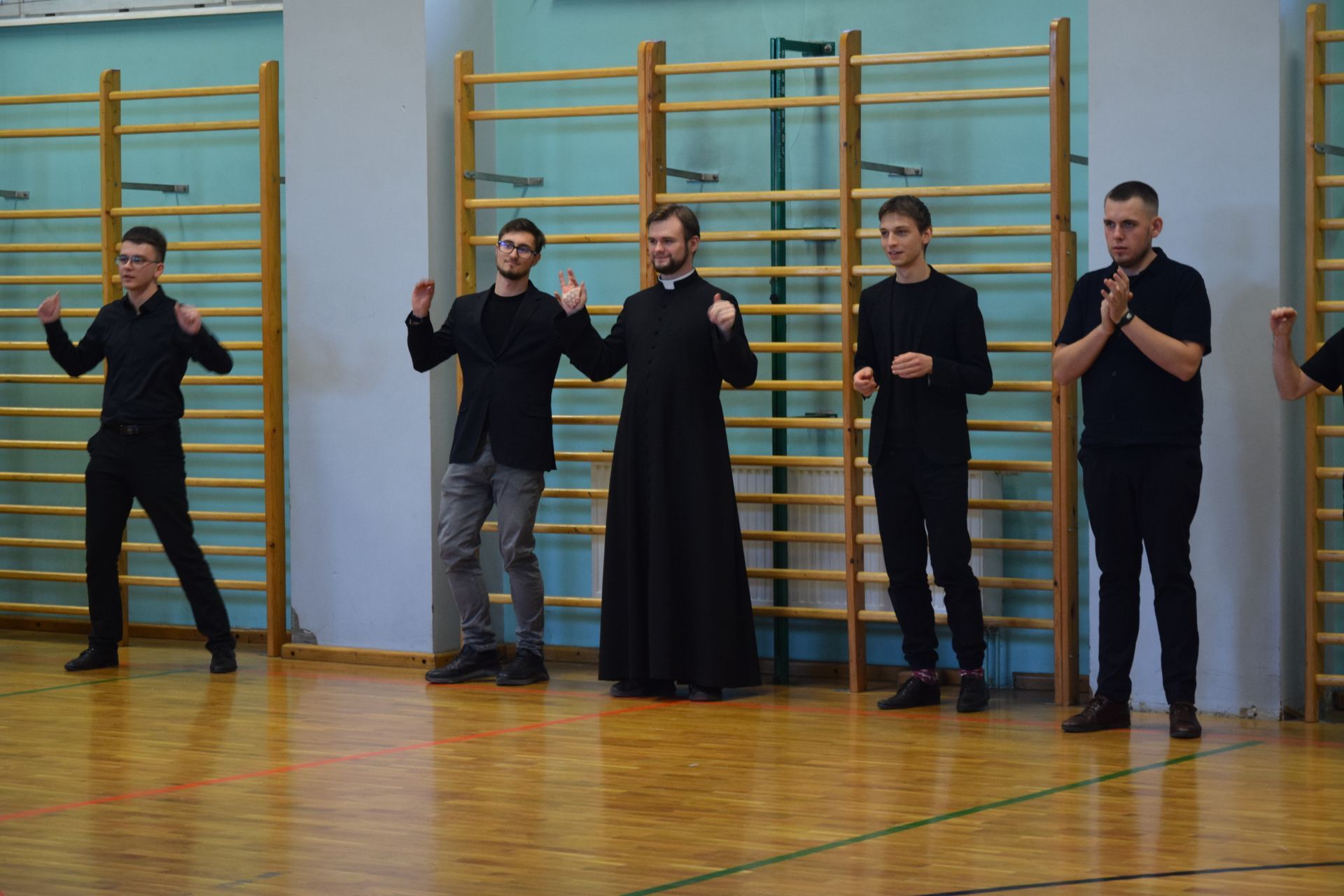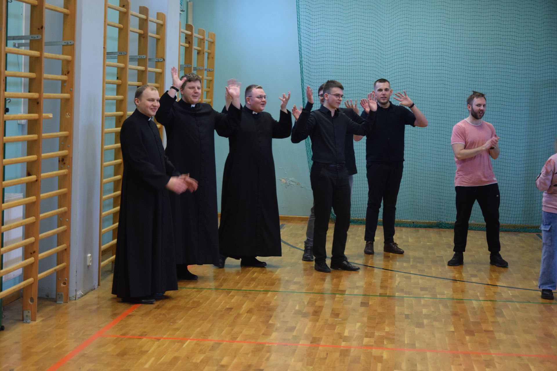 Po wspólnej modlitwie zeszliśmy do naszego seminaryjnego refektarza, aby się trochę posilić, po czym udaliśmy się razem na salę sportową, gdzie kl. Szymon, kl. Dawid oraz kl. Bartosz animowali i jednoczyli nas poprzez taniec.