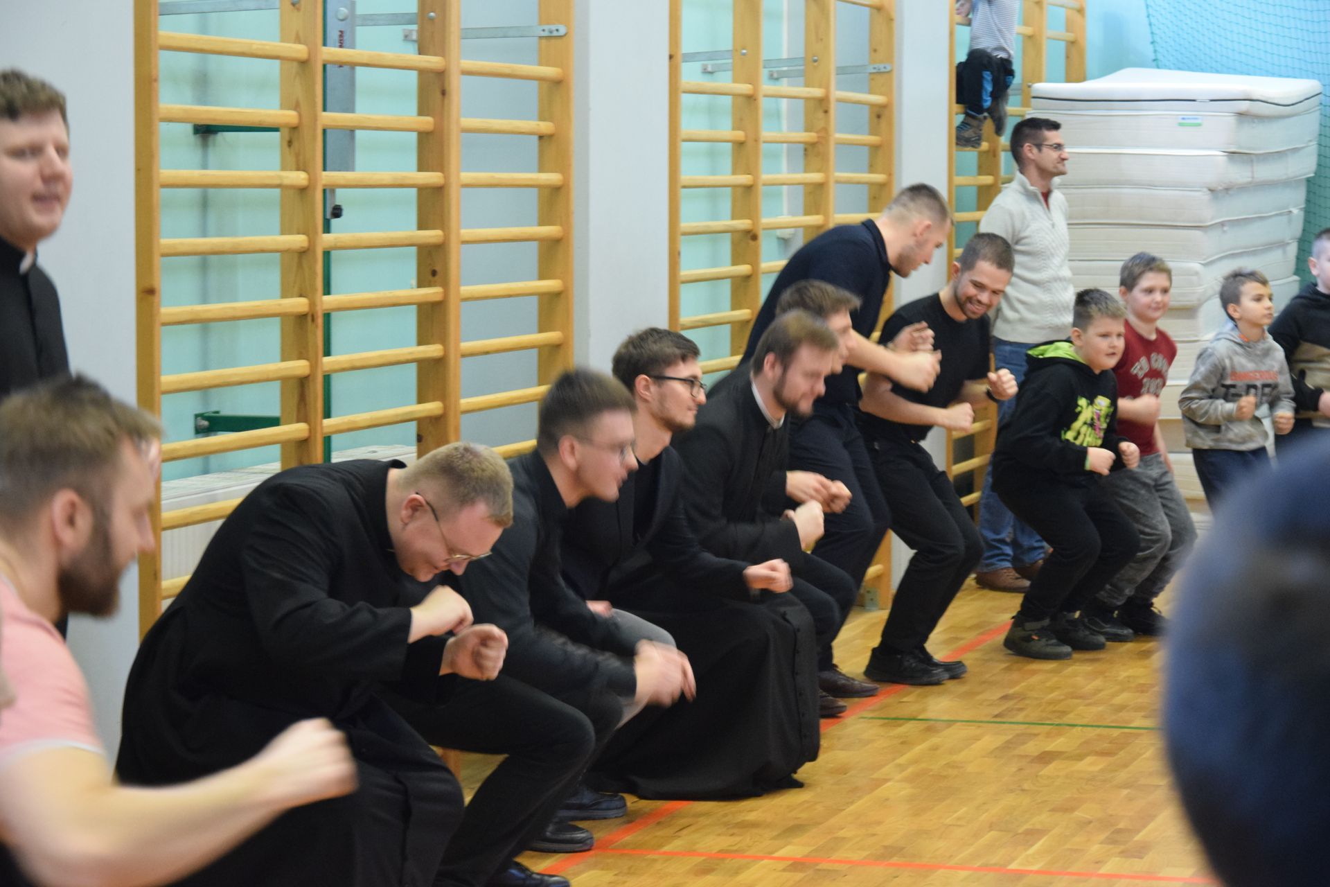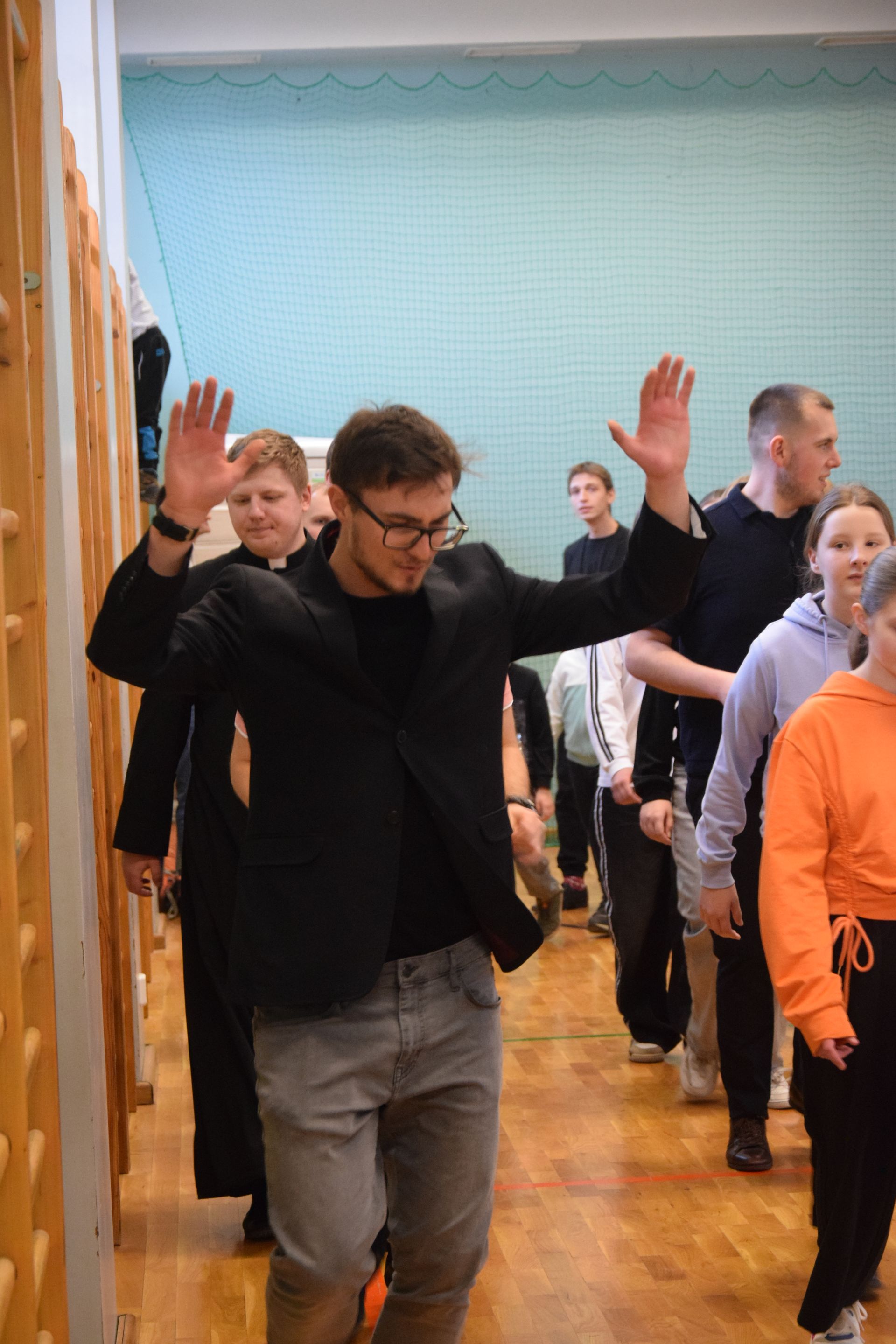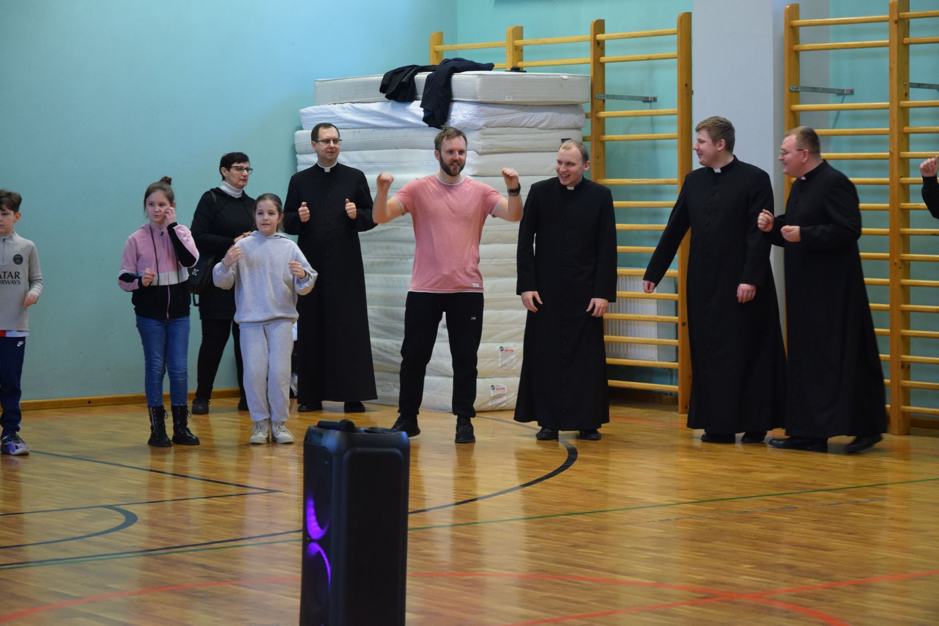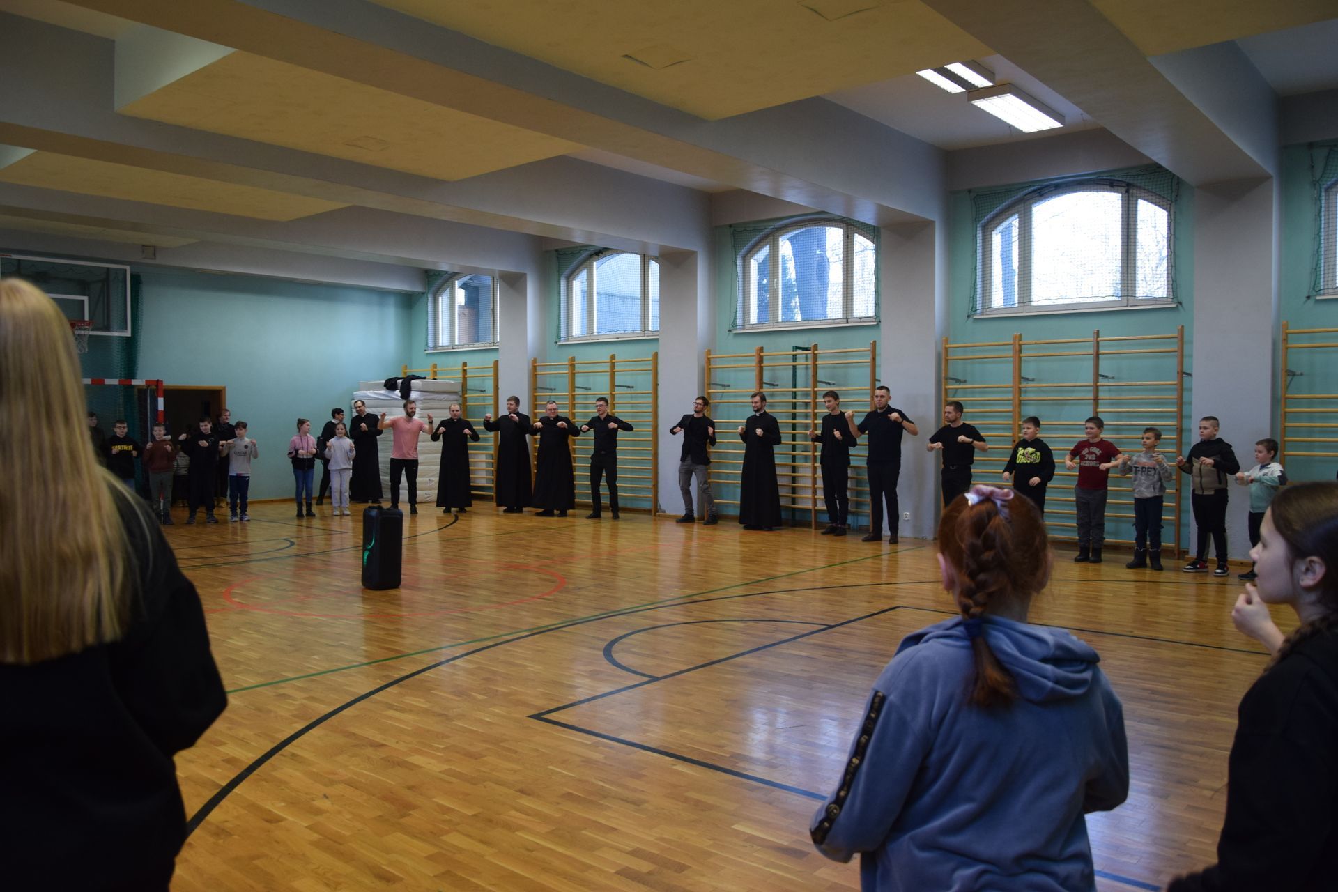 Po wspólnej modlitwie zeszliśmy do naszego seminaryjnego refektarza, aby się trochę posilić, po czym udaliśmy się razem na salę sportową, gdzie kl. Szymon, kl. Dawid oraz kl. Bartosz animowali i jednoczyli nas poprzez taniec.
