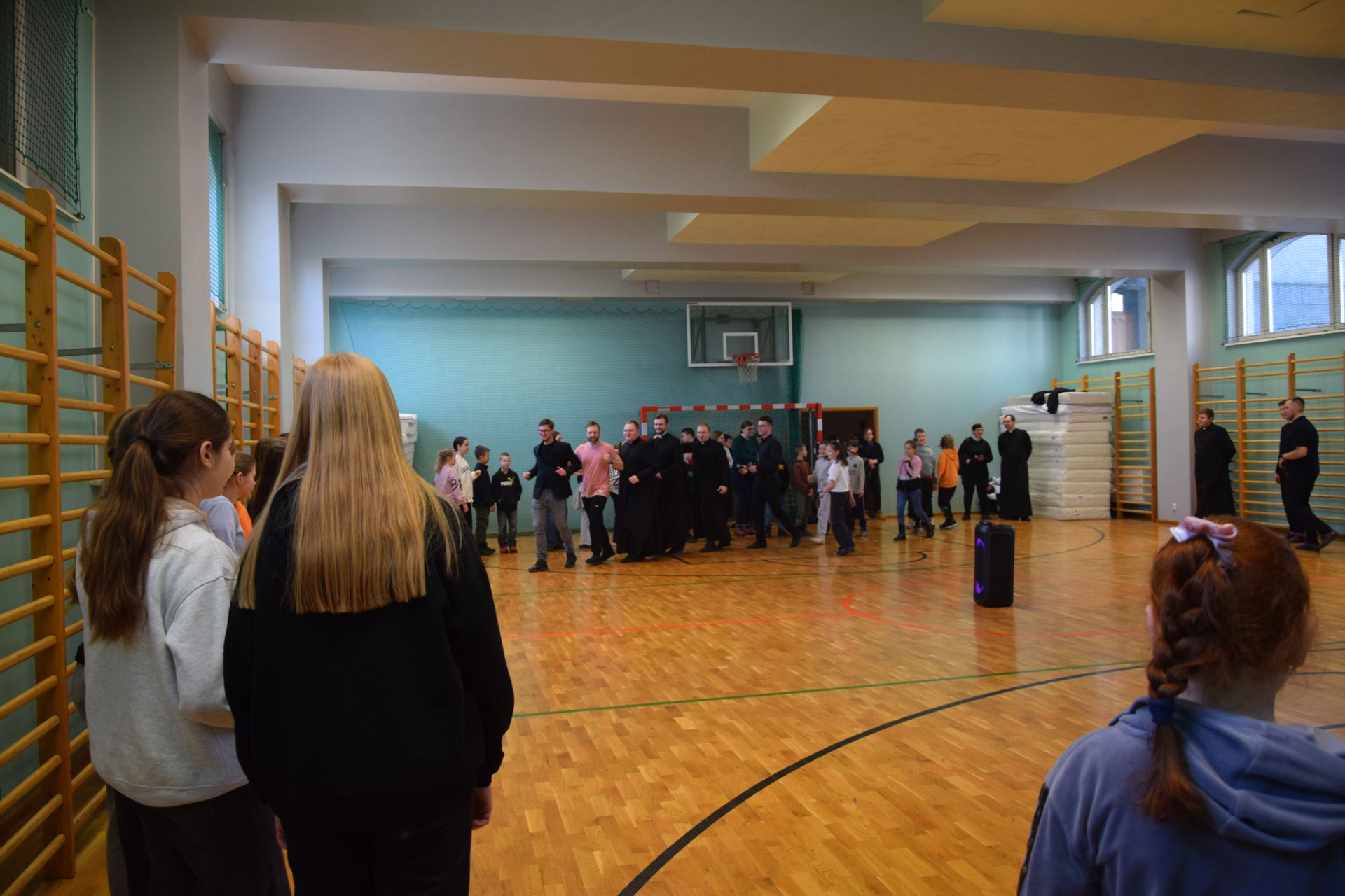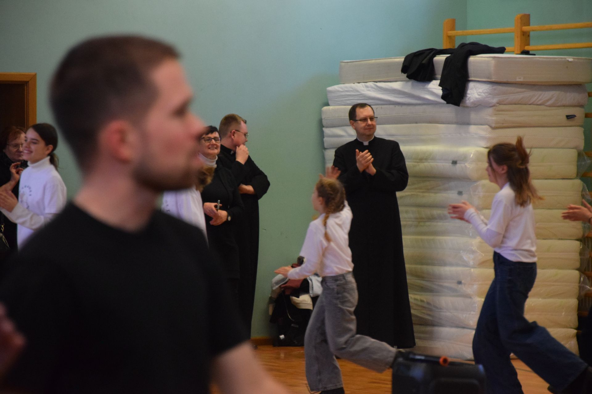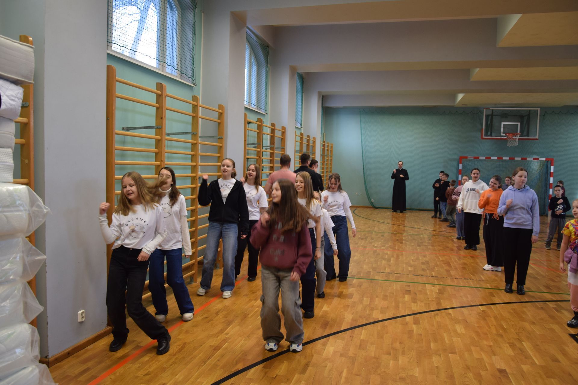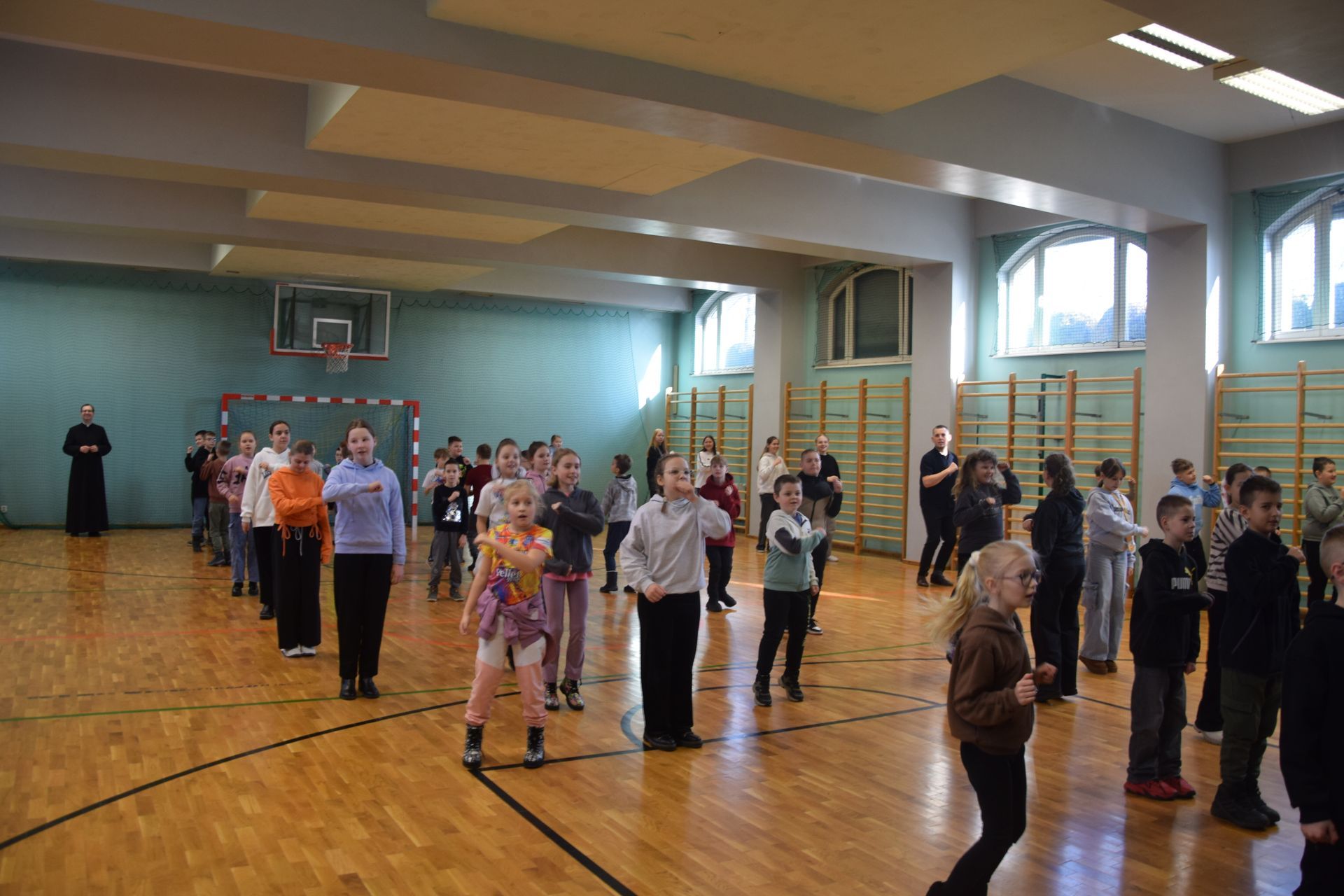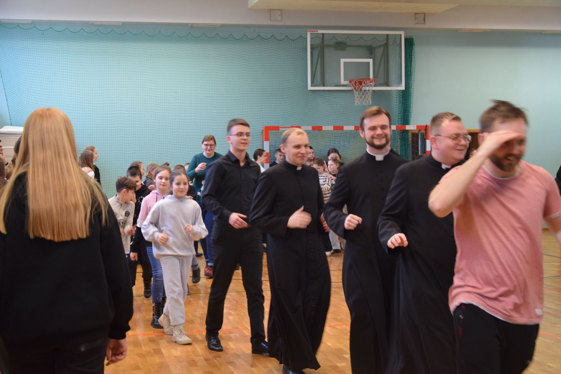 Po wspólnej modlitwie zeszliśmy do naszego seminaryjnego refektarza, aby się trochę posilić, po czym udaliśmy się razem na salę sportową, gdzie kl. Szymon, kl. Dawid oraz kl. Bartosz animowali i jednoczyli nas poprzez taniec.