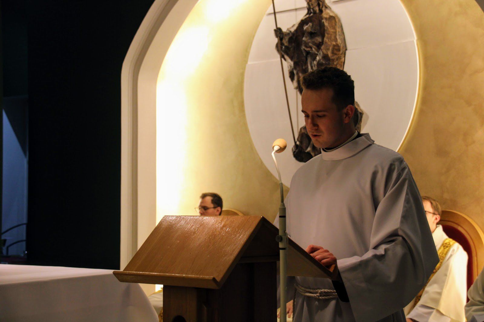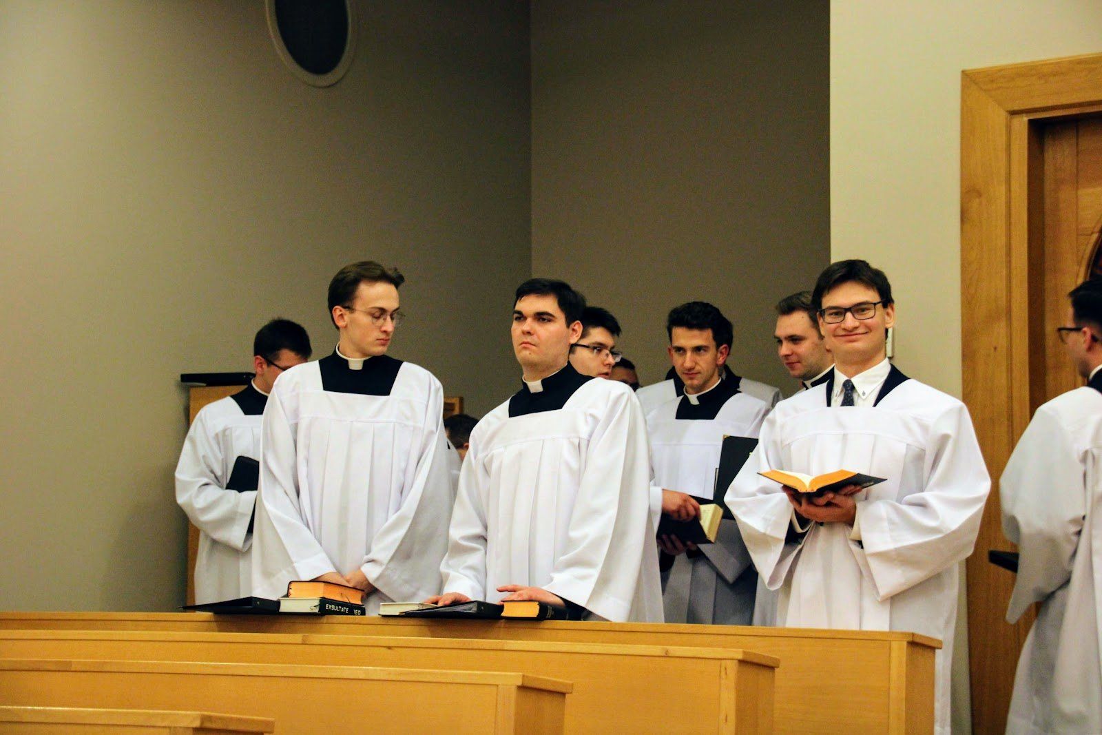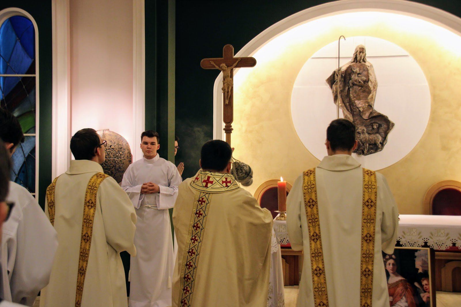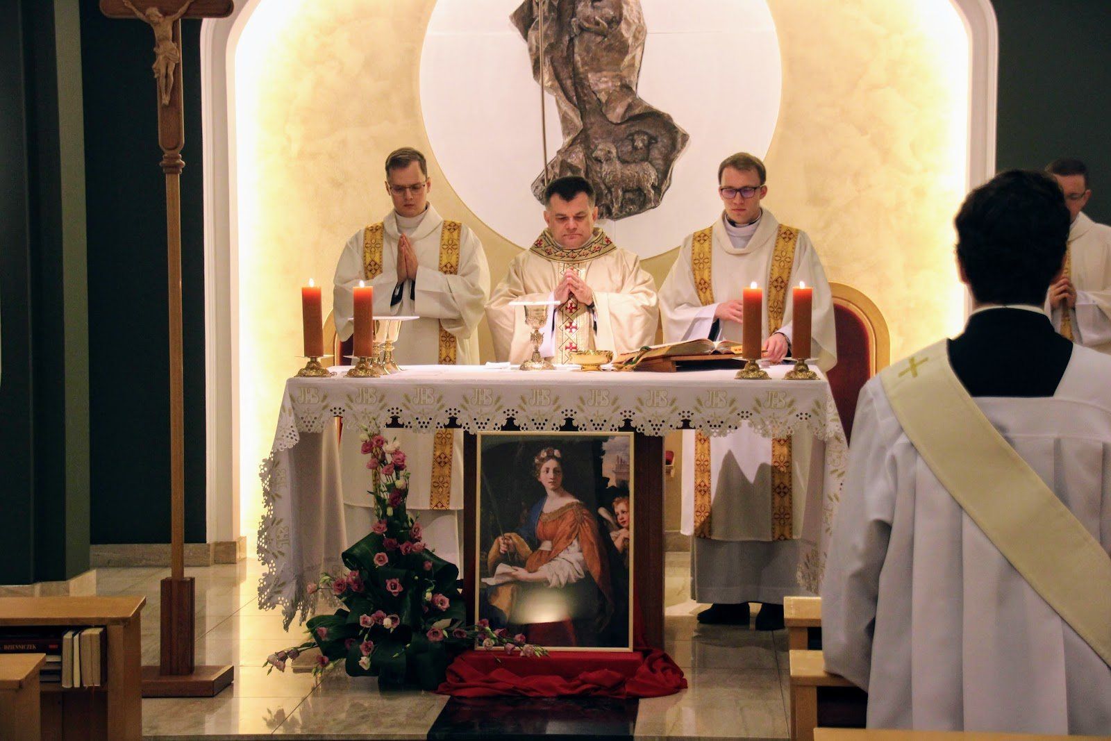 Sprawował On w naszej kaplicy Mszę św. po czym schola pod Jego dyrygenturą zaśpiewała nam znane i mniej znane pieśni. W tygodniu, w którym przypada wspomnienie św. Cecylii, dziewicy i męczennicy, tradycyjnie czwartkowym gościem był ksiądz doktor habilitowany Mariusz Białkowski. Naszego gościa nie trzeba było jednak nikomu przedstawiać, ponieważ od wielu już lat jest on wykładowcą na Wydziale Teologicznym UAM oraz w Seminarium – prowadzi zajęcia wspólnego śpiewu dla alumnów w środowe wieczory, a także pracuje z naszą seminaryjną scholą „Inclina aurem”. Przewodniczył on uroczystej Eucharystii w kaplicy pw. Chrystusa Dobrego Pasterza, na początku której ksiądz rektor Jan Frąckowiak przypomniał również wiele innych ważnych funkcji, jakie sprawuje ksiądz profesor – między innymi kierownika Zakładu Muzyki Kościelnej w Akademii Muzycznej im. Ignacego Jana Paderewskiego w Poznaniu. W swojej homilii ks. Mariusz przypomniał nam historię życia świętej Cecylii i jej trzydniowej agonii, mówił o świadectwie pierwszych chrześcijan, prześladowanych za wiarę w Boga, a nie w cesarza, zwracając także uwagę na możliwości dawania świadectwa o Chrystusie przez nas samych.