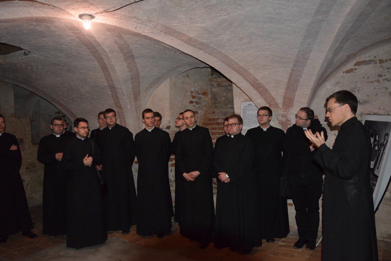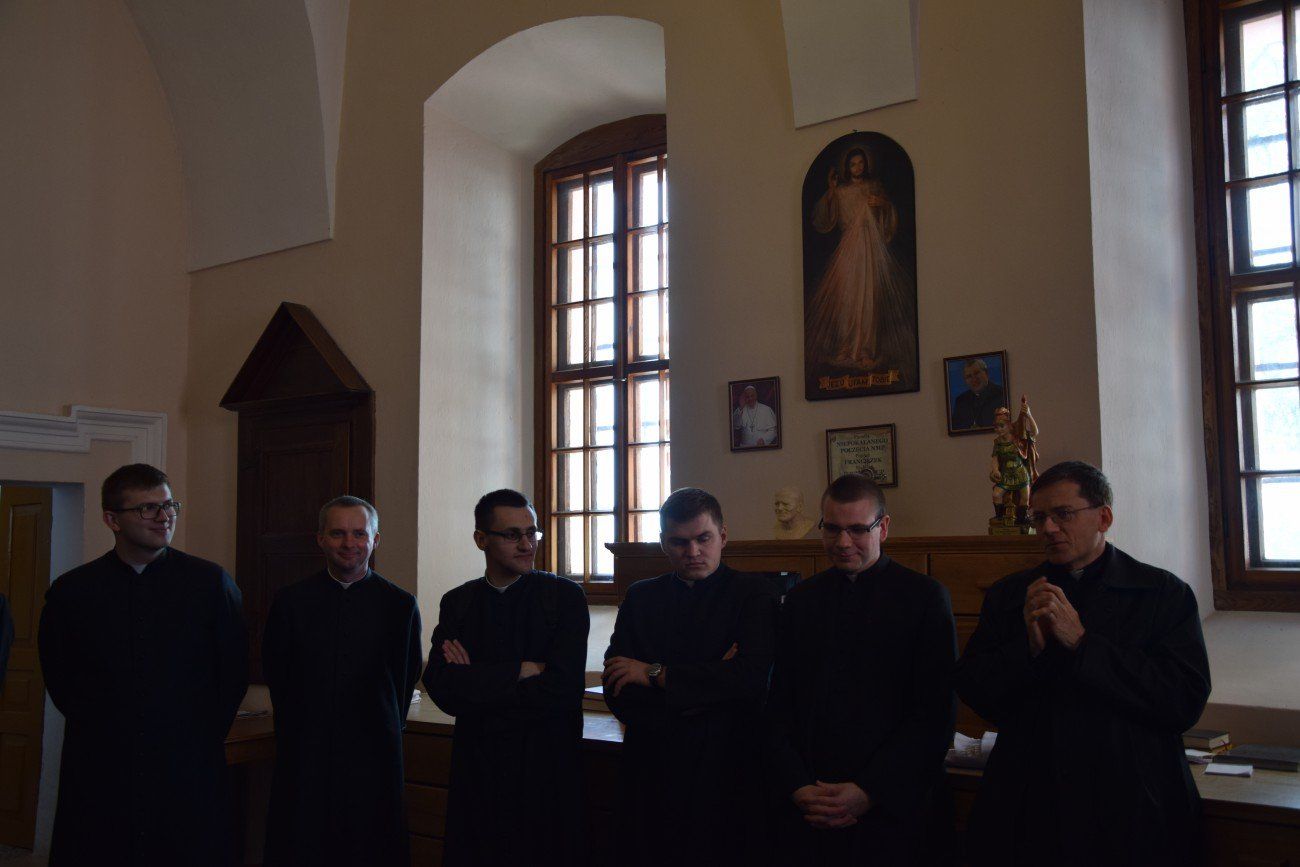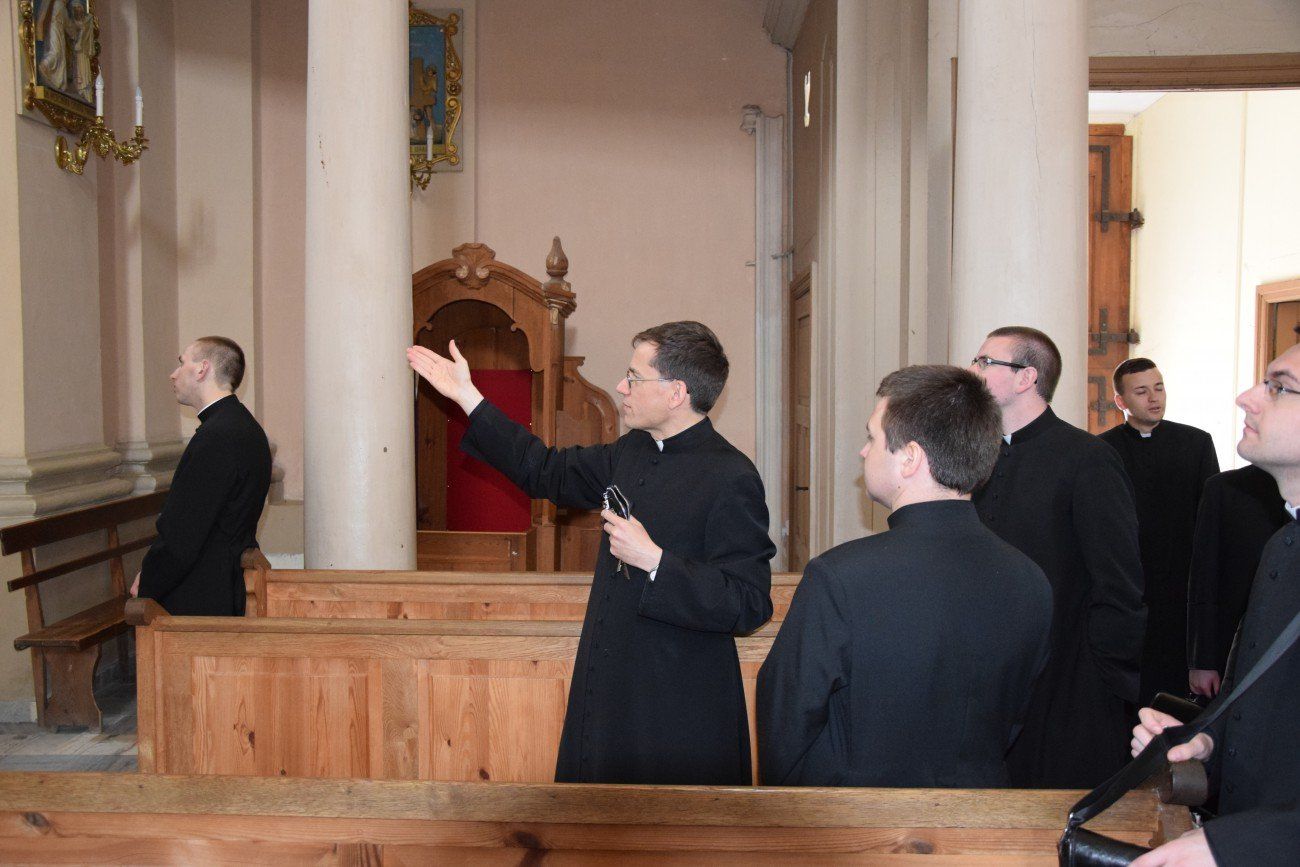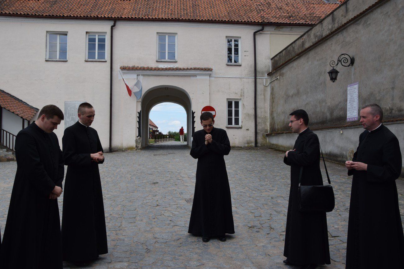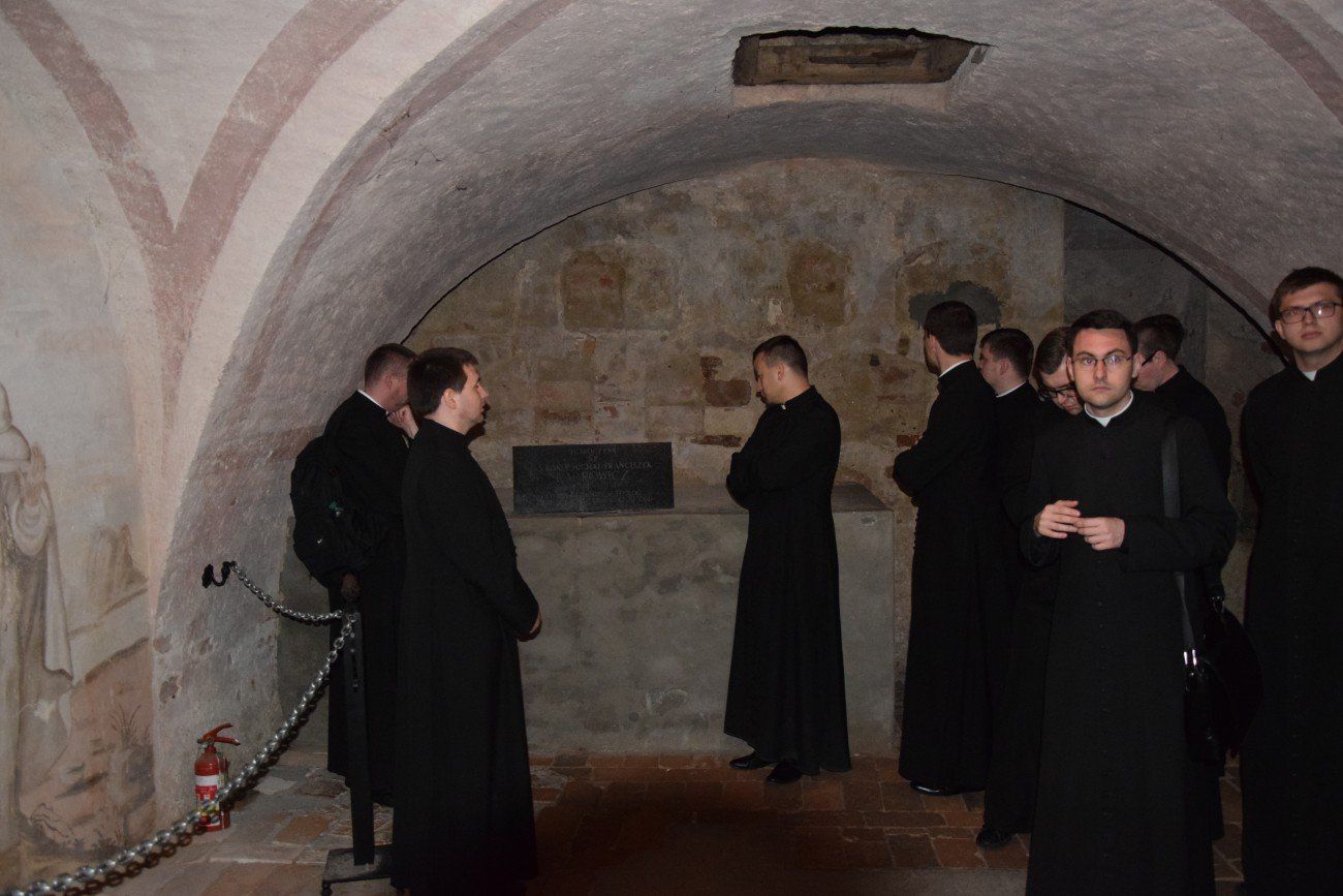 Pierwszego dnia, mimo zmęczenia, wszyscy klerycy wraz z ojcem duchownym wstali radośni i z niecierpliwością udali się do klasztoru pokamedulskiego położonego wśród malowniczego Jeziora Wigry, po którym oprowadził nas Ksiądz Jacek Stefański, który wcześniej wiele lat posługiwał w Wyższym Seminarium Duchownym w Kaliszu, pełniąc funkcję ojca duchownego. Cóż za wspaniała chwila, kiedy można spotkać kogoś, tak bardzo bliskiego naszym sercom, co było można poznać po serdecznych uśmiechach na twarzach. Po krótkim spotkaniu mieliśmy okazję przygotować się do Mszy Św., której przewodniczył ojciec Marcin Załężny. Ojciec Jacek Stefański, mimo, że nie mógł być w tym czasie na Mszy Św., to jednak przyszedł do nas po jej zakończeniu, aby opowiedzieć nam wiele o historii powstania Kościoła i w ogóle o historii tego malowniczego miejsca, które odwiedził nasz Wielki Polak – Jan Paweł II, ten cichy i pokorny człowiek, który naznaczył je swoją obecnością i świętością. Było to w roku 1999, od 8 do 10 czerwca, a mimo to pamięć o Nim jest żywa i rzeczywiście mogliśmy doświadczyć jej na sobie. Ksiądz Jacek opowiadał o wielkim wkładzie w rozwój najbliższej okolicy i trudzie, jaki włożyli na tym terenie Kameduli, aby szerzyć Królestwo Niebieskie łącząc to z rozwojem społeczeństwa. Wnętrze Kościoła jak i sam wystrój, ozdoby sakralne zostały dotkliwie zniszczone najpierw tuż przed I wojną światową a następnie podczas II wojny światowej w wyniku bombardowania wojsk rosyjskich. Ołtarz pierwotnie oddzielał prezbiterium od nawy głównej, w której modliło się 12 kamedułów. Następnie zeszliśmy do krypty, w której znajdowały się oryginalne malowidła i kości w zbiorowym grobie.